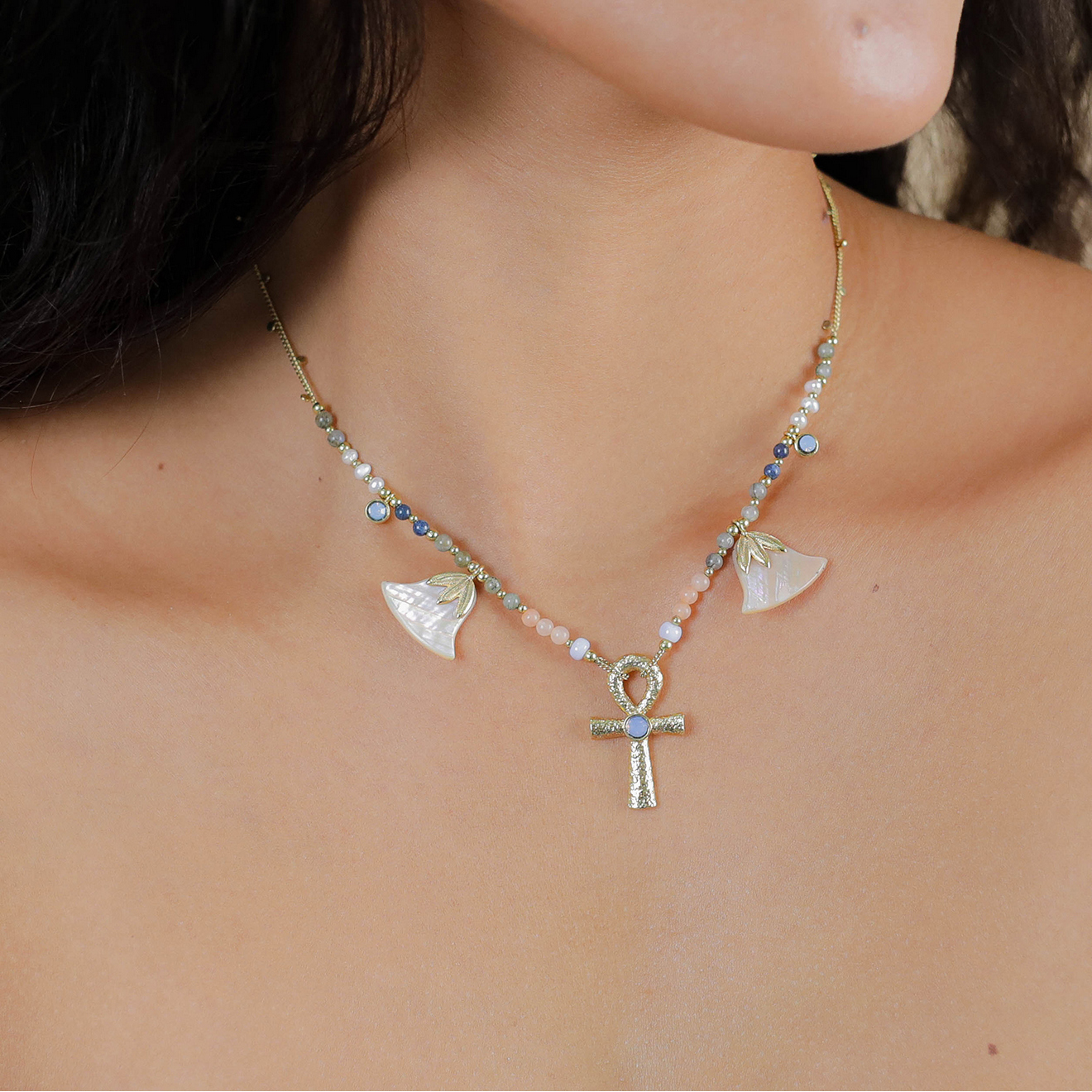 Колье Franck Herval, Palma, с перламутром, жемчугом, халцедоном, лазуритом, лунным камнем и лабрадор