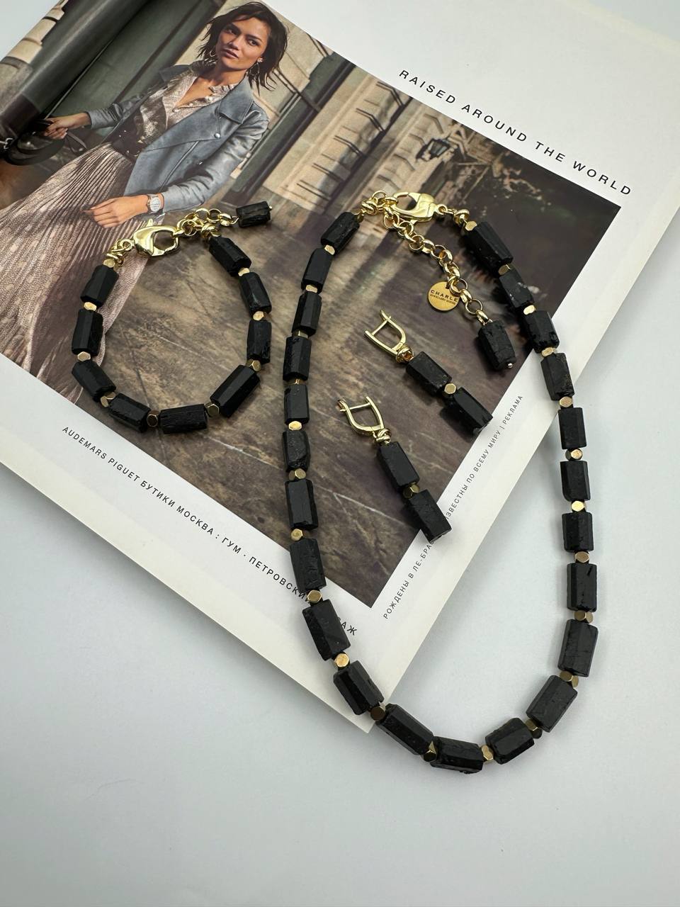 Браслет из черного турмалина и гематита, оттенок золото