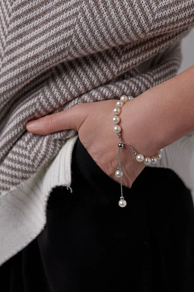 Браслет из молочного жемчуга 0,6 см на бегунке, оттенок серебро.