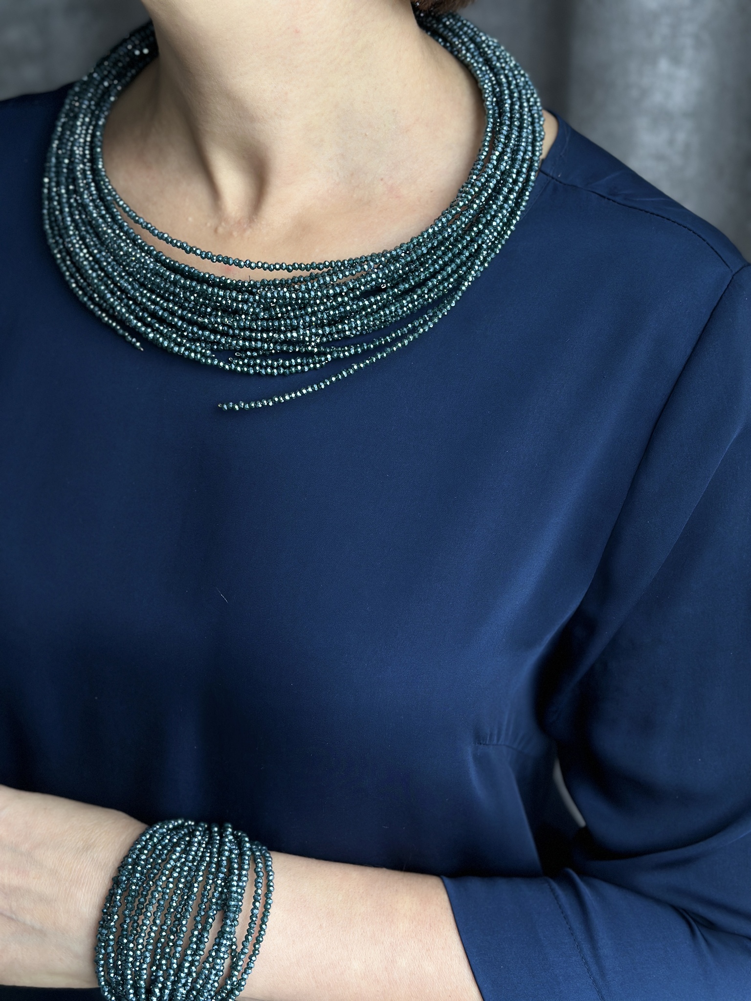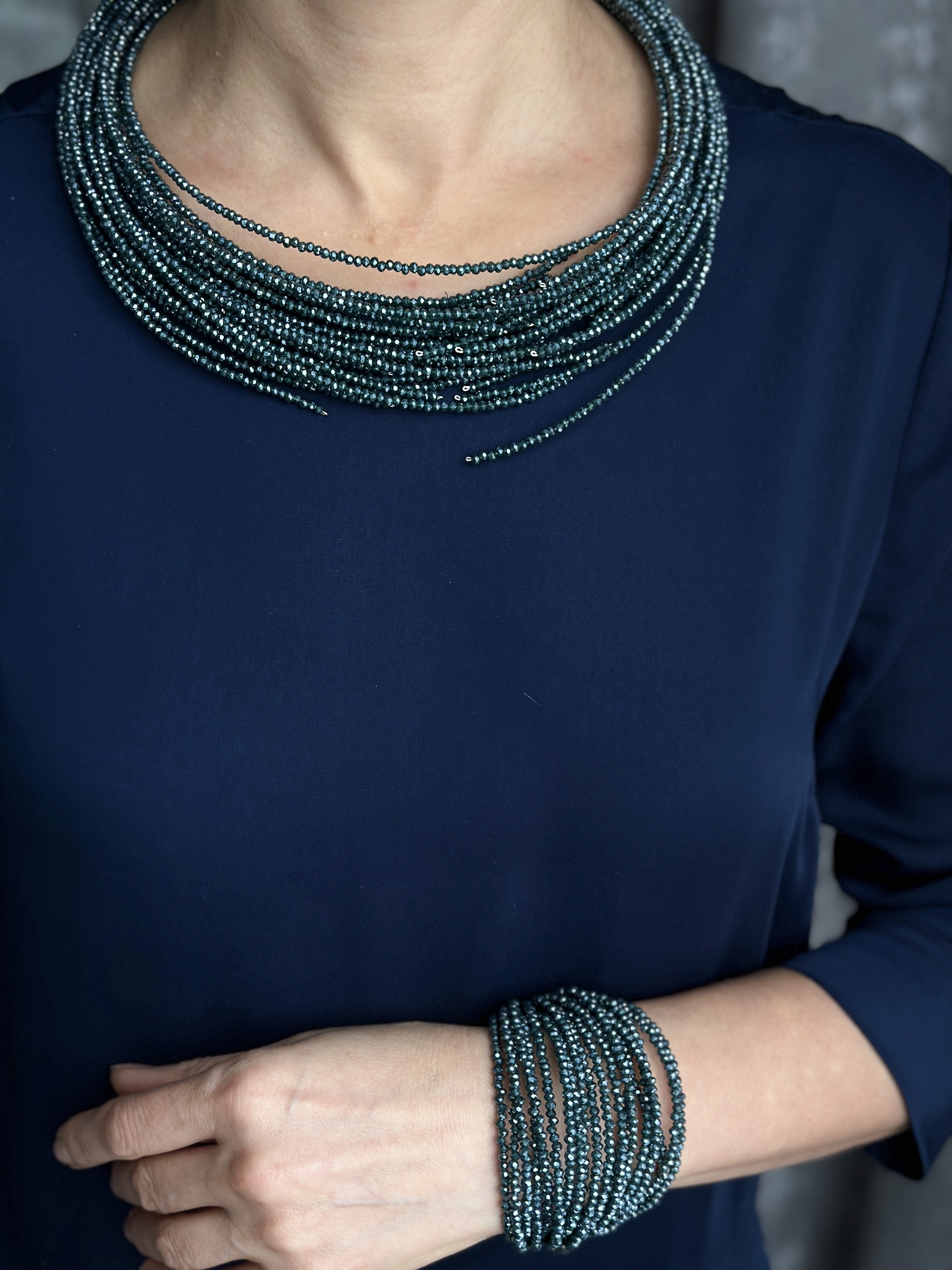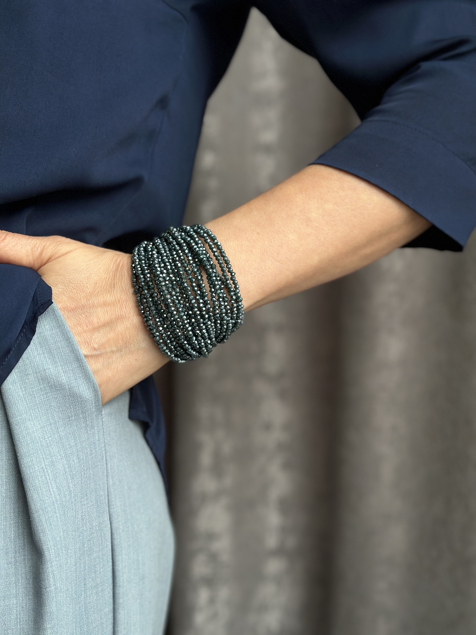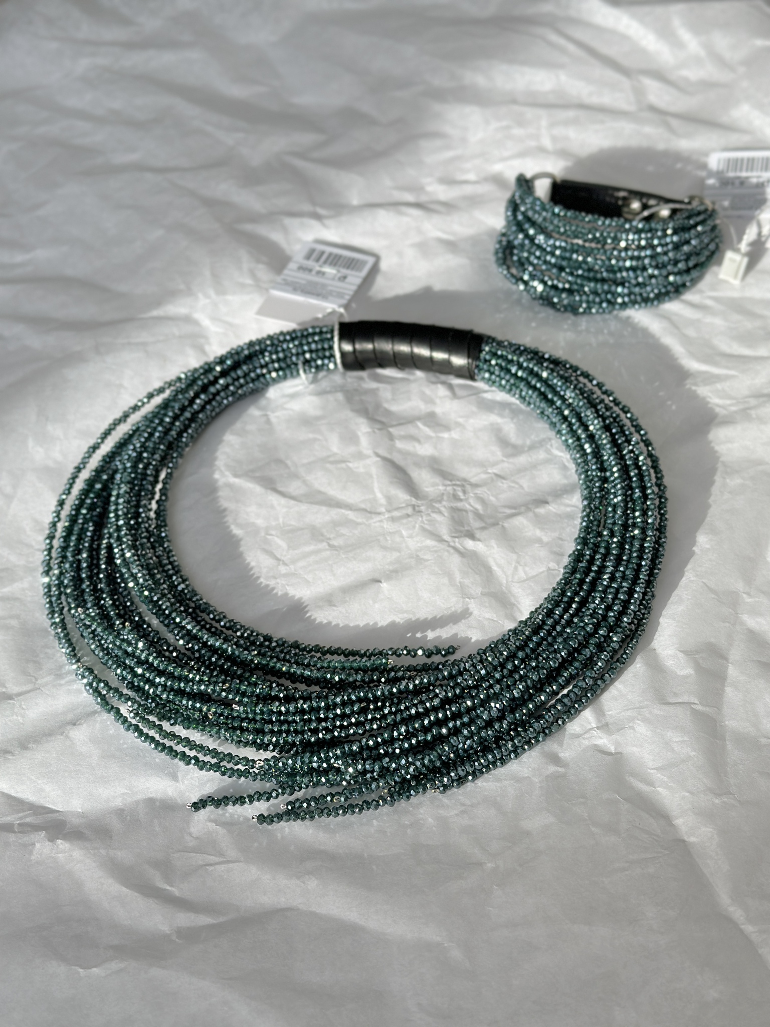 Браслет из венец.стекла бисерной огранки на кожан.застежке, оттенок сине-зеленый