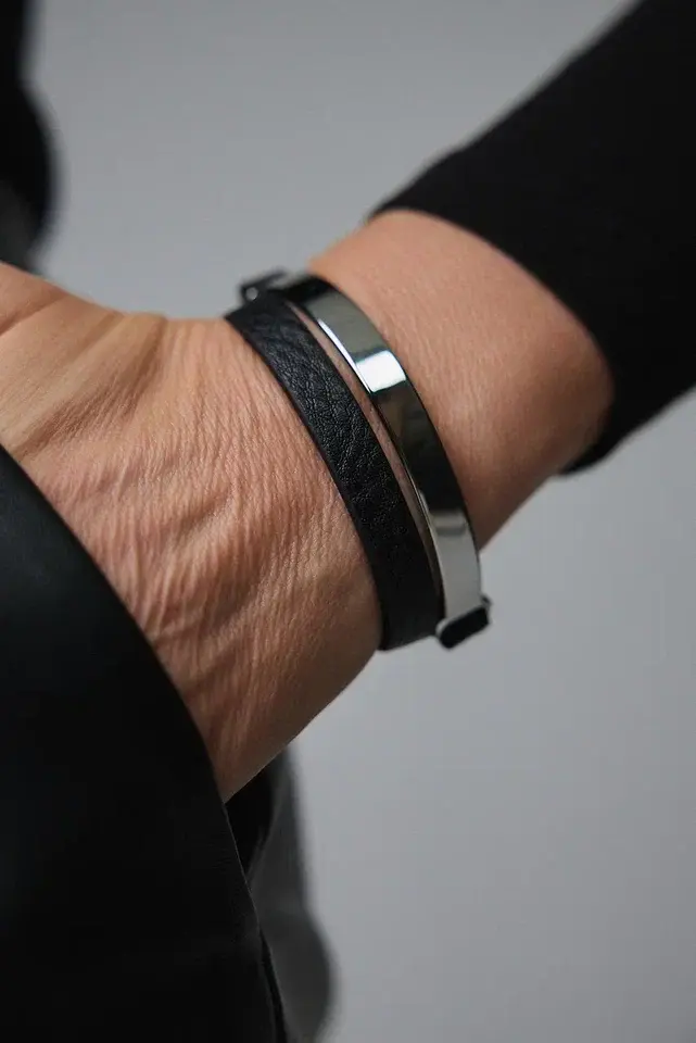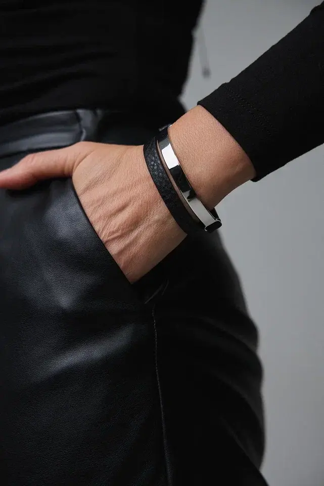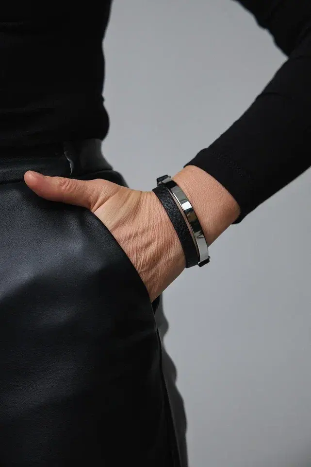 Браслет на кнопках гладкая серебряная пластина на черной коже
