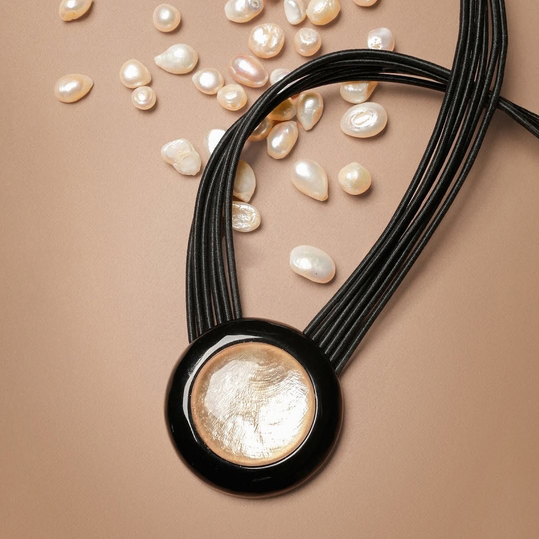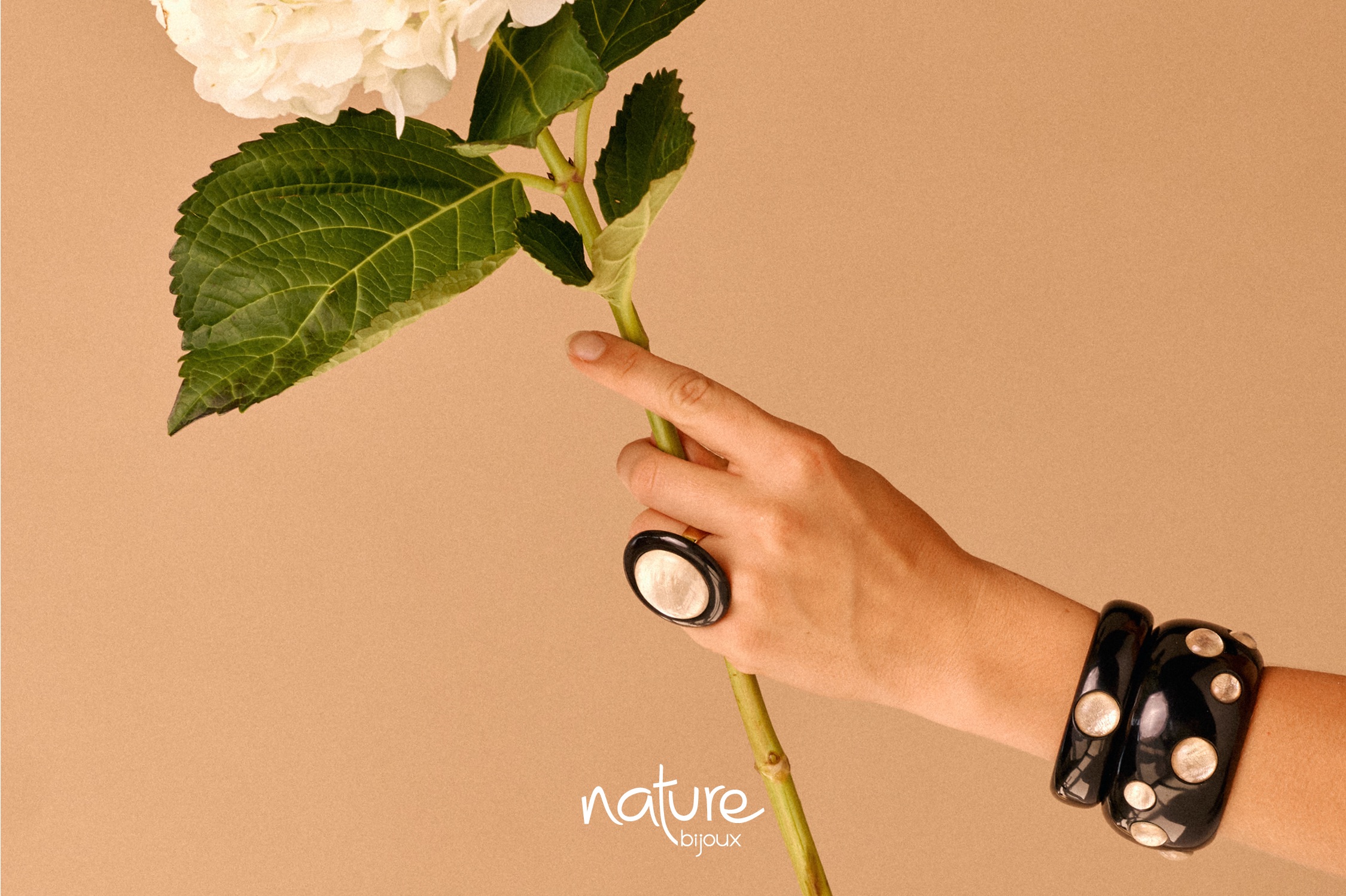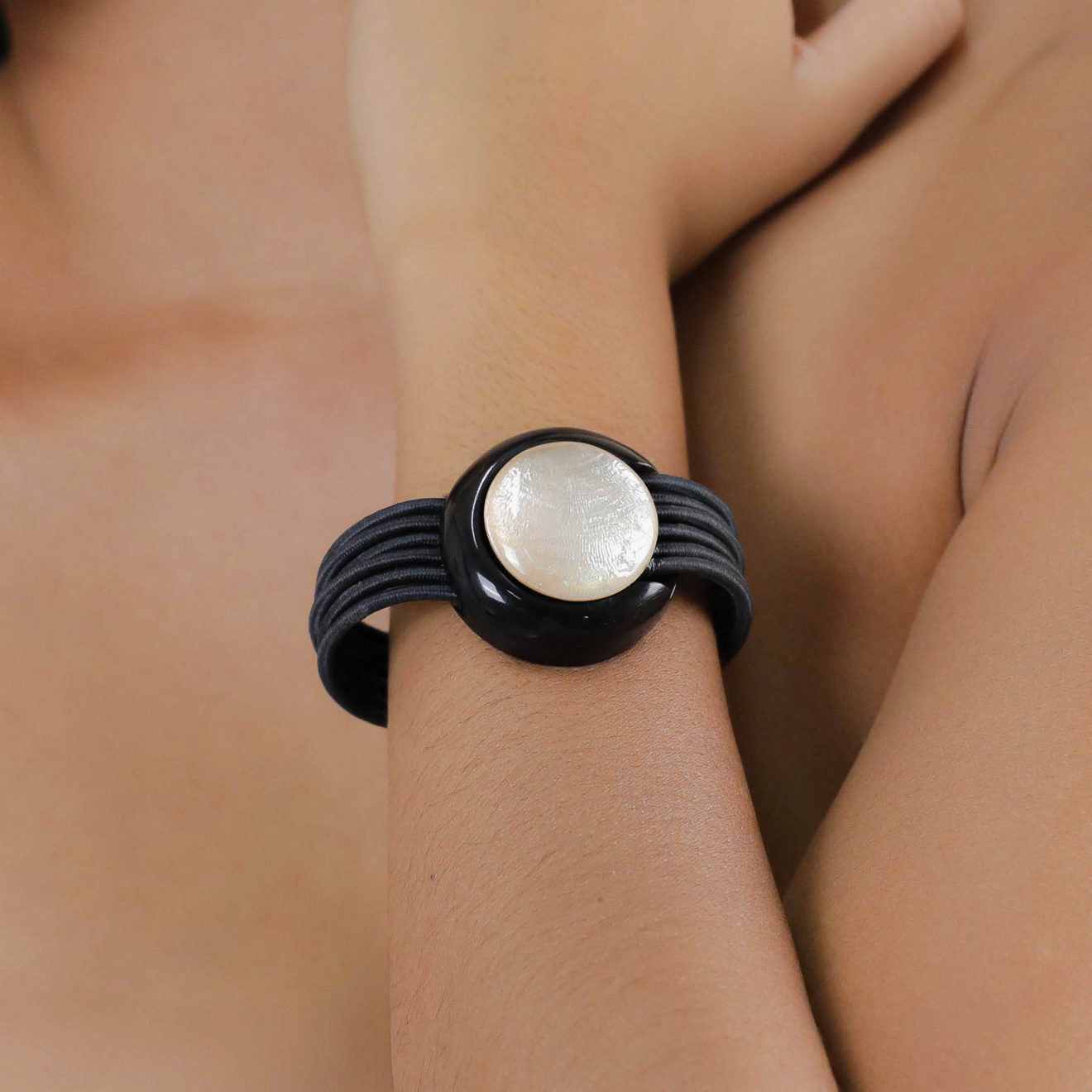 Браслет выполнен из рога, украшен вставками из натуральной ракушки Capiz, заключённой в прозрачную смолу, что придаёт изделию особый шарм и глубину. Диаметр браслета — 5,8 см, что делает его универсальным вариантом для большинства запястий.