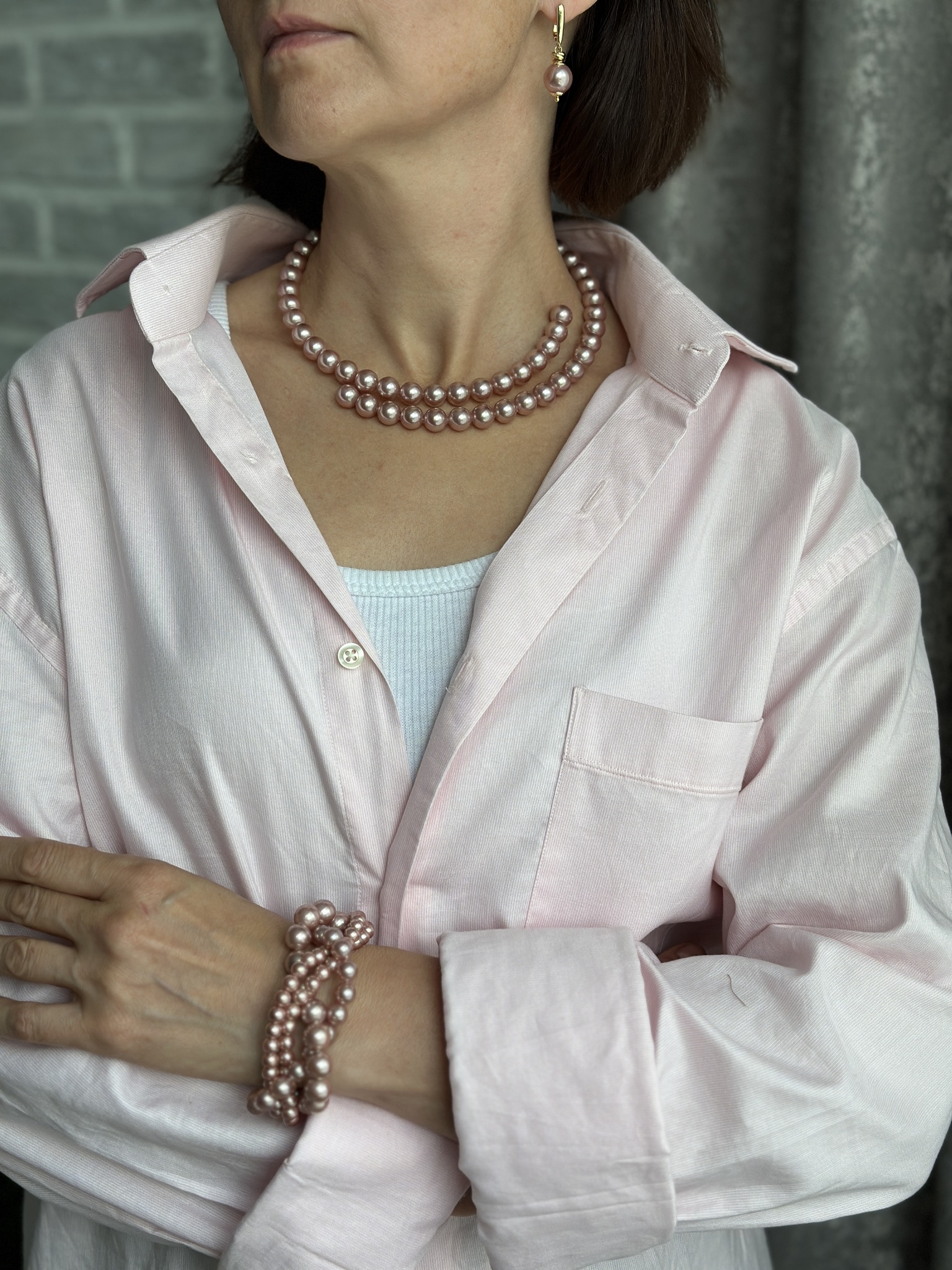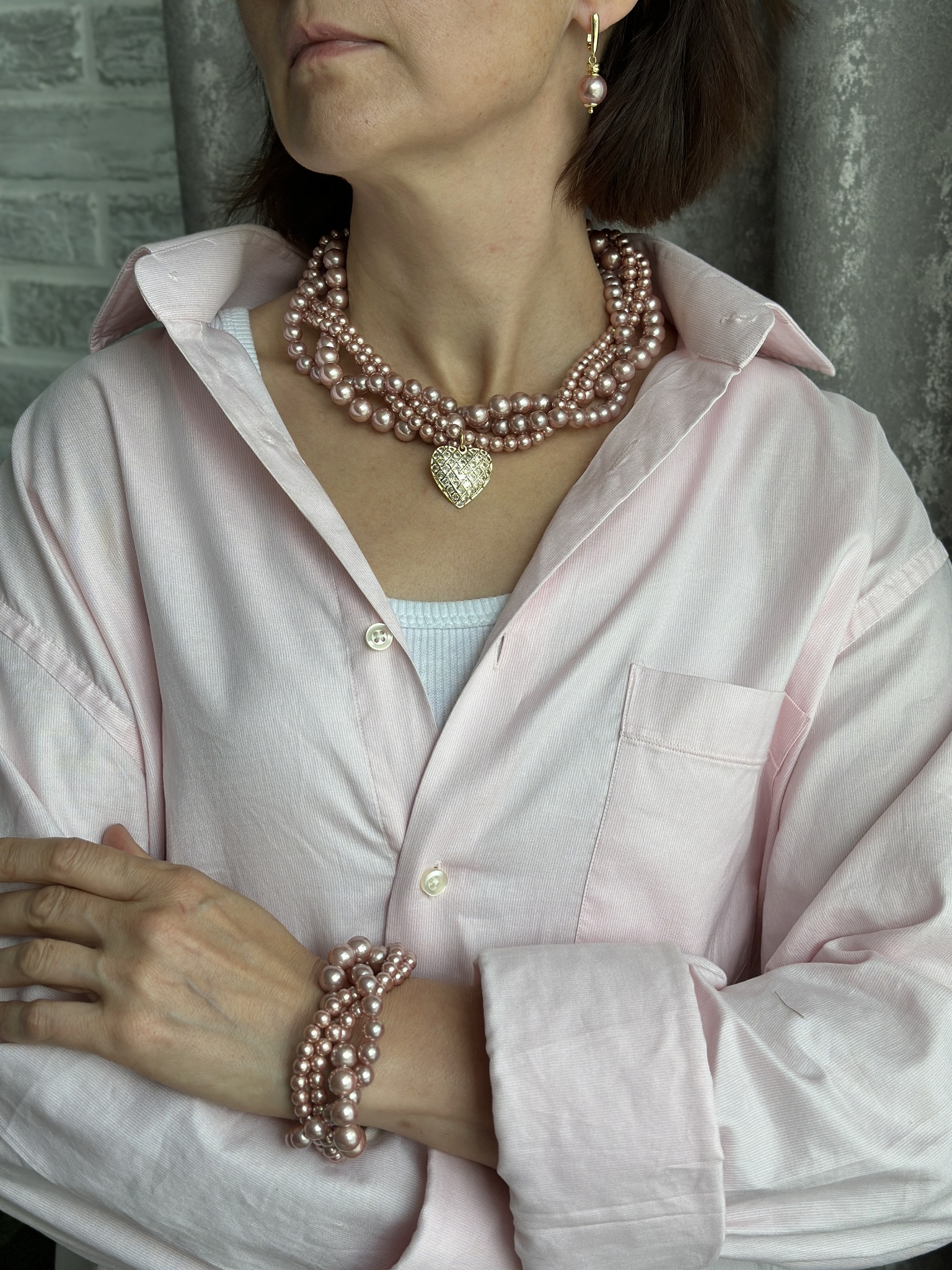Браслет "Одри" переплетенные нити розового жемчуга Майорка, оттенок золото. Регулировка размера.