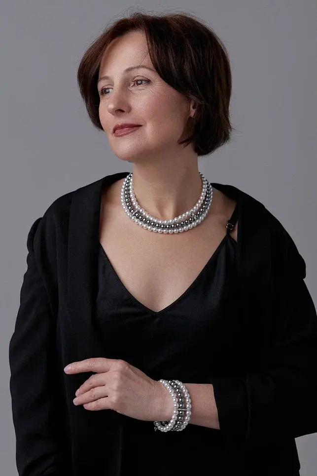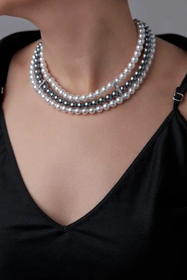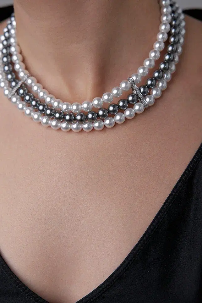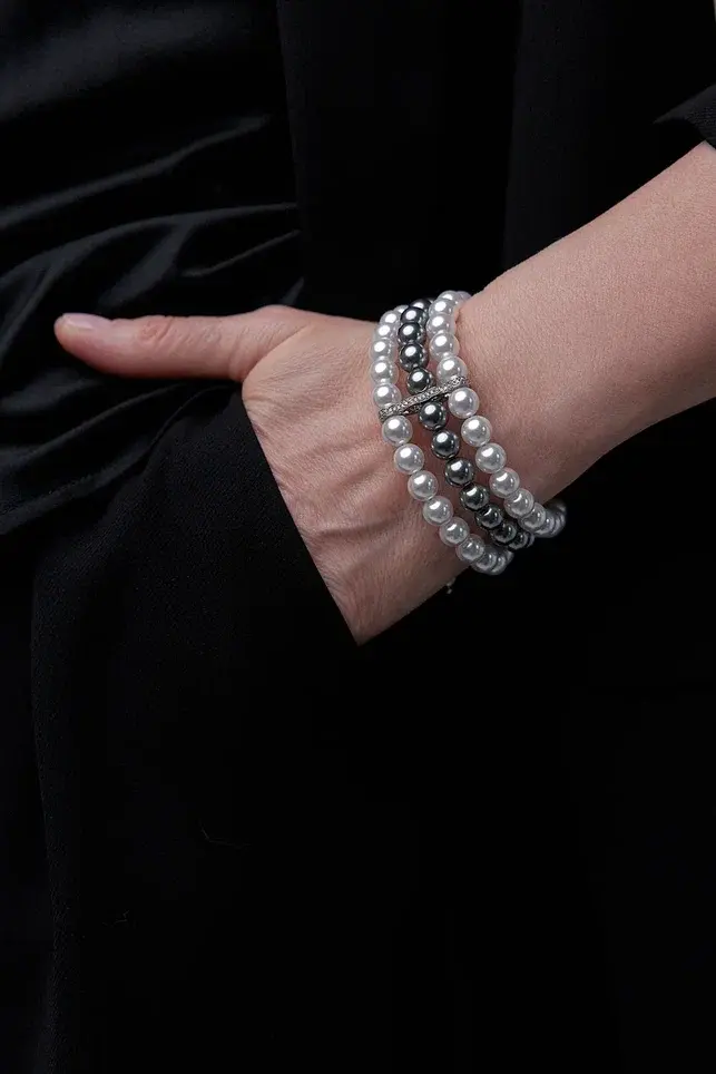 Браслет "Парижанка 2" с 3 рядами серого и белого жемчуга Майорка 0,8 см с цирконами, оттенок серебро. Длина регулируется.