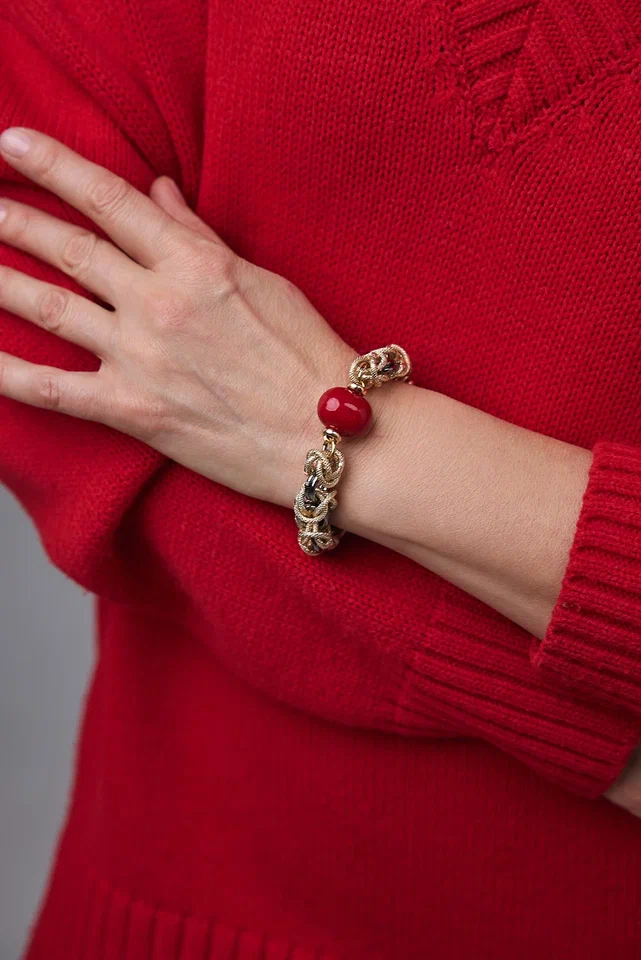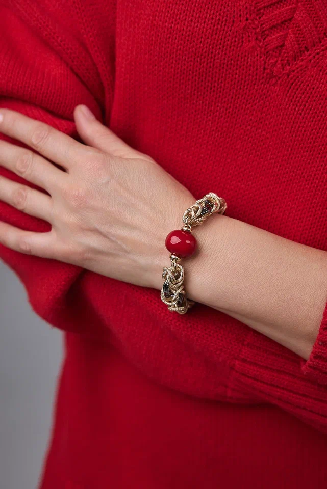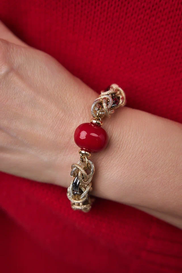 Браслет Византия биколор:золото и графит с красным плоским жемчугом Майорка