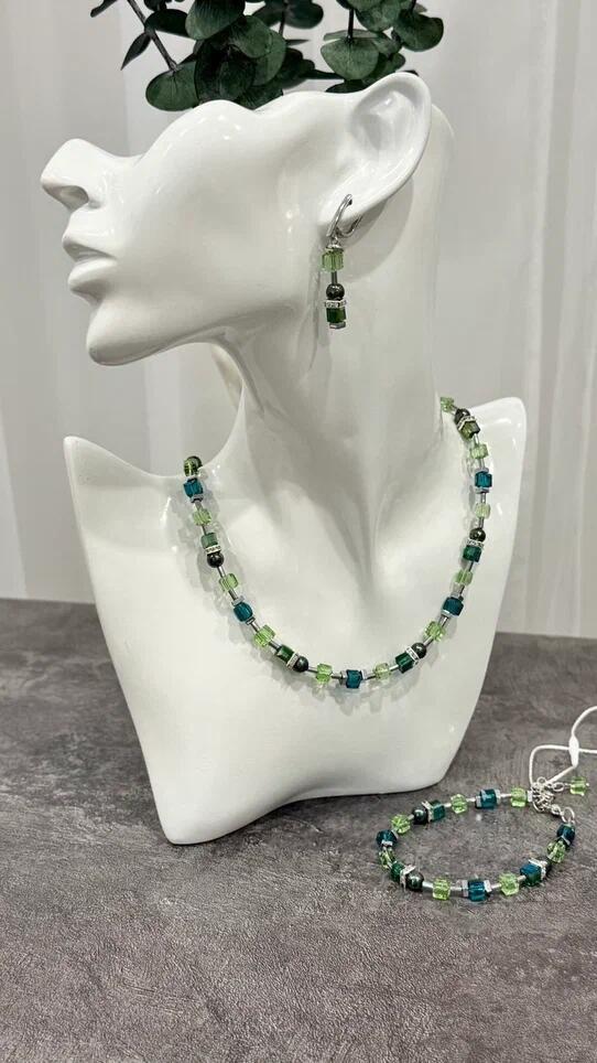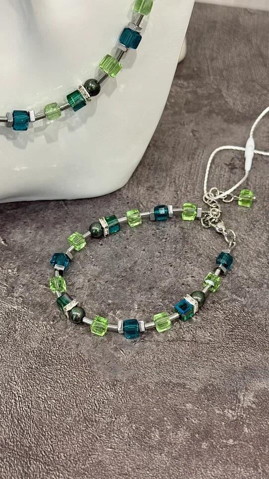 Браслет с зелеными и салатовыми кубиками и жемчугом. Оттенок серебро. Регулировка длины.