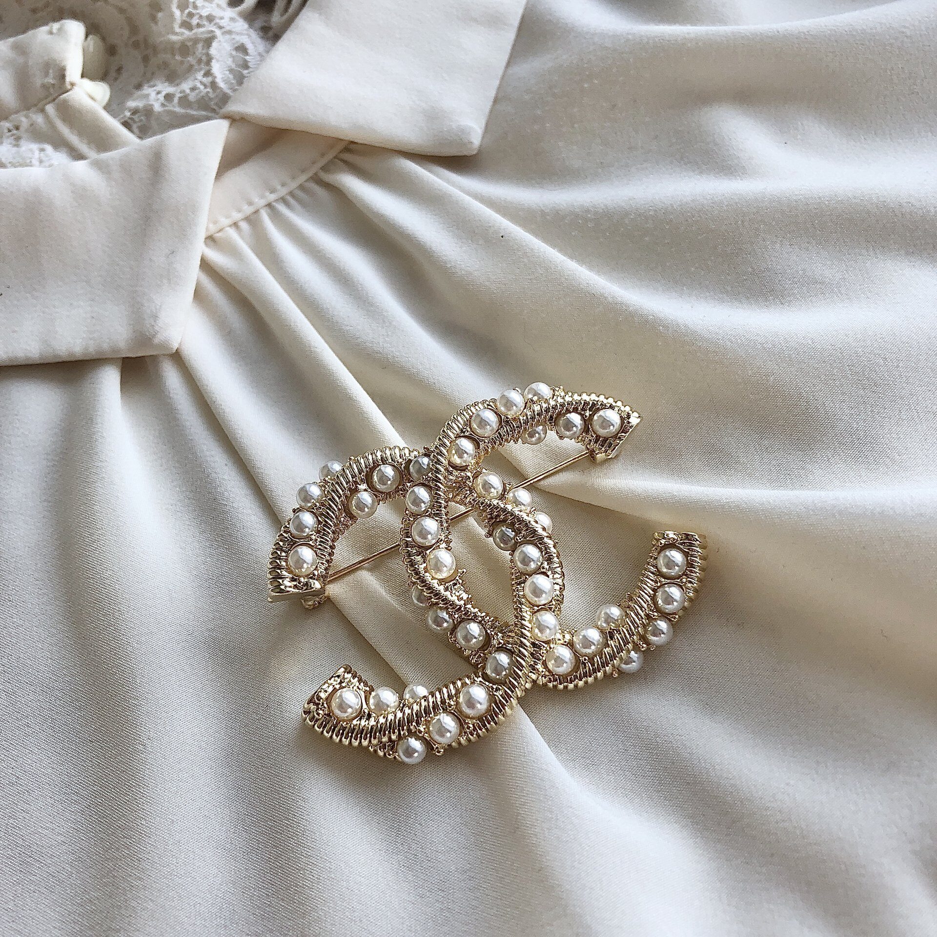 Брошь в стилистике Шанель с жемчугом.
