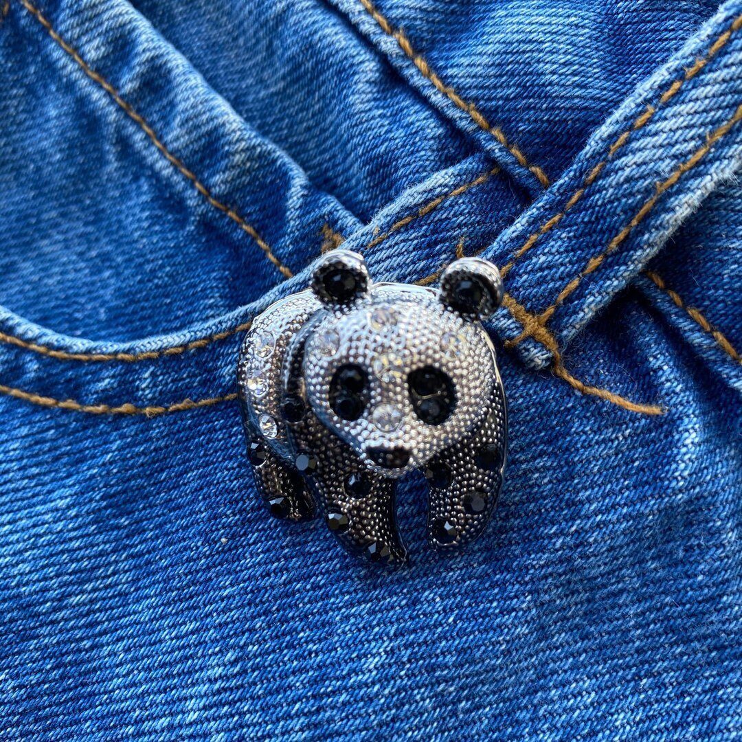 Брошь панда с прозрачными и черными кристаллами. Классическая брошная застежка.