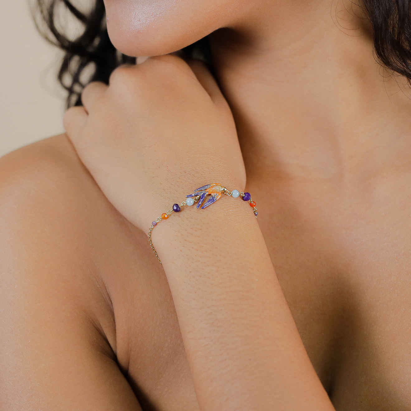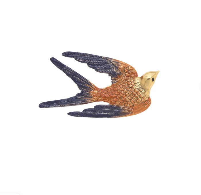 Эта изящная брошь выполнена в виде маленькой птицы, символизирующей лёгкость и свободу. Особое внимание уделено деталям: сияющие стразы искусно инкрустированы в изделие, переливаясь на свету и притягивая восхищённые взгляды. Брошь изготовлена из высококачественного бижутерного сплава с благородным золотым покрытием. Надёжный замок-булавка обеспечивает удобное и безопасное крепление к одежде или аксессуарам. Длина изделия составляет 4 см — это идеальный размер для акцентного украшения на жакете, платье или шарфе. Брошь станет стильным дополнением как к повседневному, так и к вечернему образу.