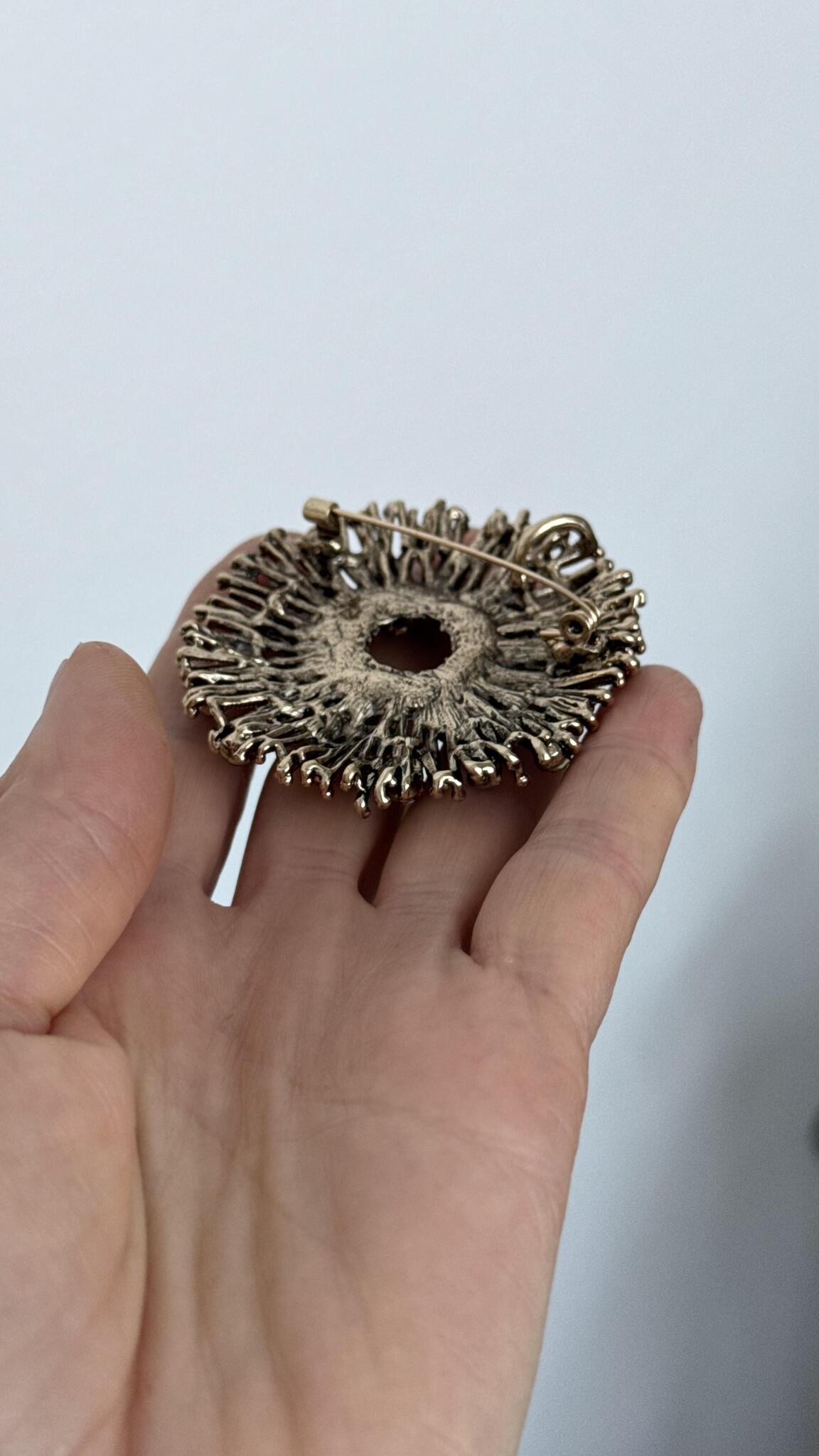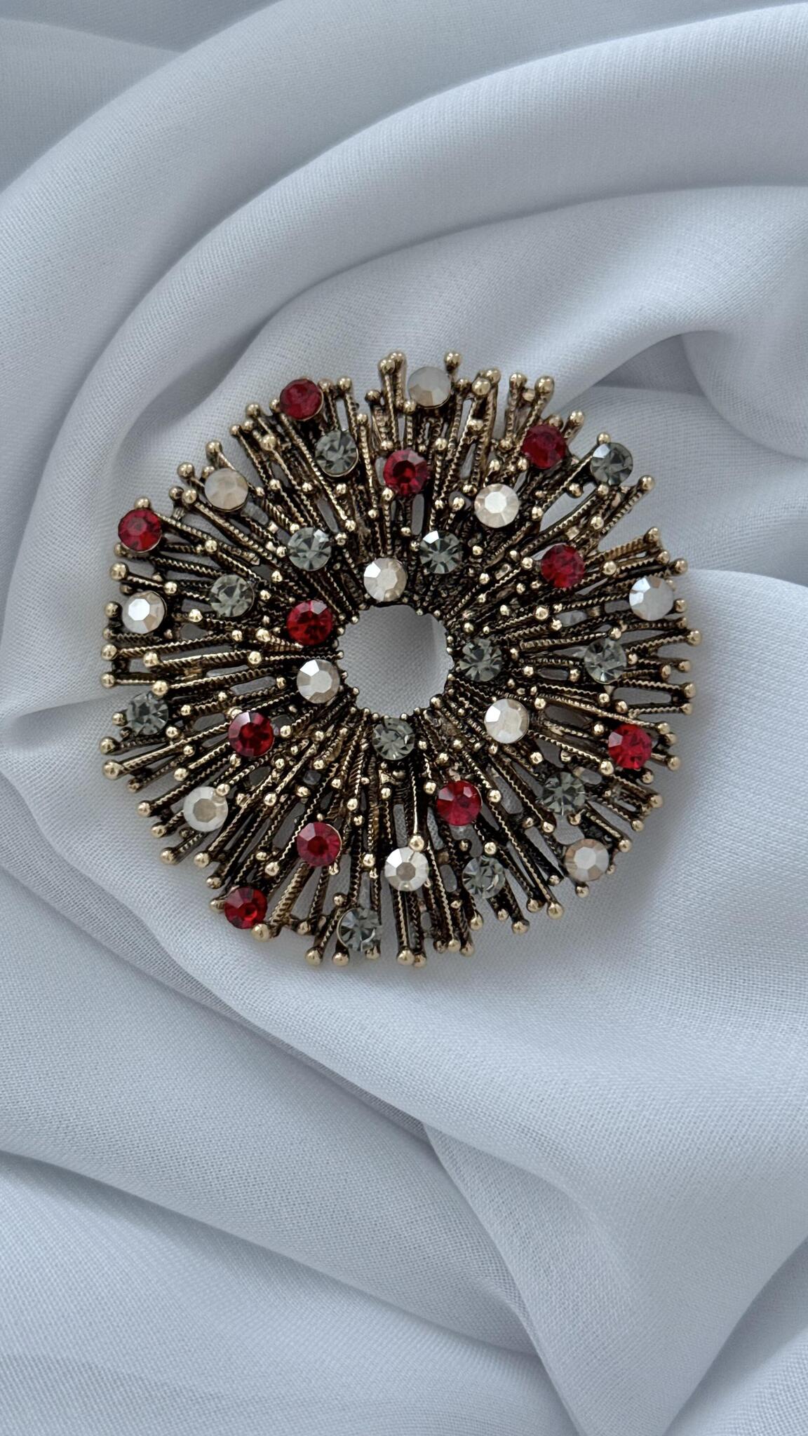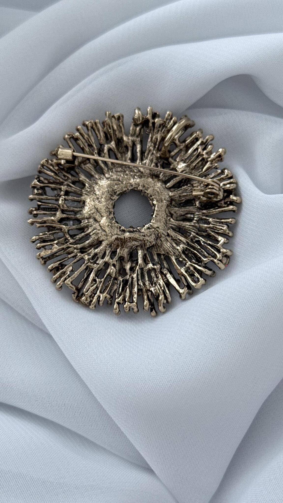 Брошь-кулон "Солнце" с красными, серыми и белыми кристаллами, оттенок бронза.