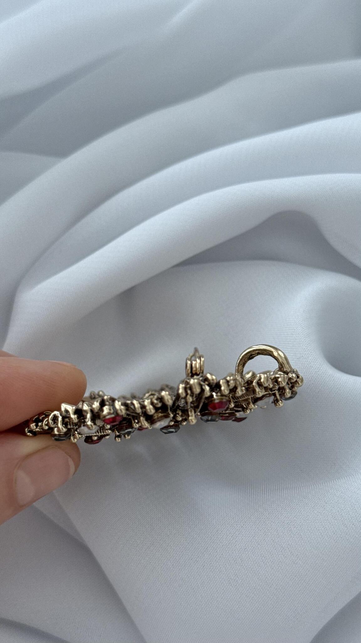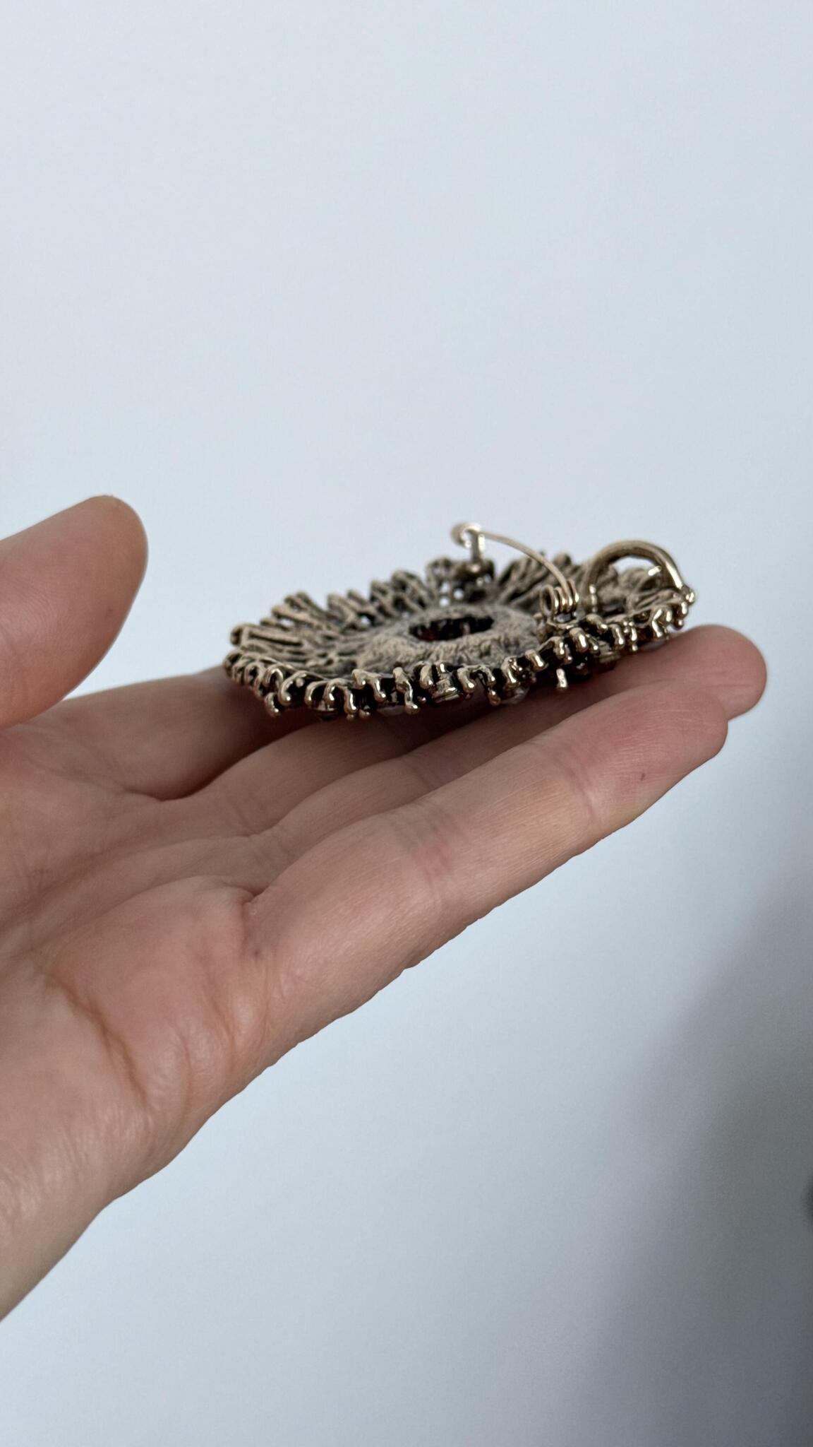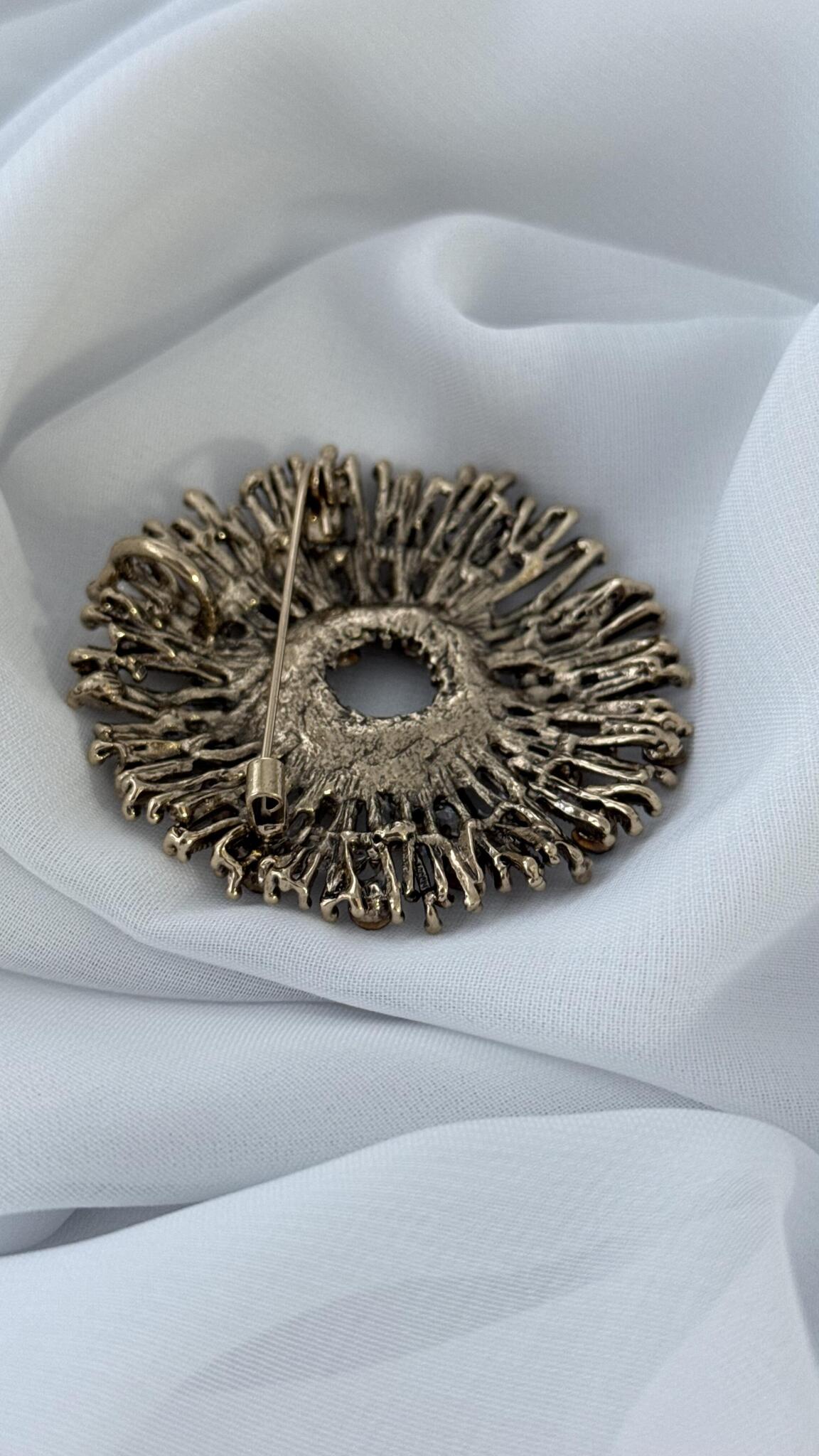 Брошь-кулон "Солнце" с красными, серыми и белыми кристаллами, оттенок бронза.