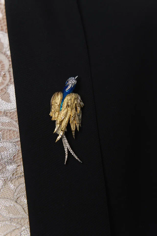Брошь-подвеска птица с цирконами и синей эмалью, оттенки:золото и серебро