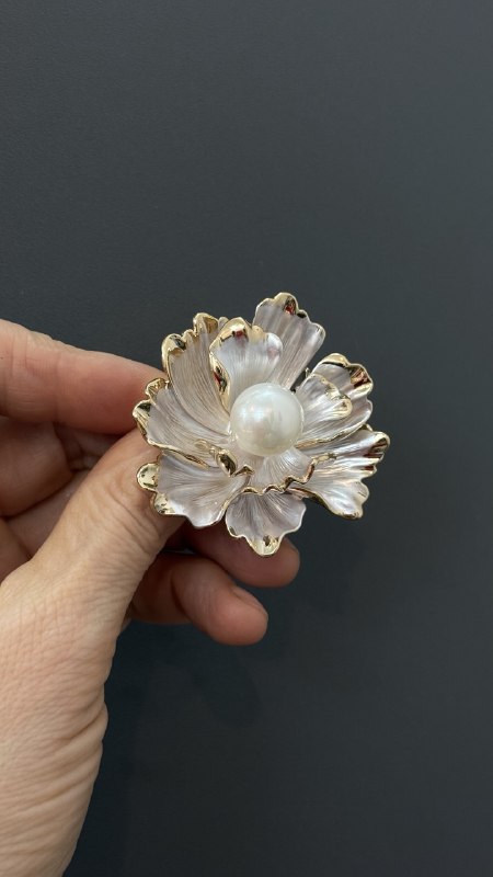 Брошь подвеска цветок из нежно-розового перламутра с жемчужиной, золотая окантовка.