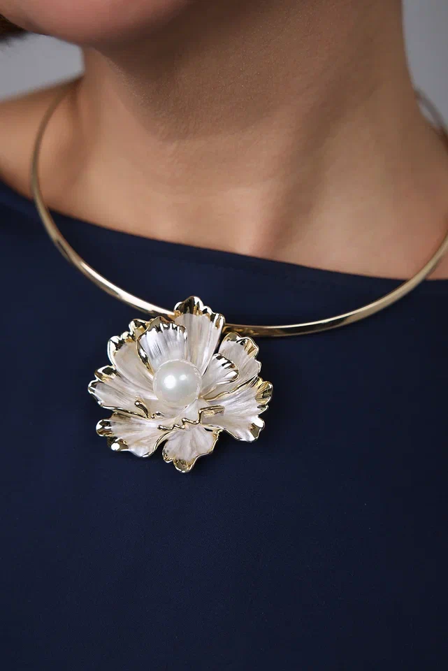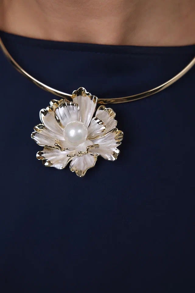 Брошь подвеска цветок из перламутра с золотой окантовкой с жемчужиной