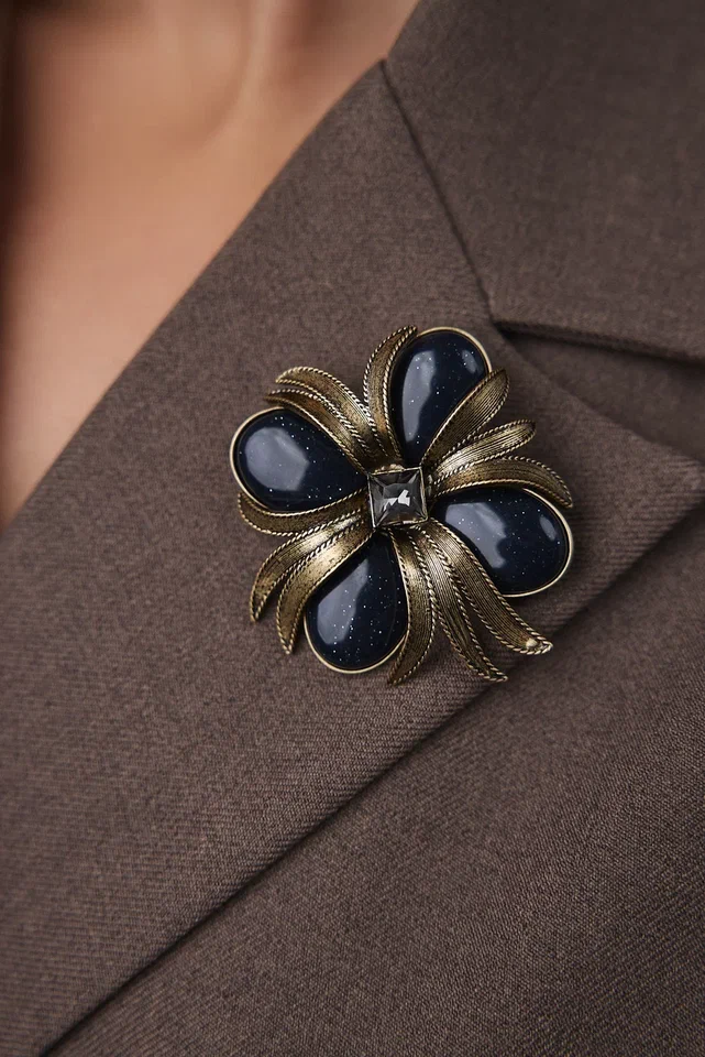Эта изысканная металлическая винтажная брошь с авантюрином и серым кристаллом выполнена в шикарном оттенке "золото антик".