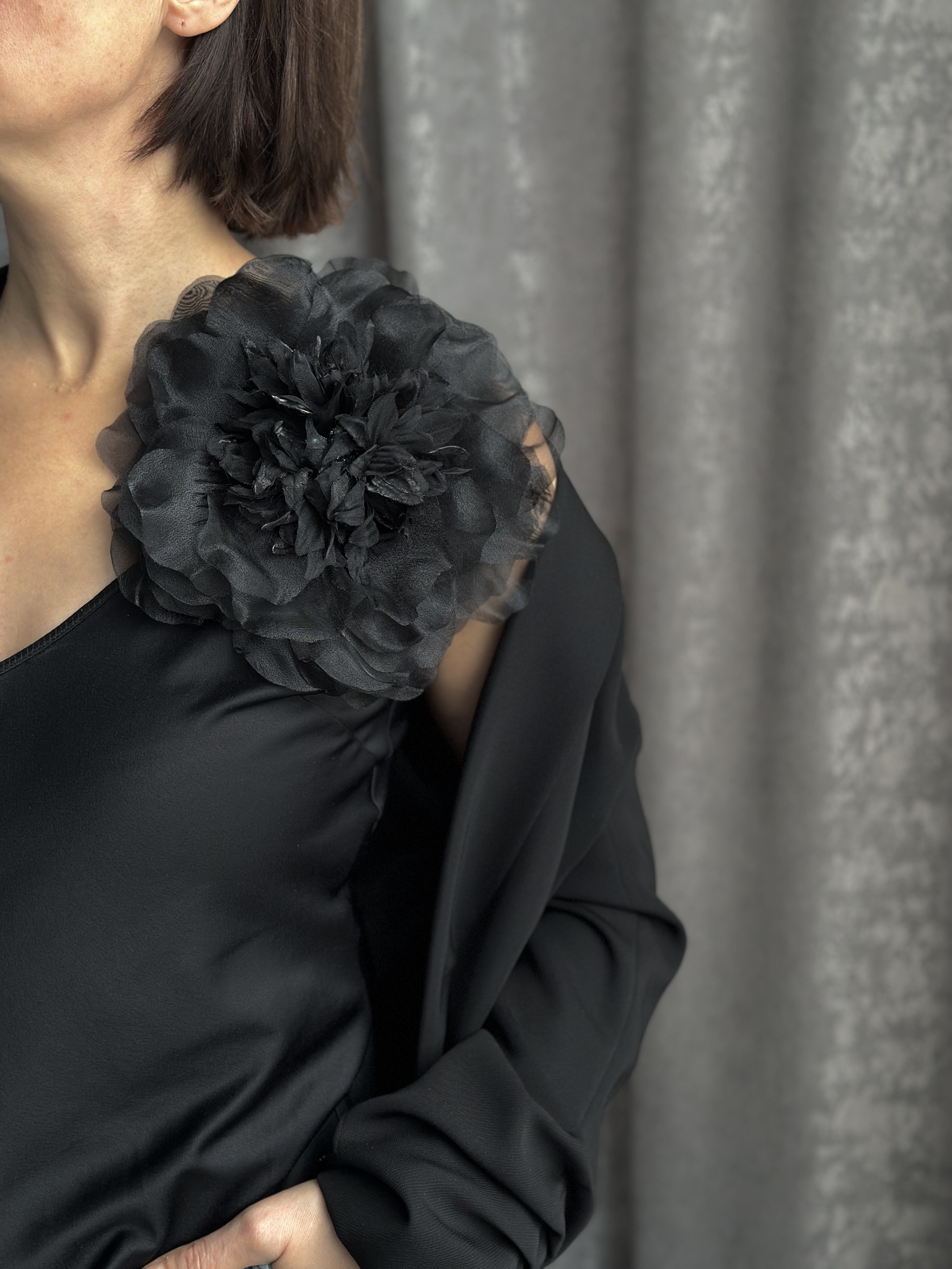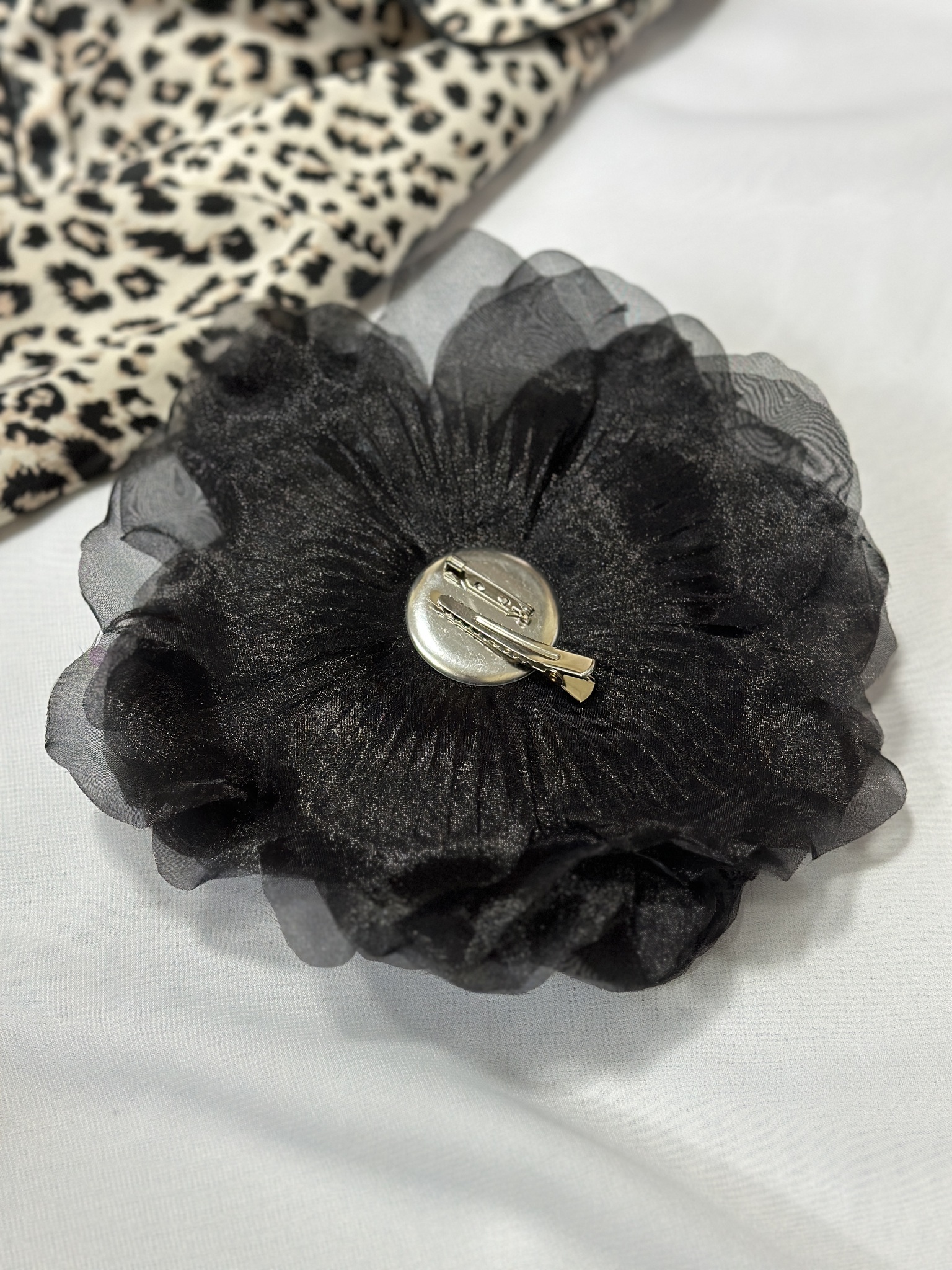 Брошь цветок из черного шелка, 2 застежки:классическая брошная и зажим