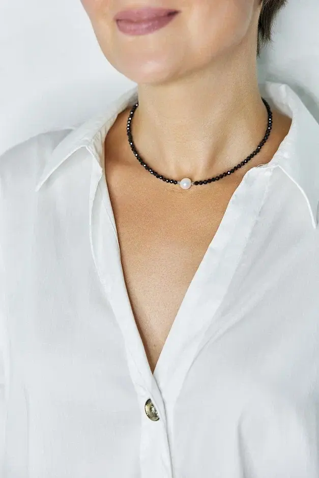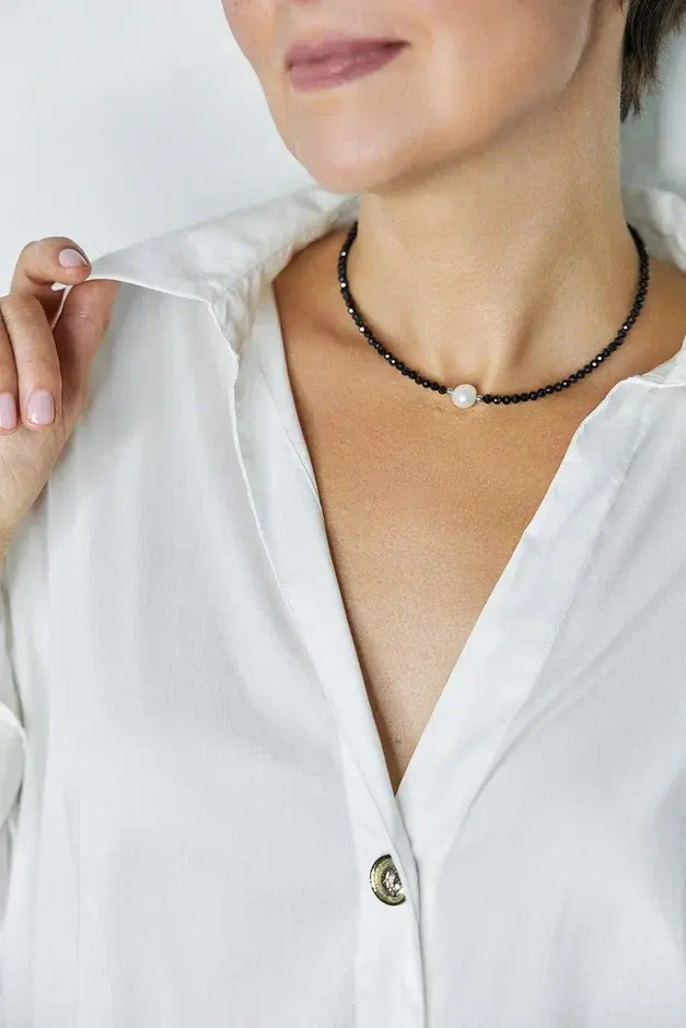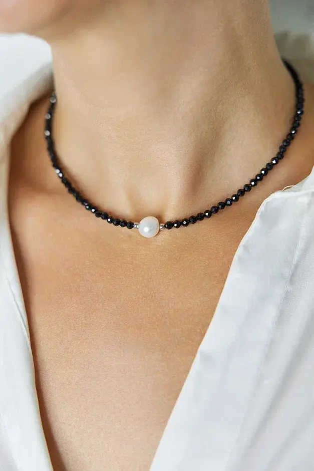 Чокер из черной шпинели с речной жемчужиной, серебро. Длина 38-43 см.