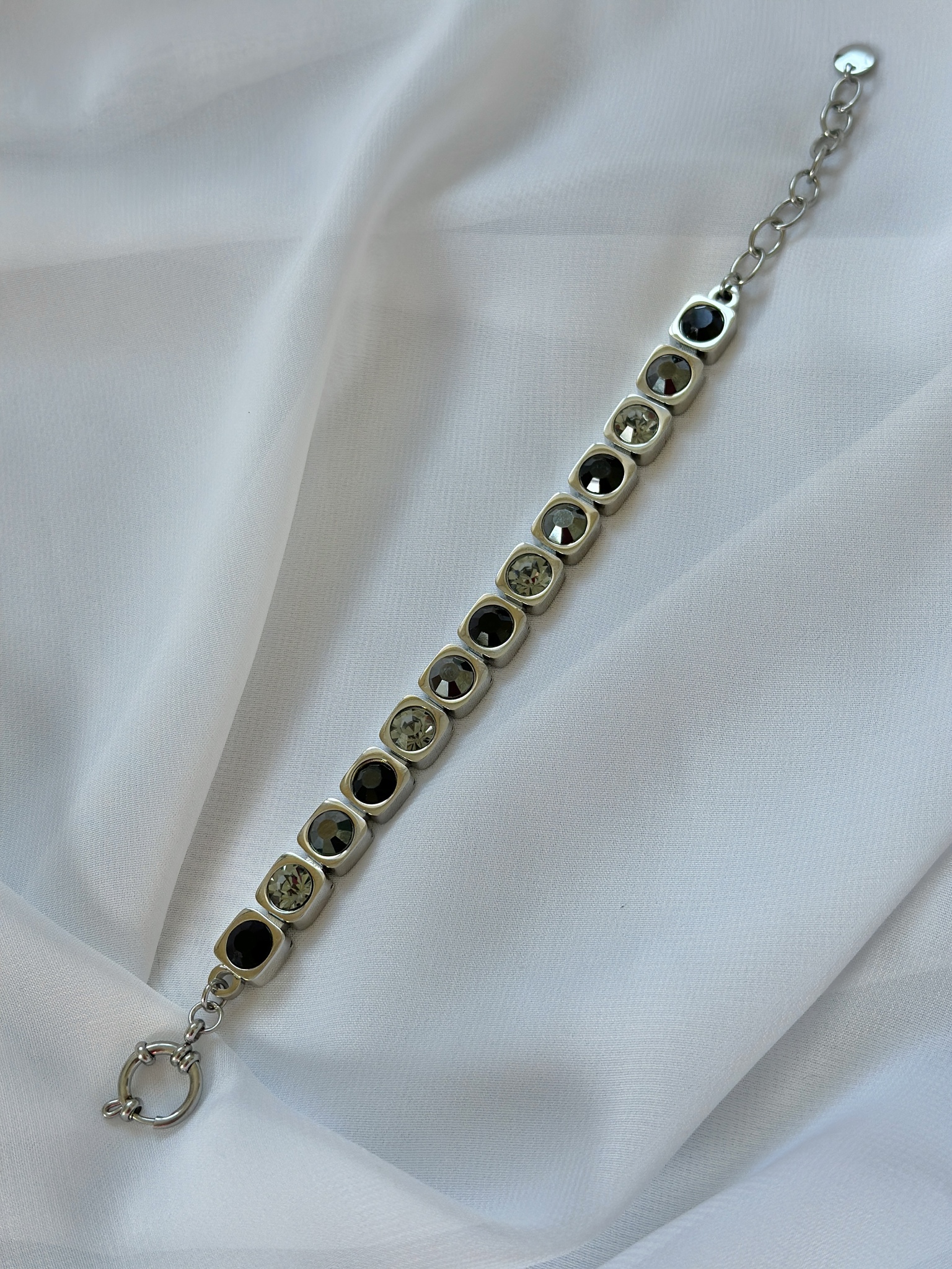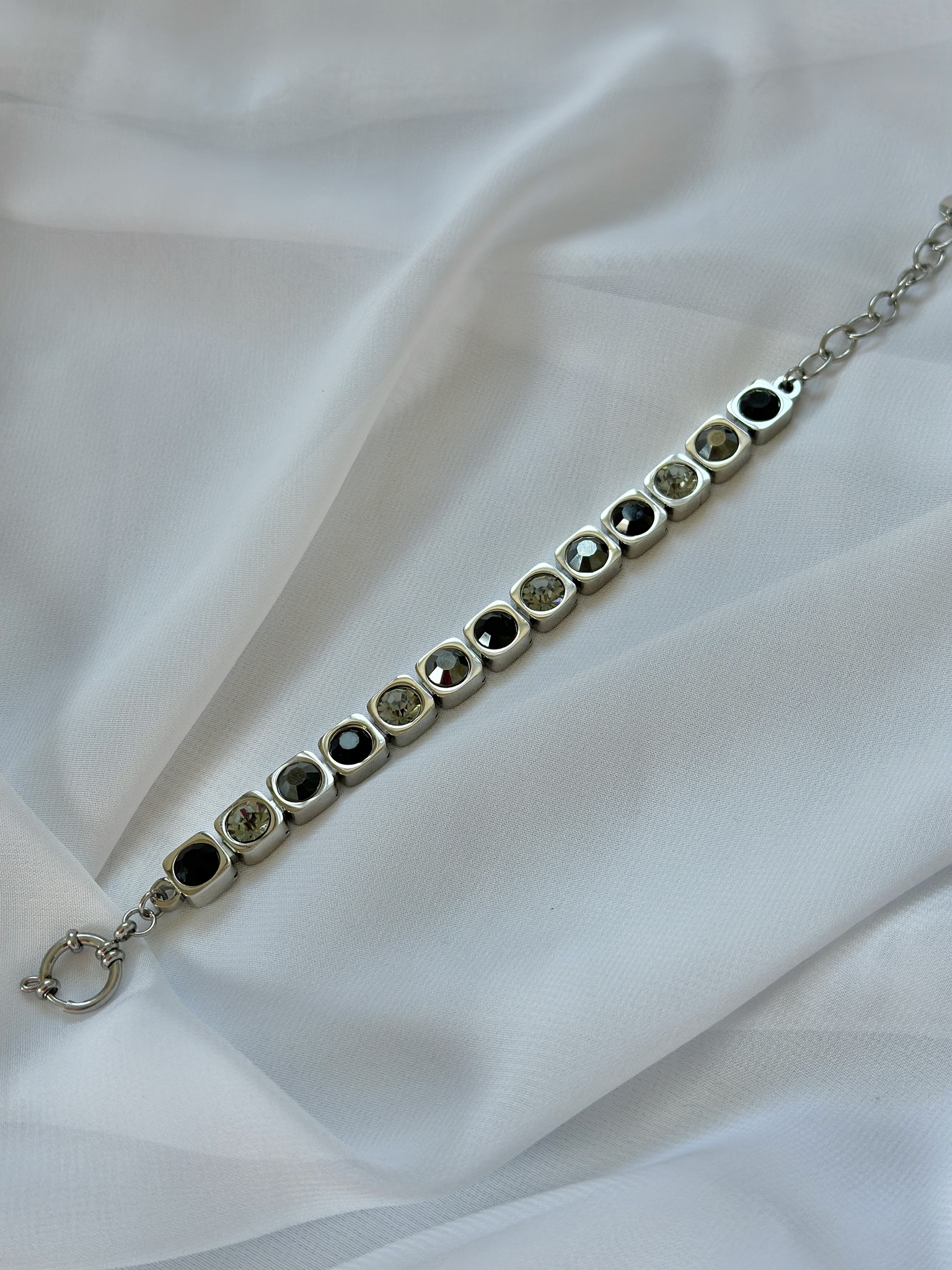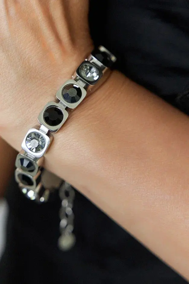 Браслет из ювелирной стали с кристаллами Preciosa. Размер 18-22,5. Не боится влаги. Материал в 4 раза прочнее серебра. Не деформируется. Оттенки кристаллов: черный, графит, серый.