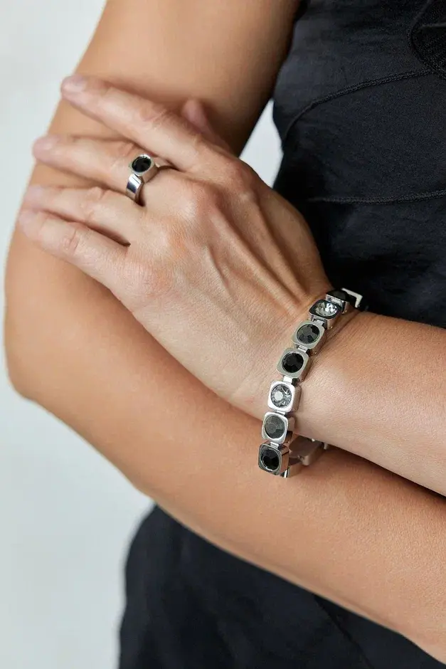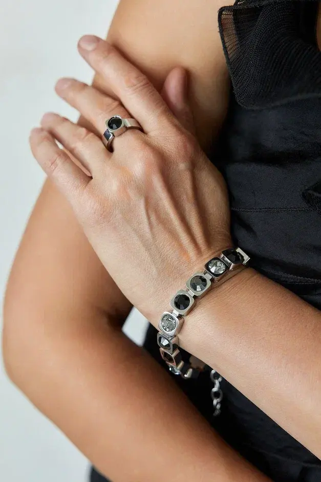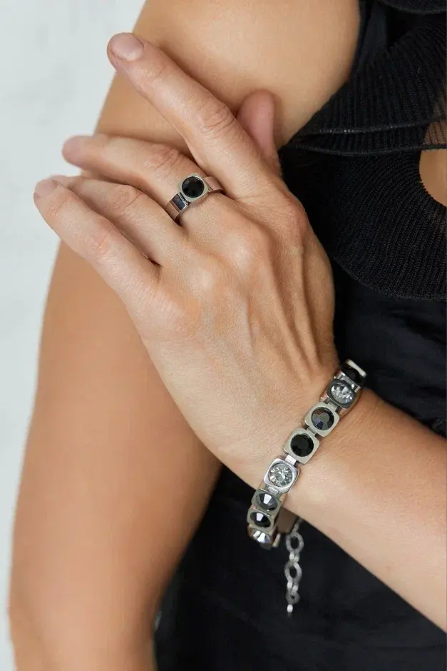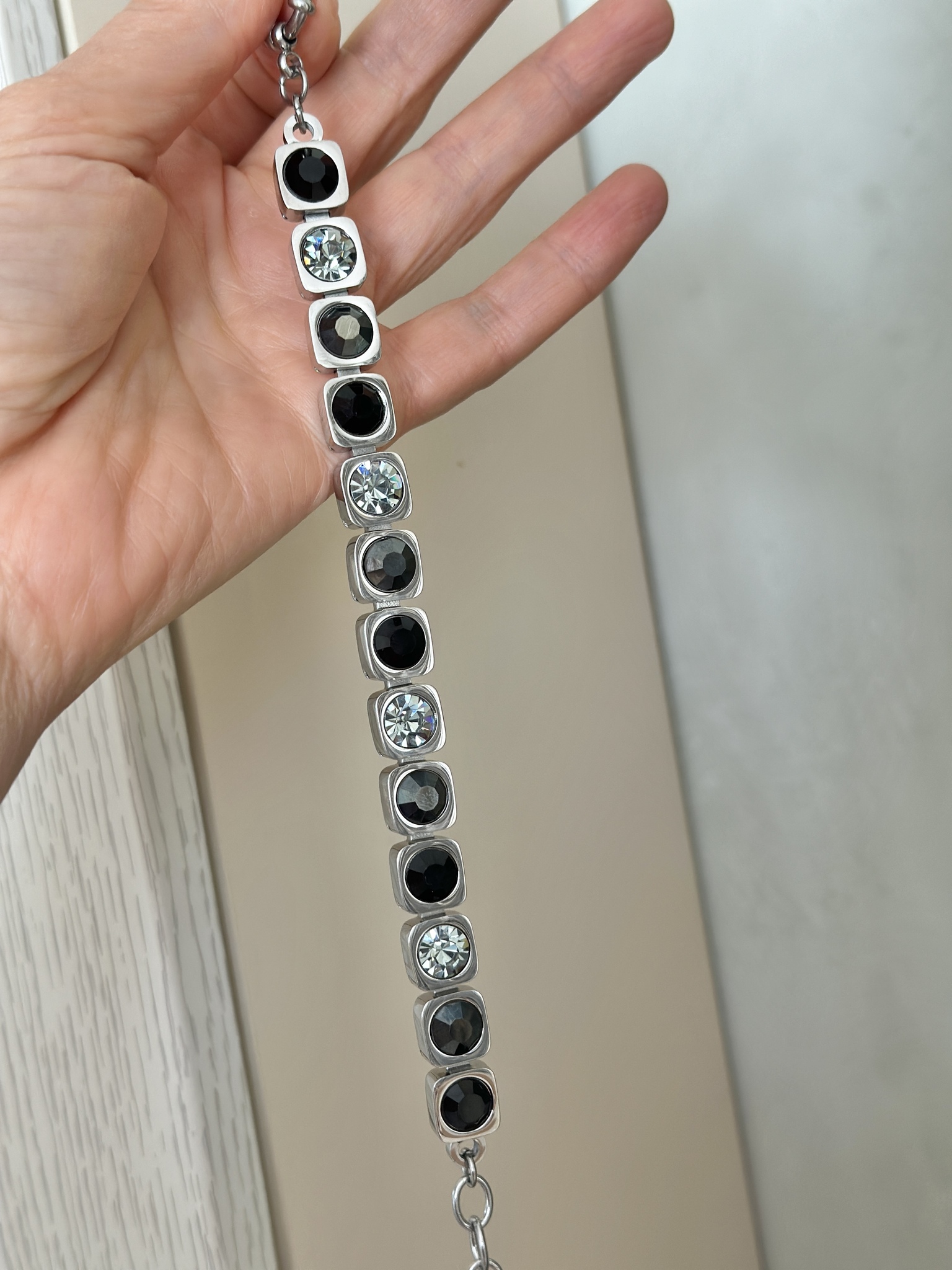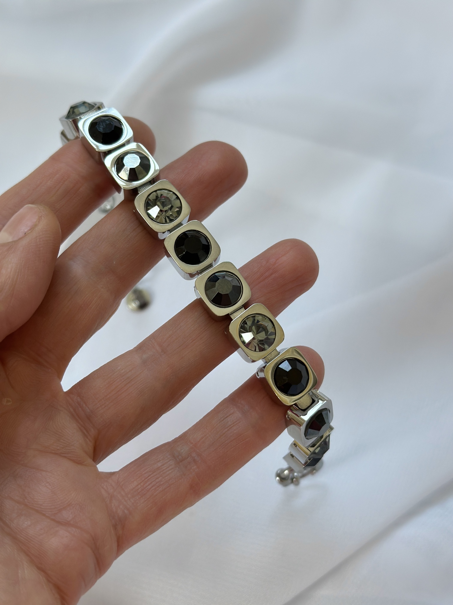 Браслет из ювелирной стали с кристаллами Preciosa. Размер 18-22,5. Не боится влаги. Материал в 4 раза прочнее серебра. Не деформируется. Оттенки кристаллов: черный, графит, серый.