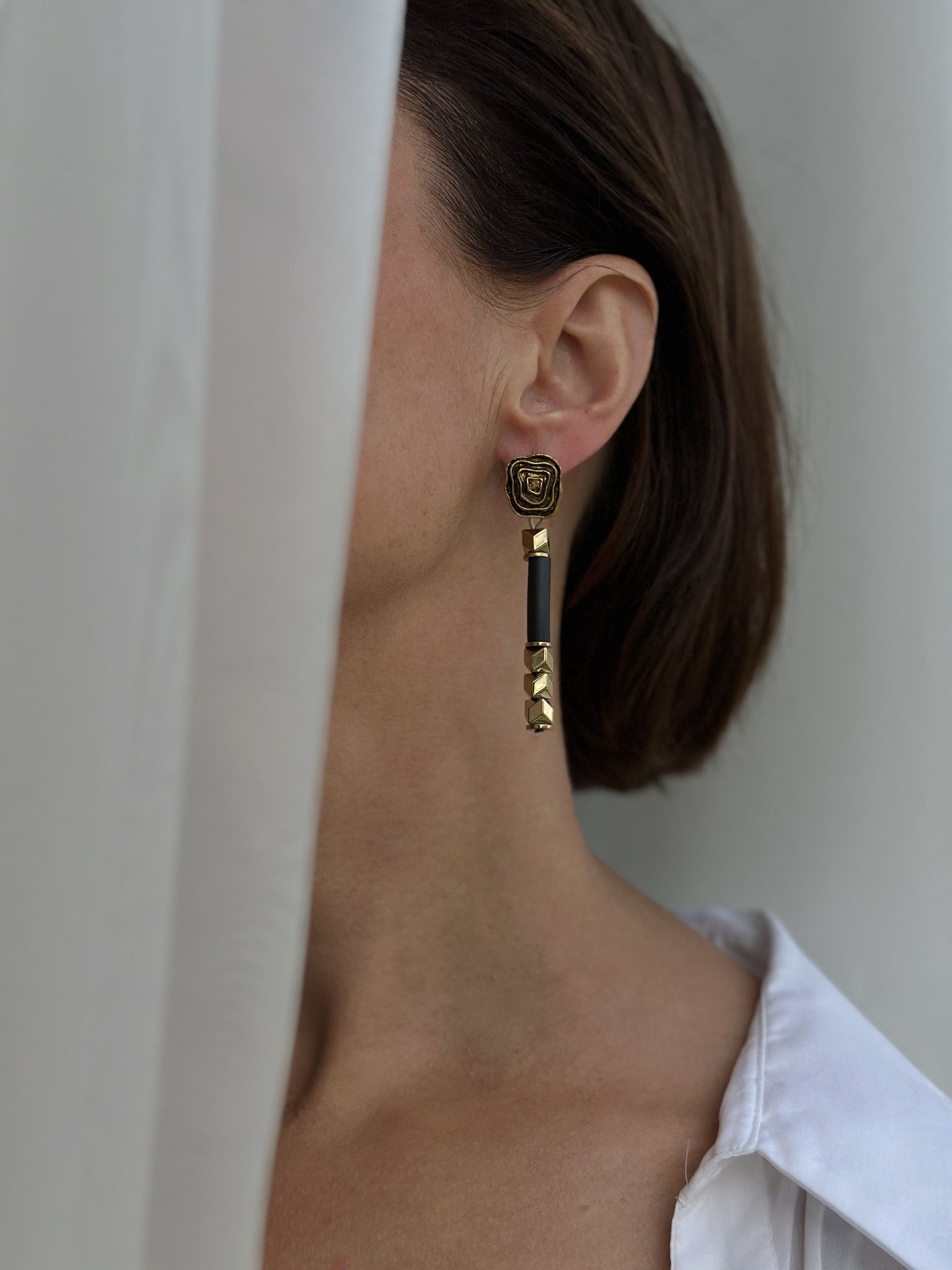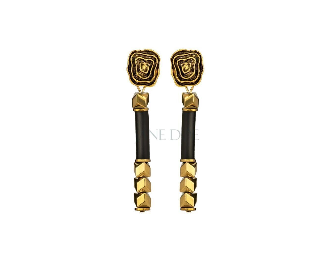 Серьги пусеты из каучука и гематита. Оттенок черный и золото антик.
