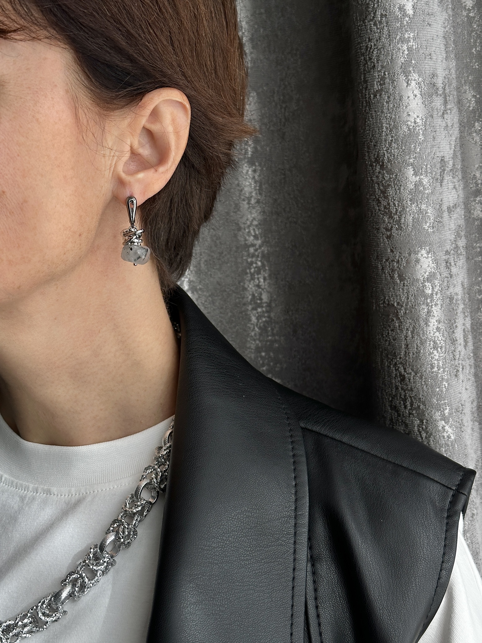 Серьги на английском замке с серым кварцем. Длина 3 см.