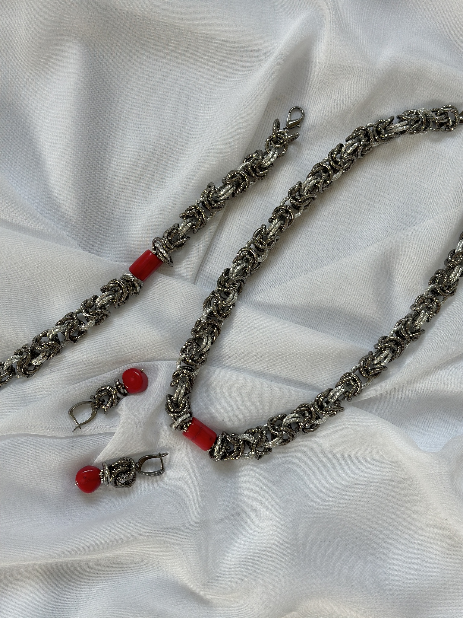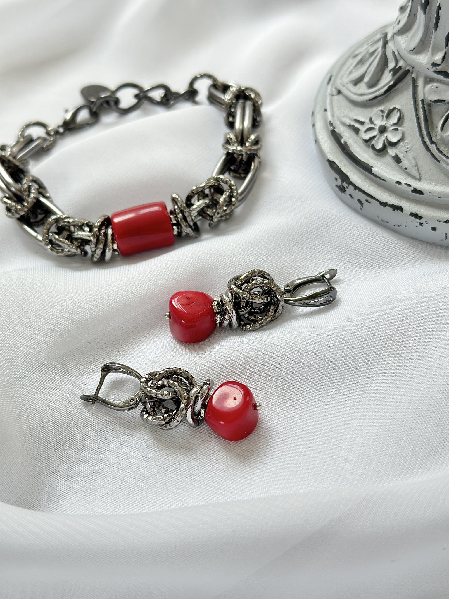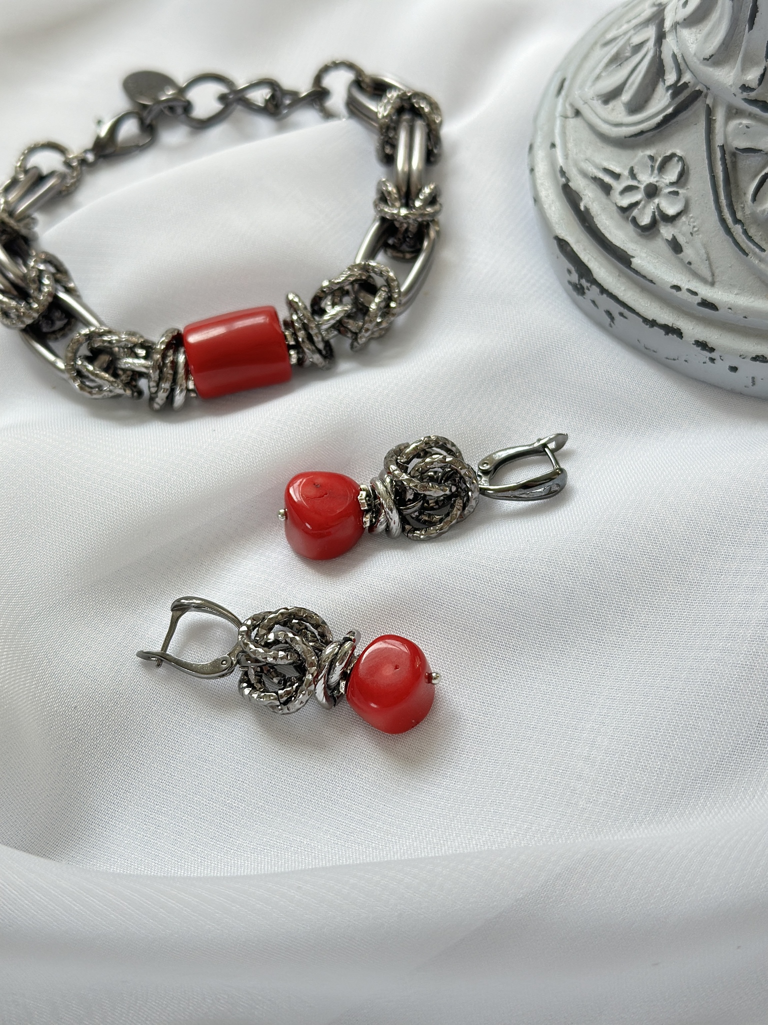 Серьги Византия с кораллом. Английский замок. Длина 4 см.