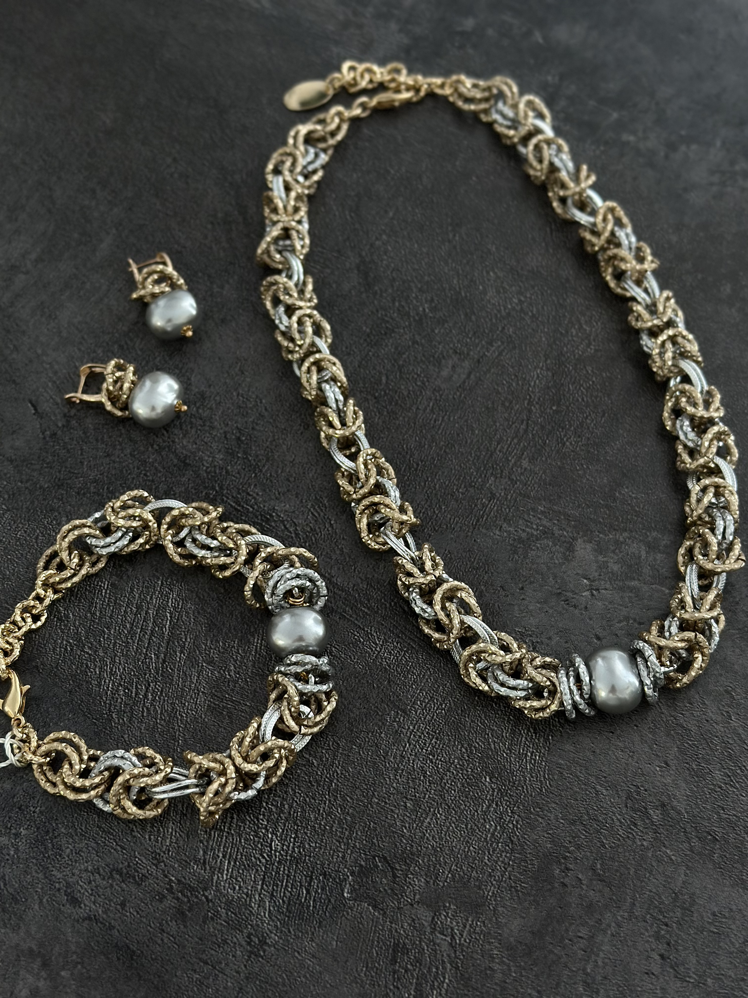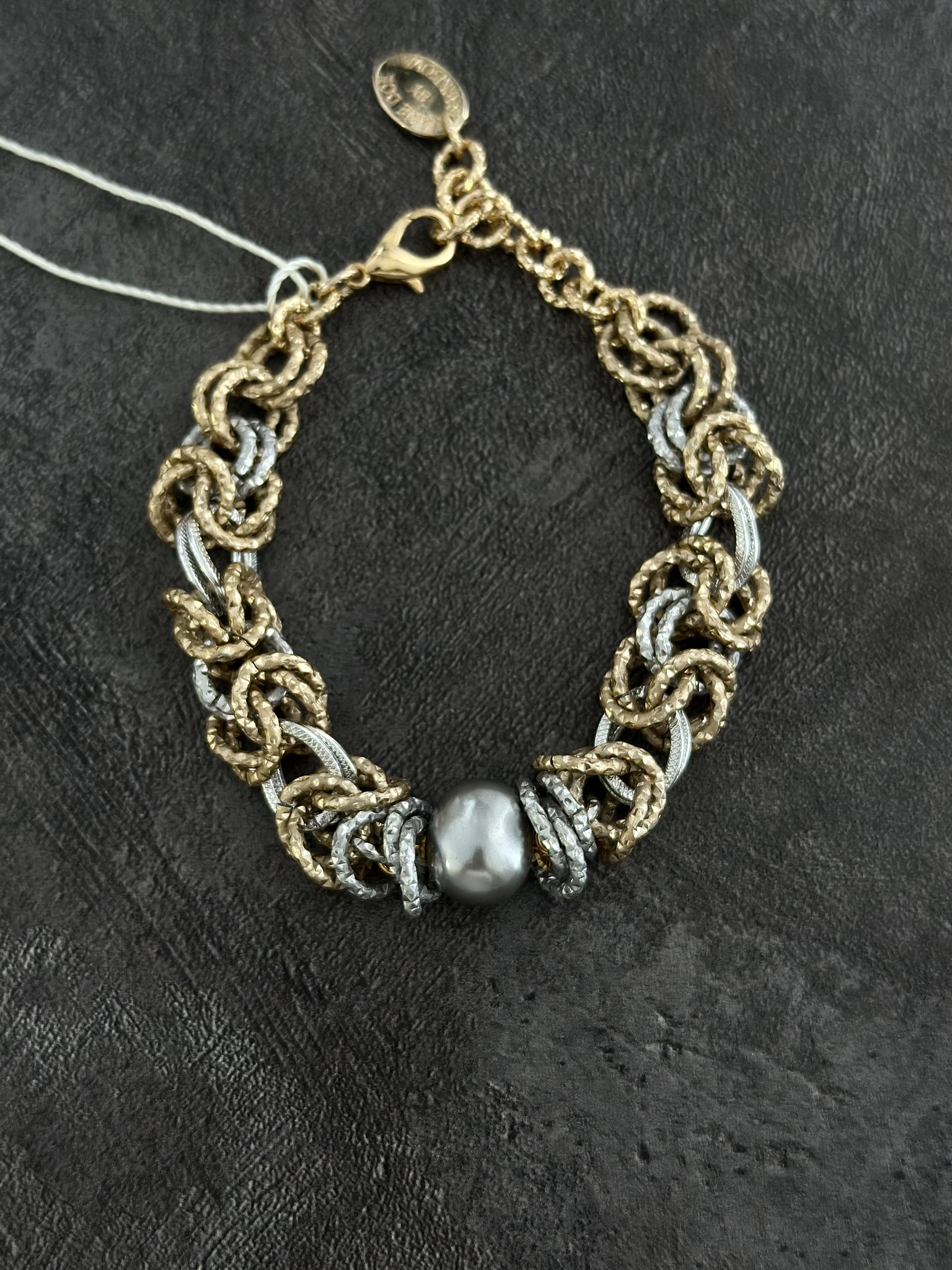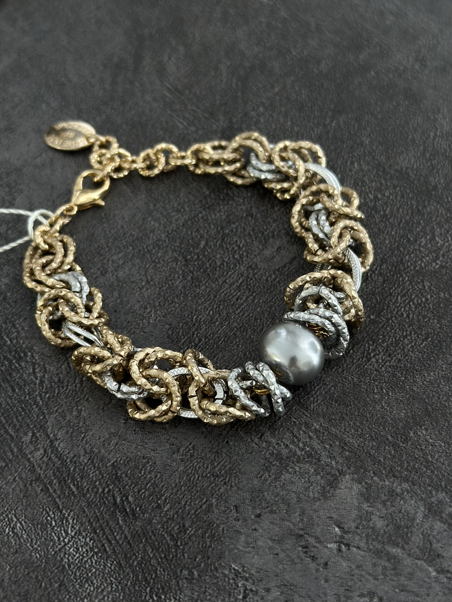 Браслет из легких гальванических цепей с cерым жемчугом Майорка 1,5 см. Оттенки золото и серебро. Размер 17-23.