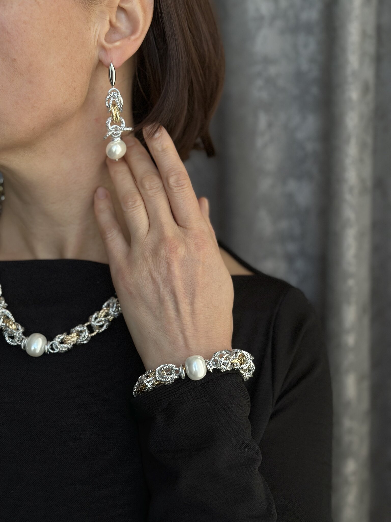 Колье из легких гальванических цепей с жемчугом Майорка. Оттенки золото и серебро. Регулировка длины.