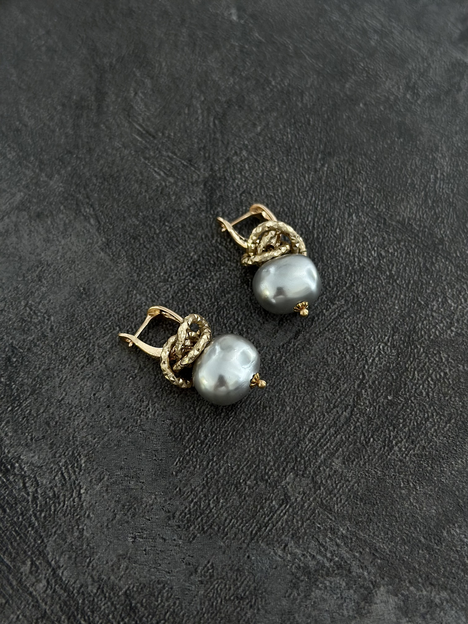 Серьги на английском замке с серым жемчугом Майорка. Длина 2,5 см. Диаметр 1,5 см.