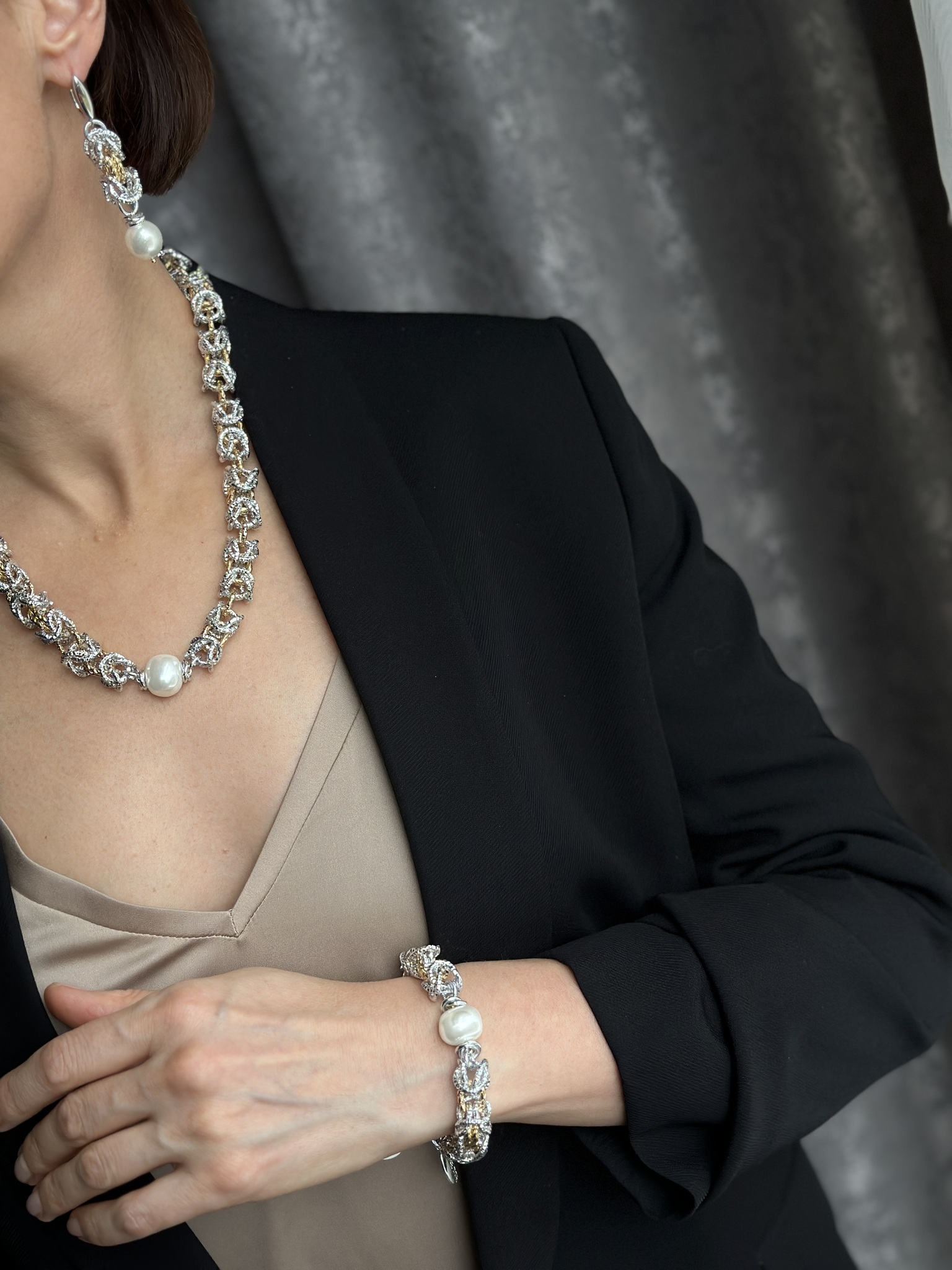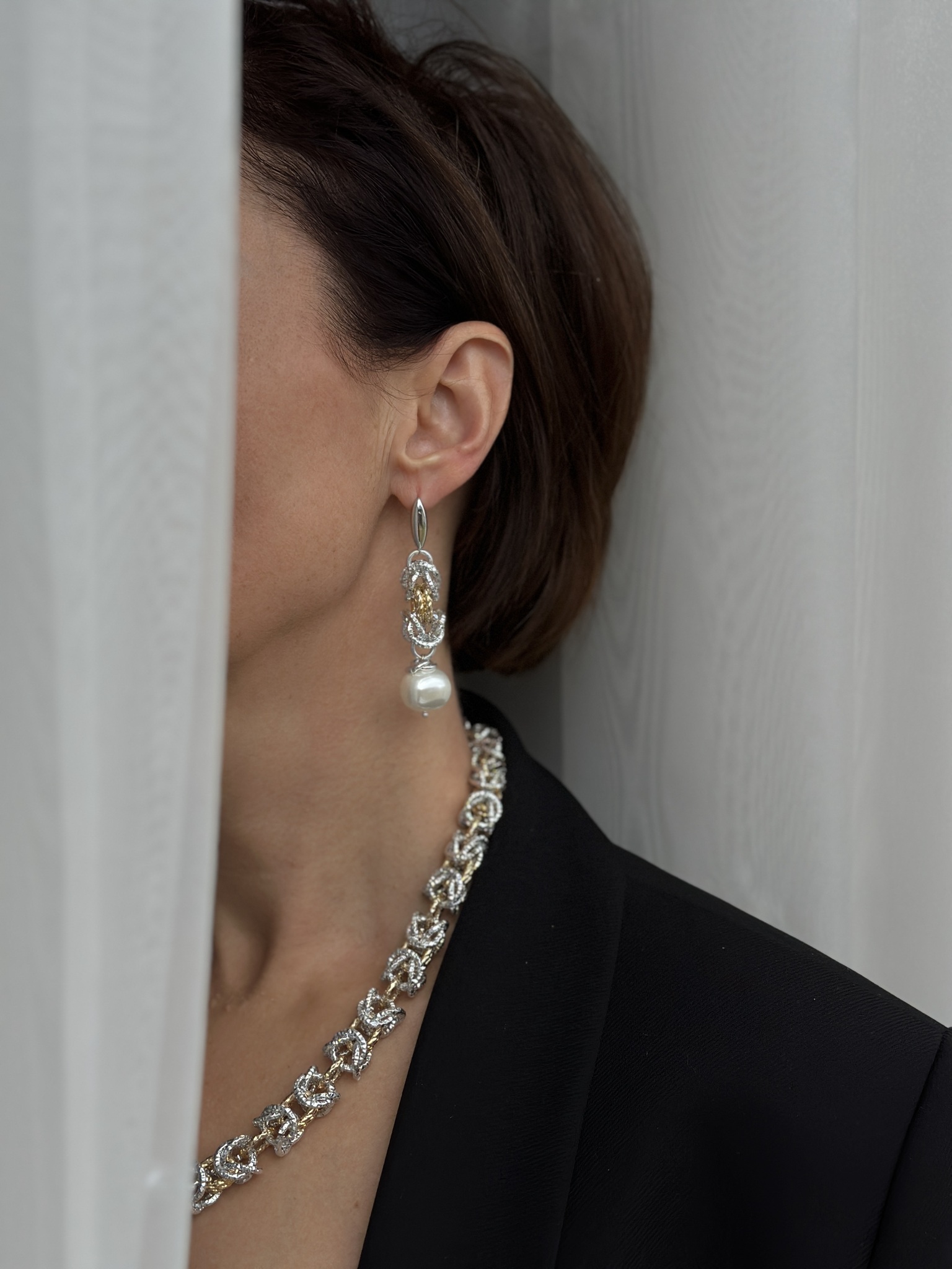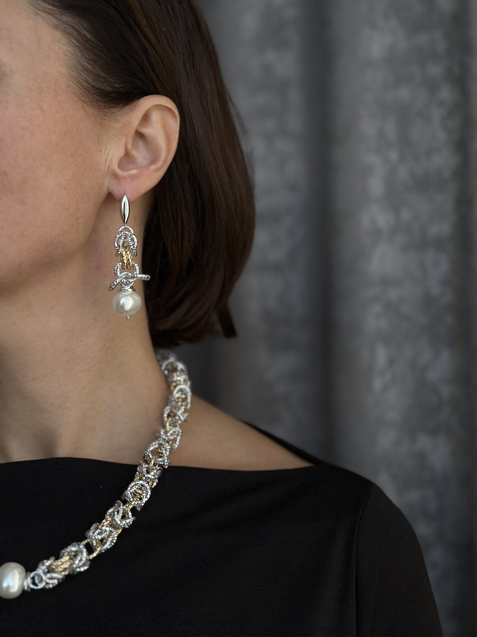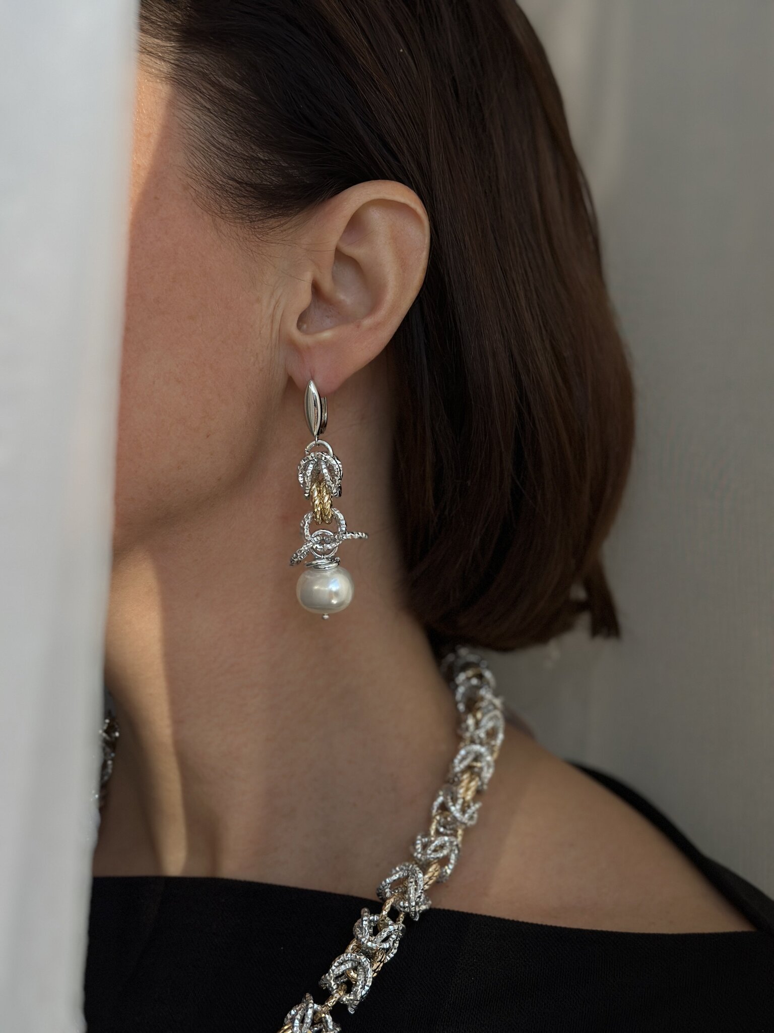 Серьги из легких гальванических цепей с жемчугом Майорка. Оттенки золото и серебро. Английский замок.
