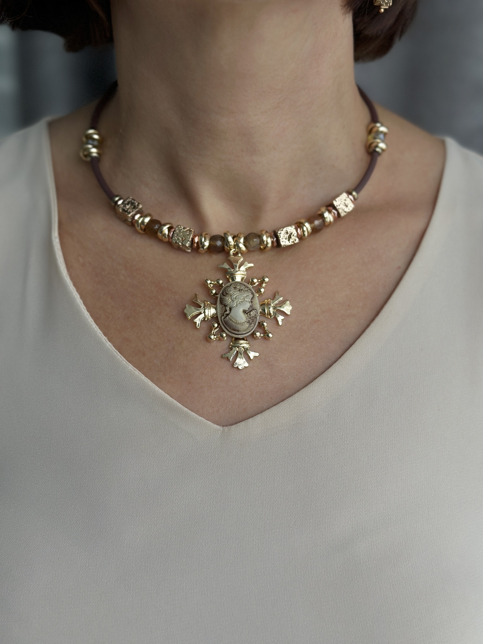 Колье с камеей из лавы и агатов. Регулировка длины.