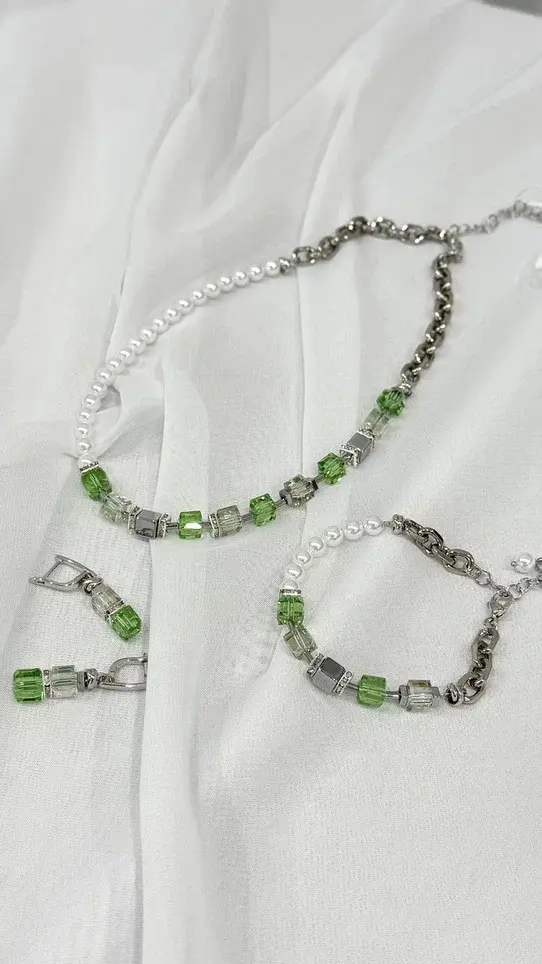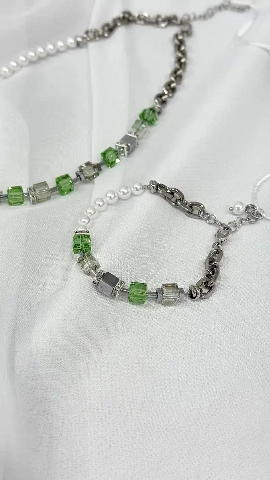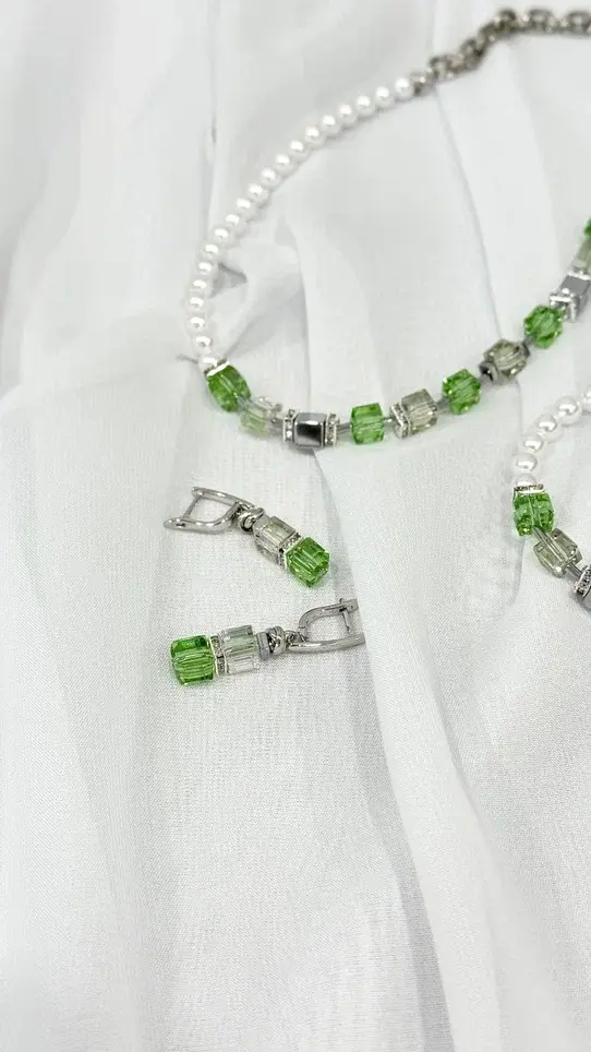 Колье асимметричное с белым жемчугом, гематитом, зелен.,салат.кубиками Swarovski, серебро. Замок карабин. Регулировка длины от 42 до 47 см.