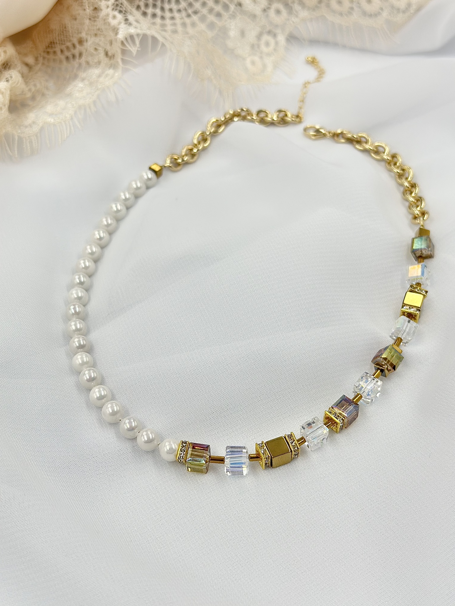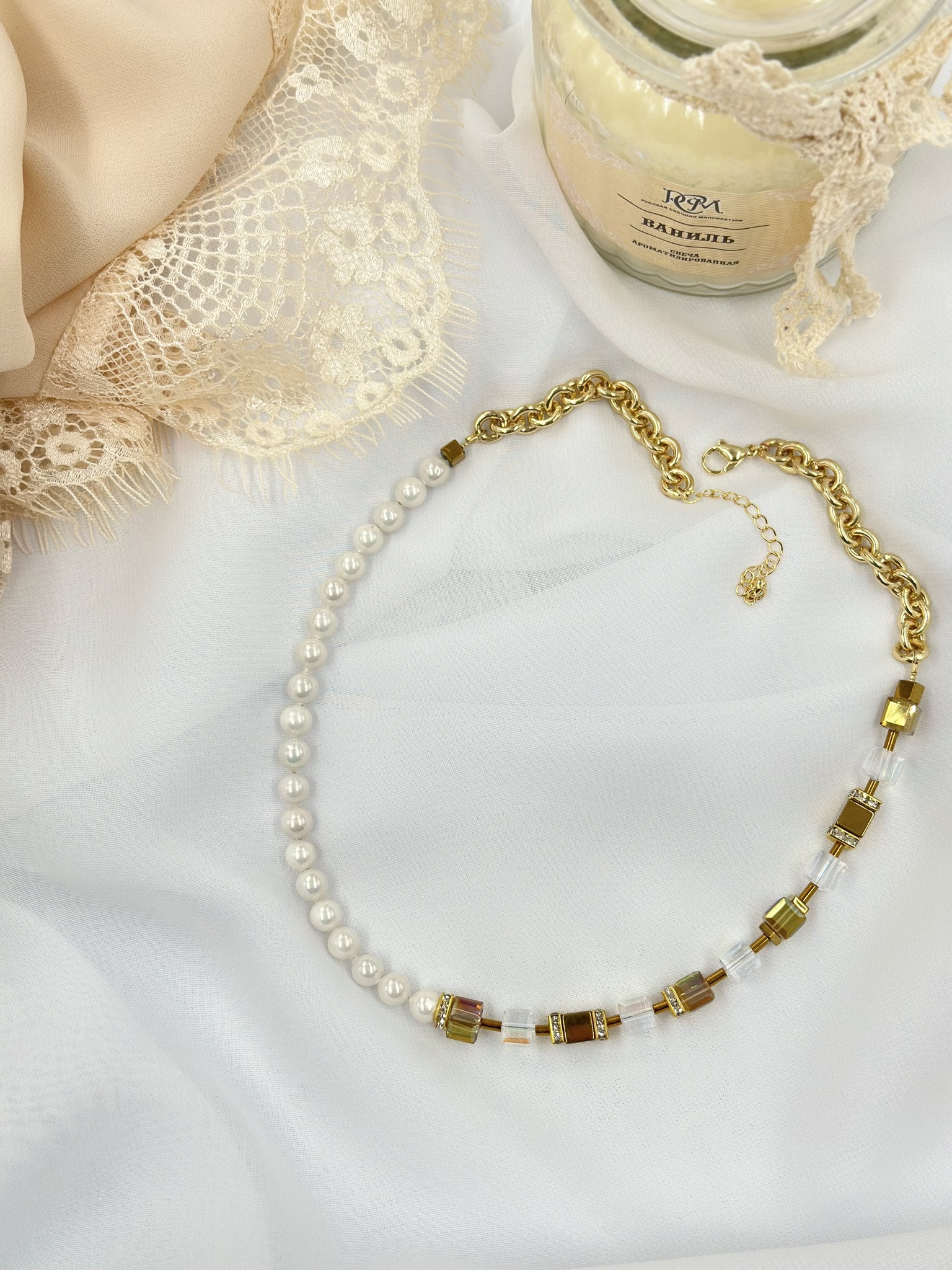 Колье ассиметричное с белым жемчугом Майорка, гематитом, с зол.и прозр.кристаллами Swarovski, золото.