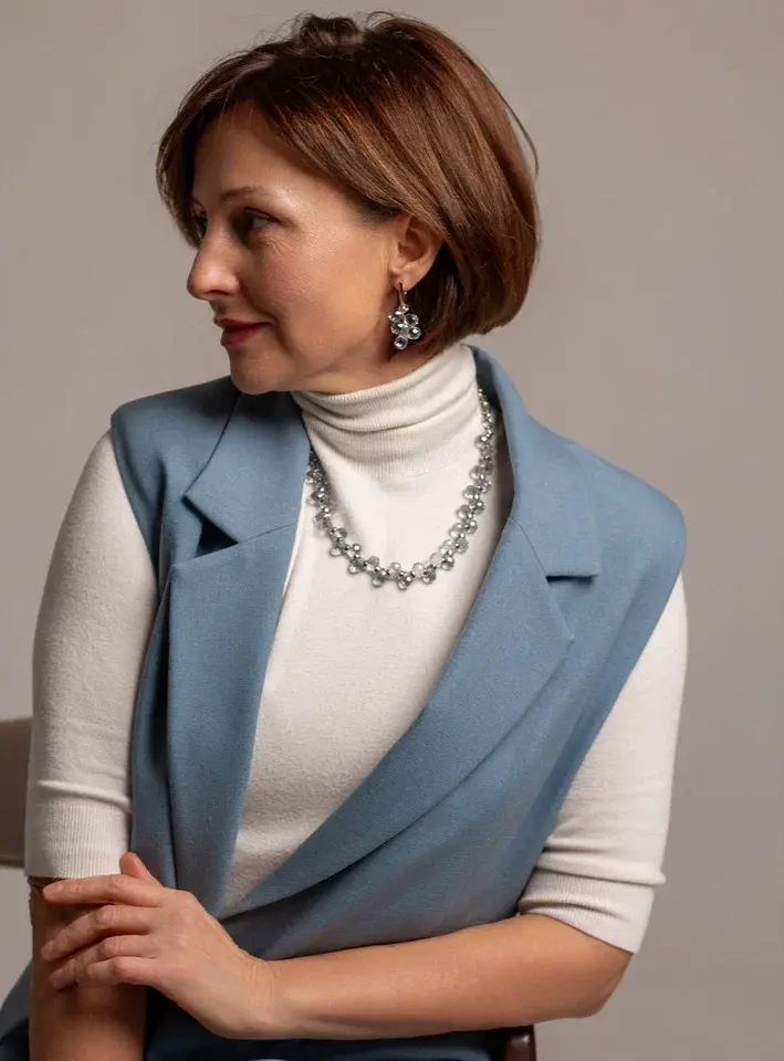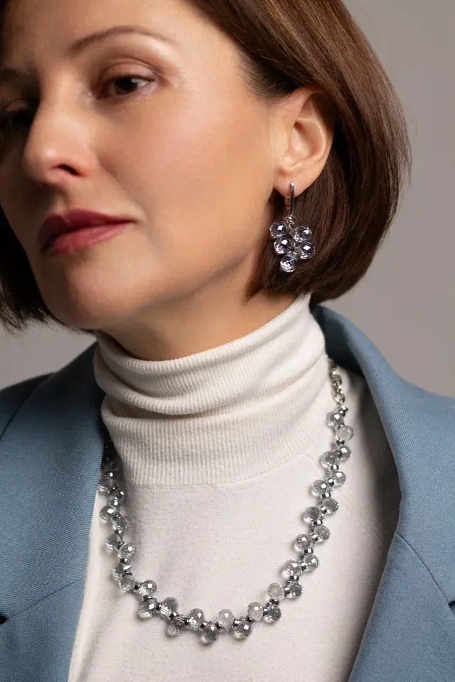 Колье "Деора" - светлый серо-голубой чешский хрусталь, оттенок серебро. Замок карабин. Регулировка длины от 46 до 51 см.