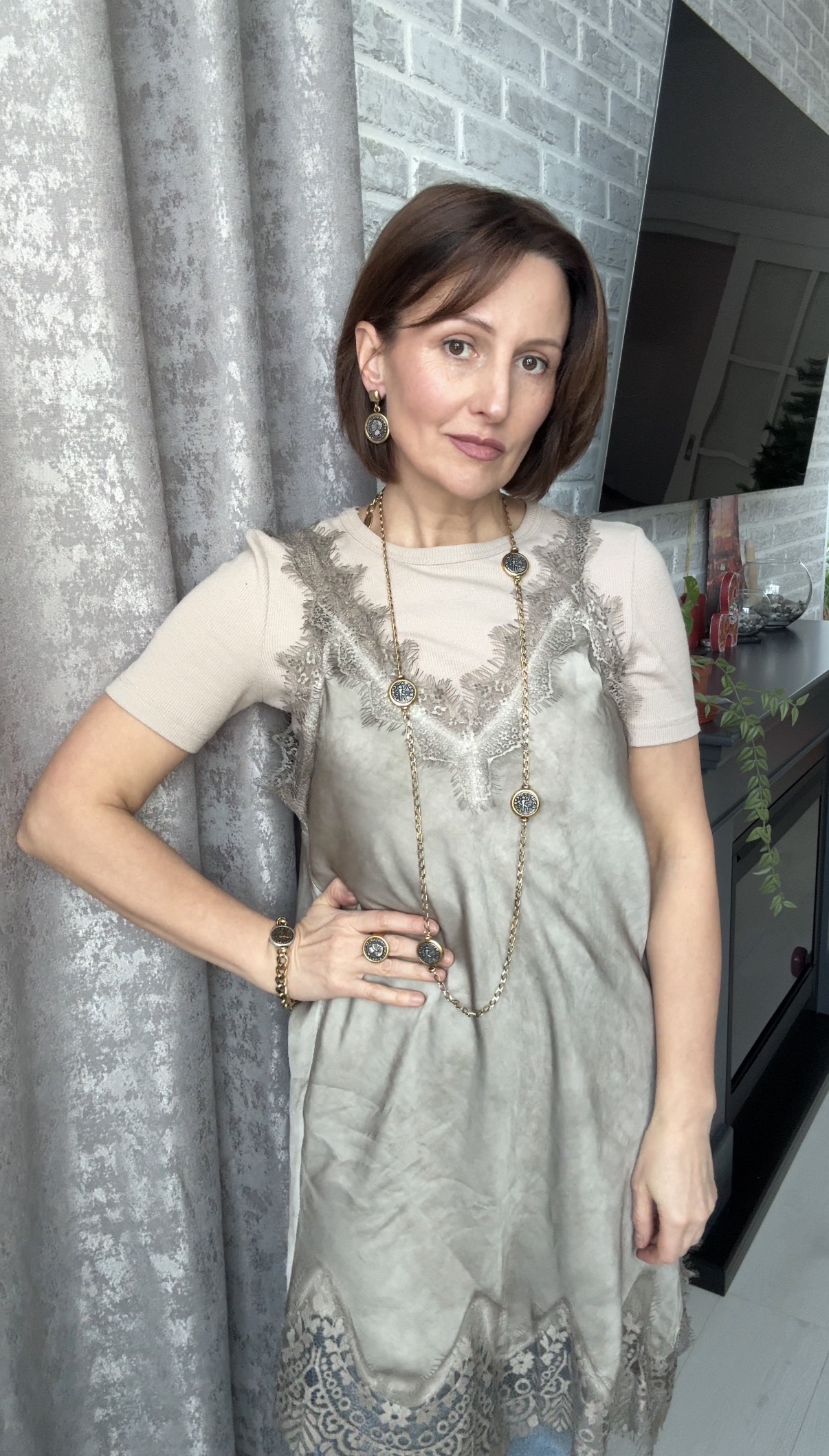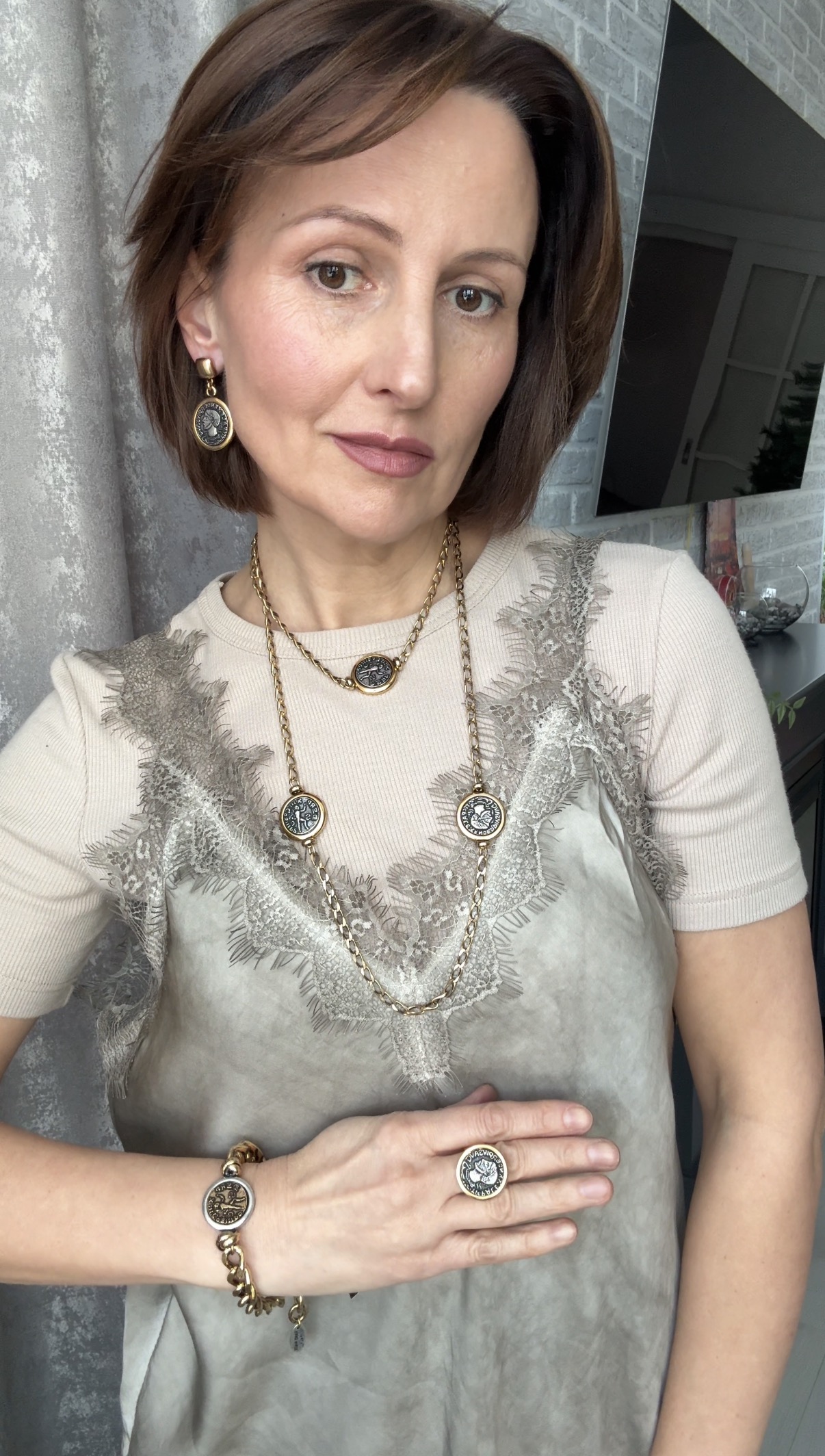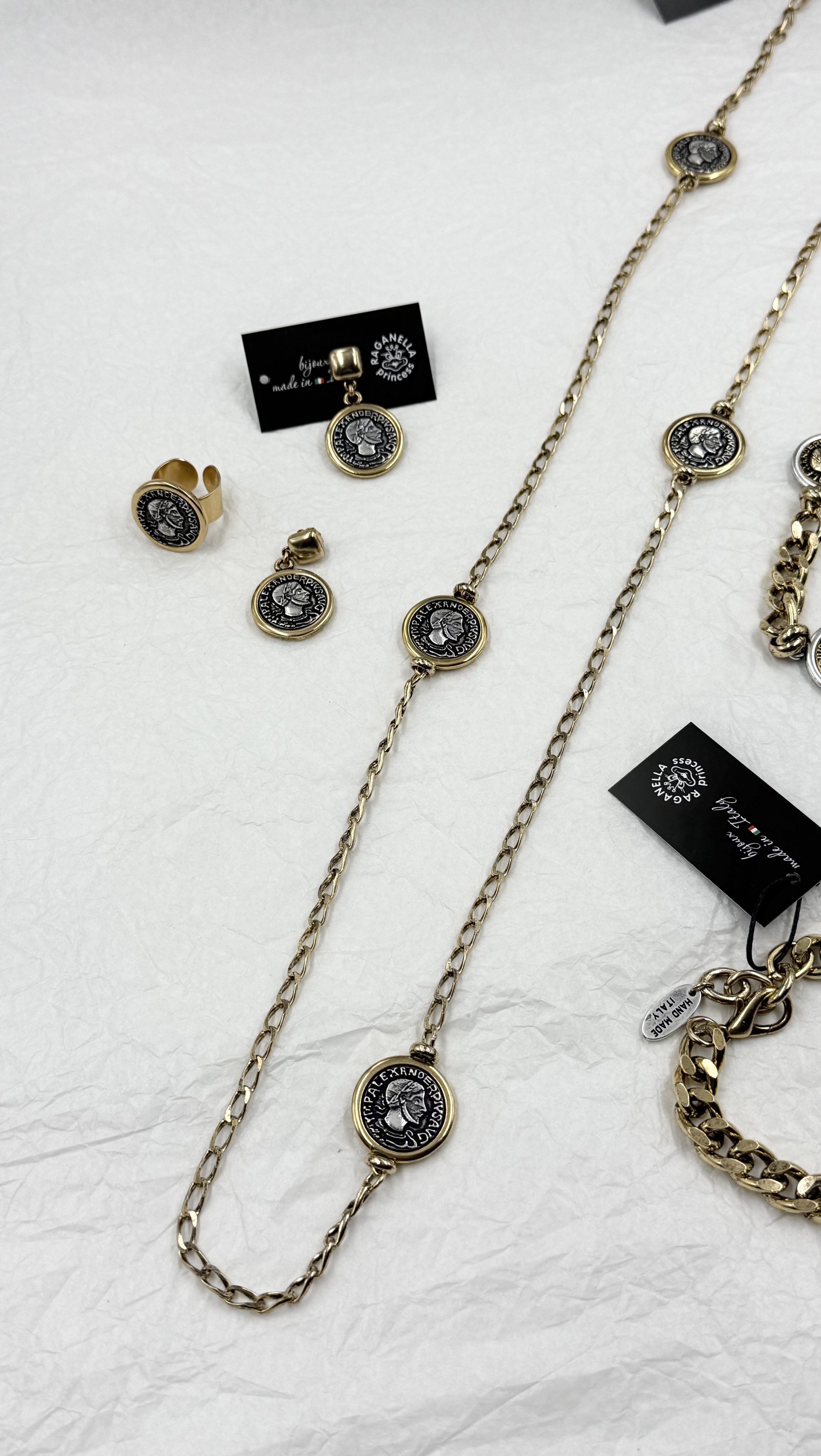 Колье длинная золотая цепь с монетами с профилем римского императора, оттенок серебро с золотым кантом.