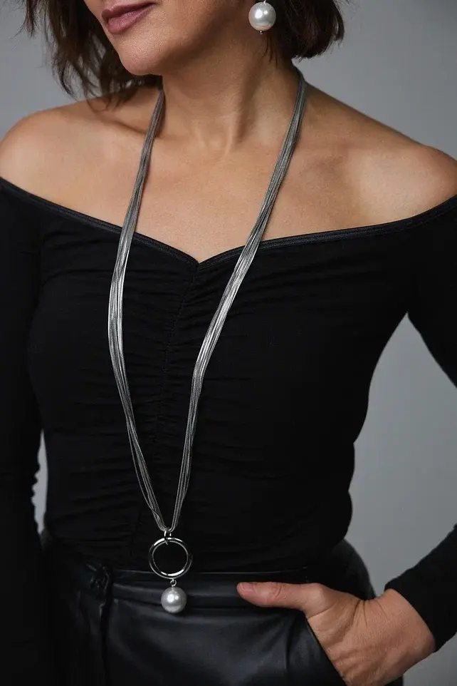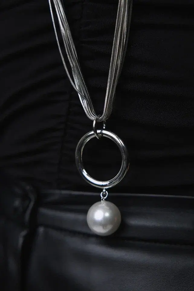 Колье длинные цепи с крупной жемчужиной, оттенок серебро. Жемчуг - имитация.