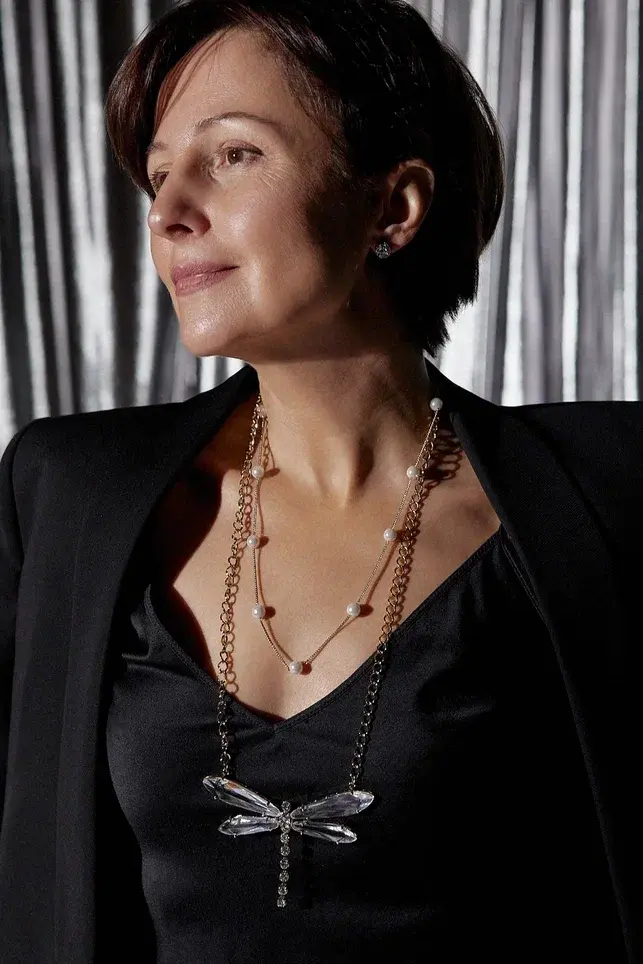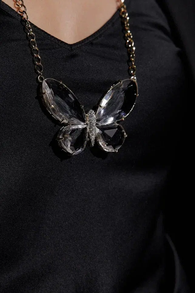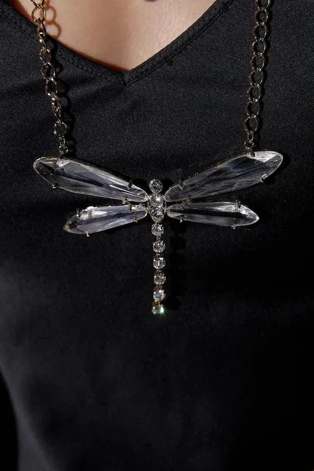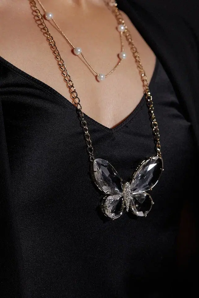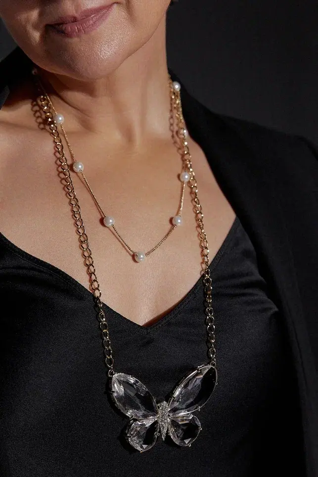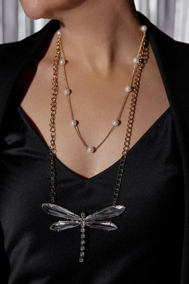 Колье два ряда с жемчугом и стрекозой из прозрачных кристаллов, оттенок золото