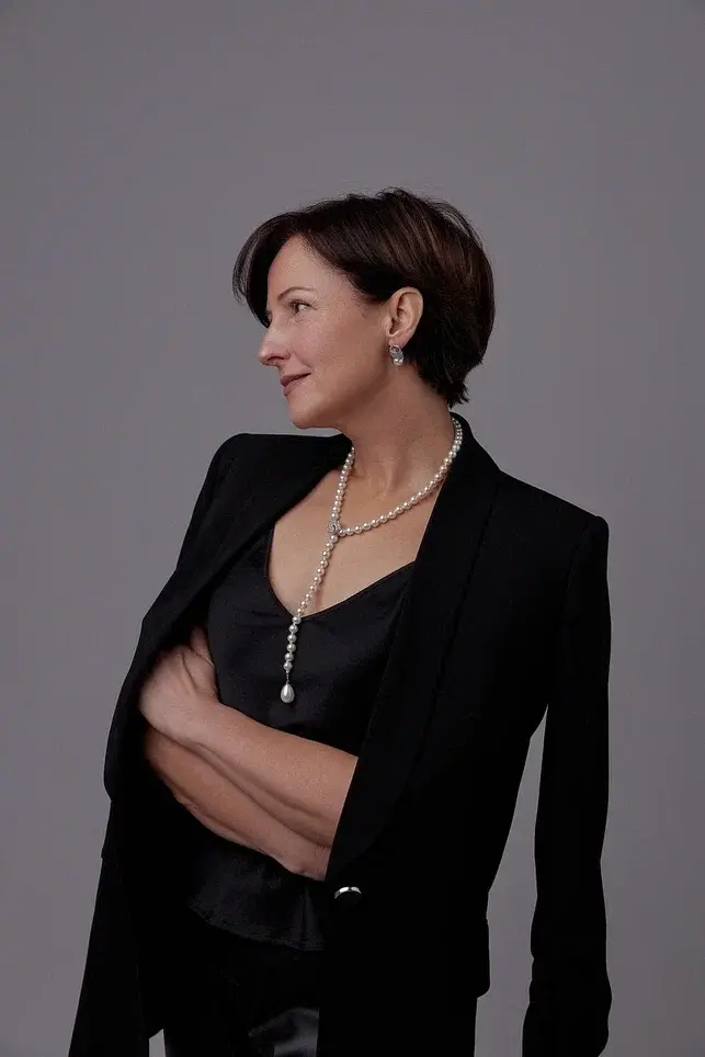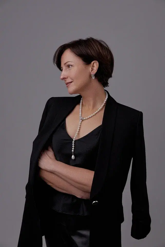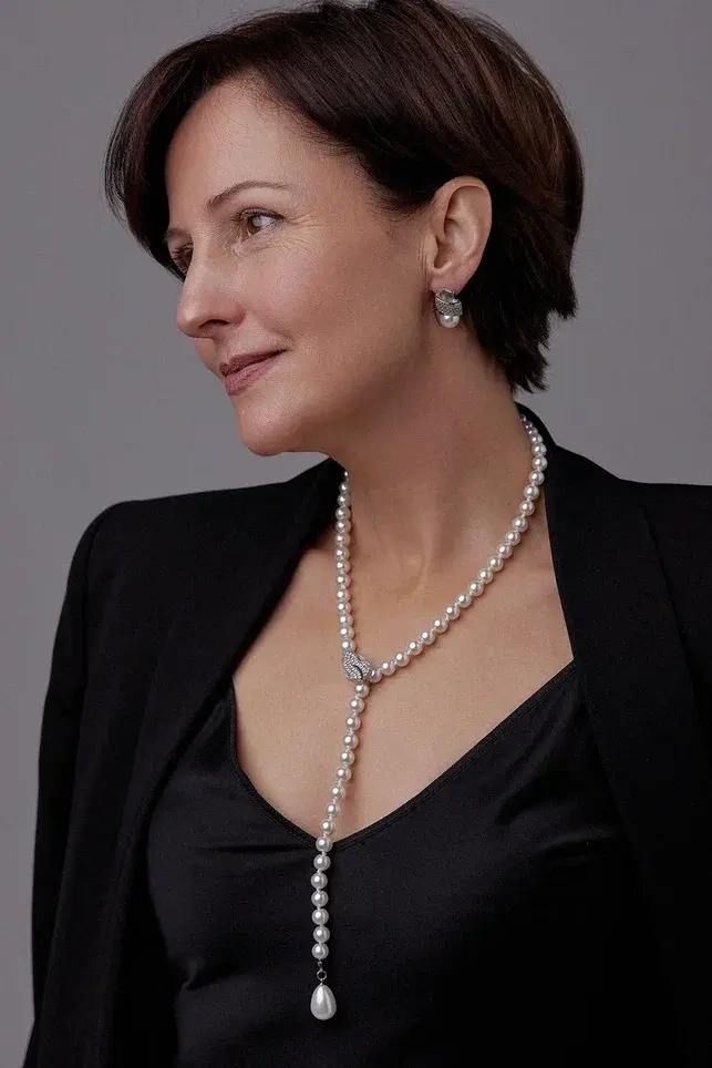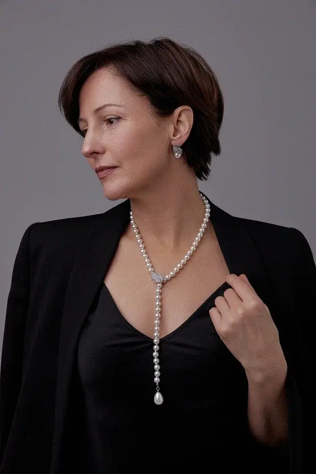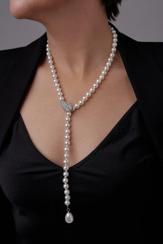 Колье - галстук из жемчуга с застежкой в форме листа из кристаллов