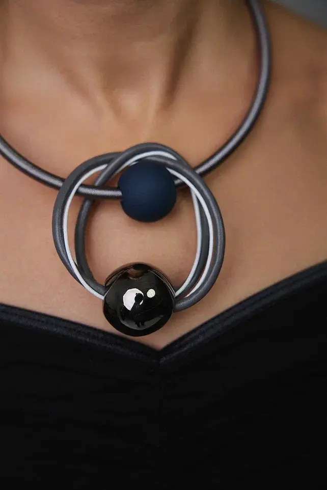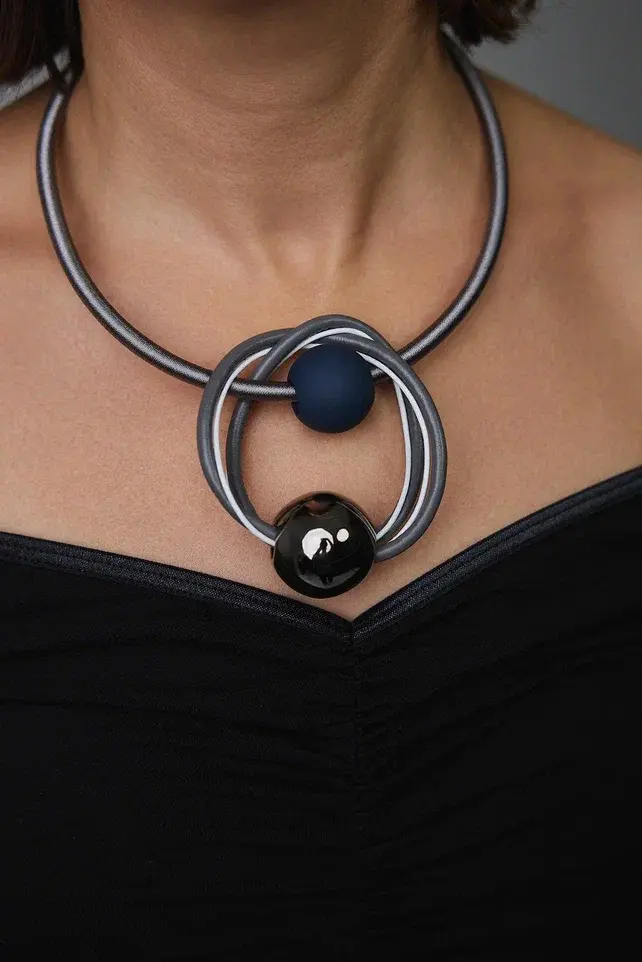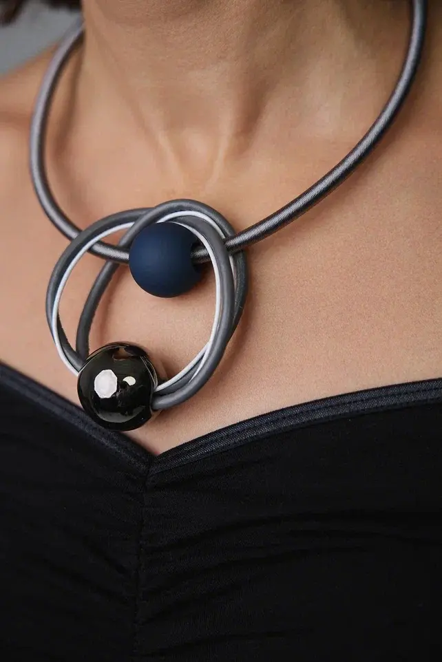 Колье графитовый и синий шары на серо-белой коже и сером текстиле. С регулировкой длины 47 - 53 см.