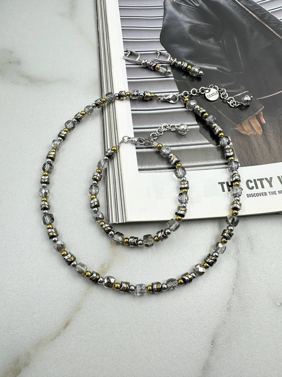 Колье с гематитом биколор и светло-серыми цирконами.