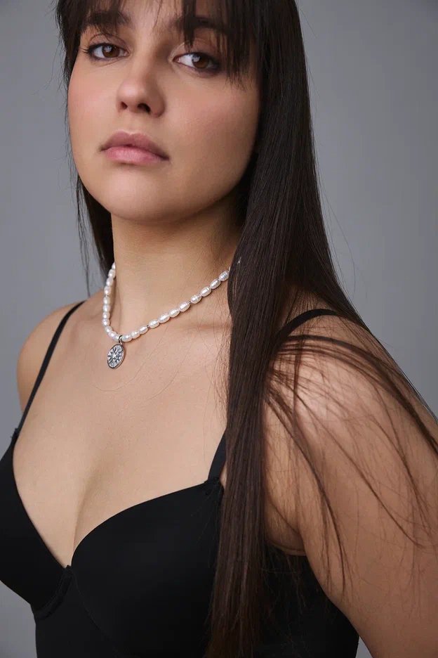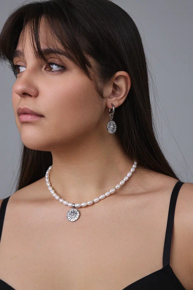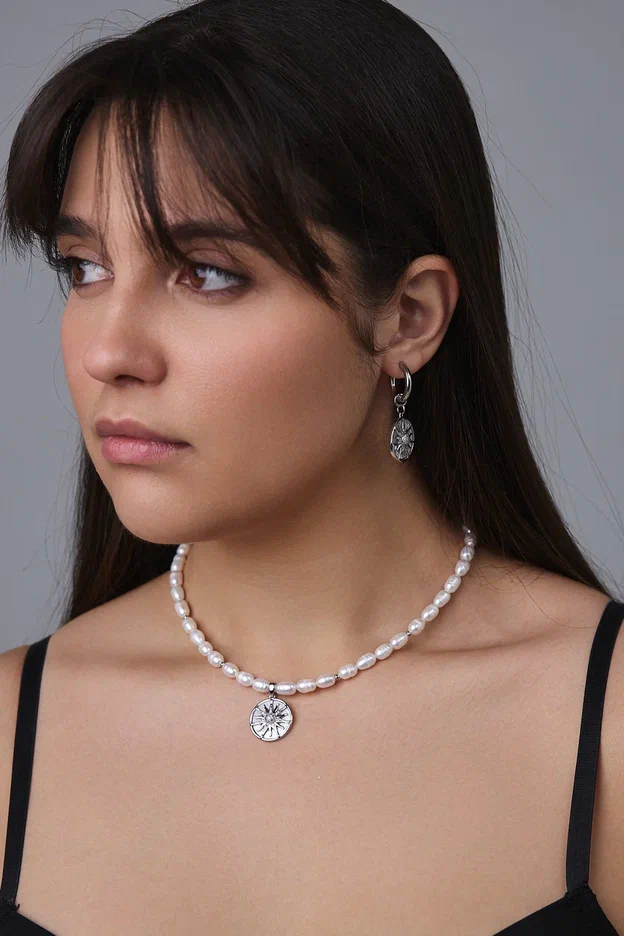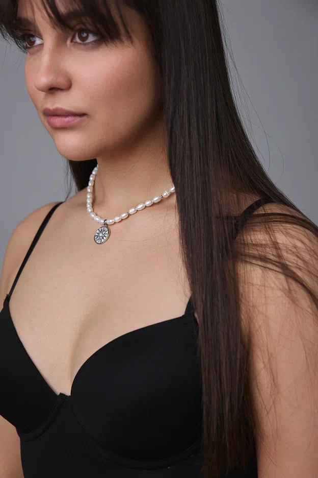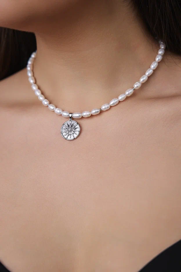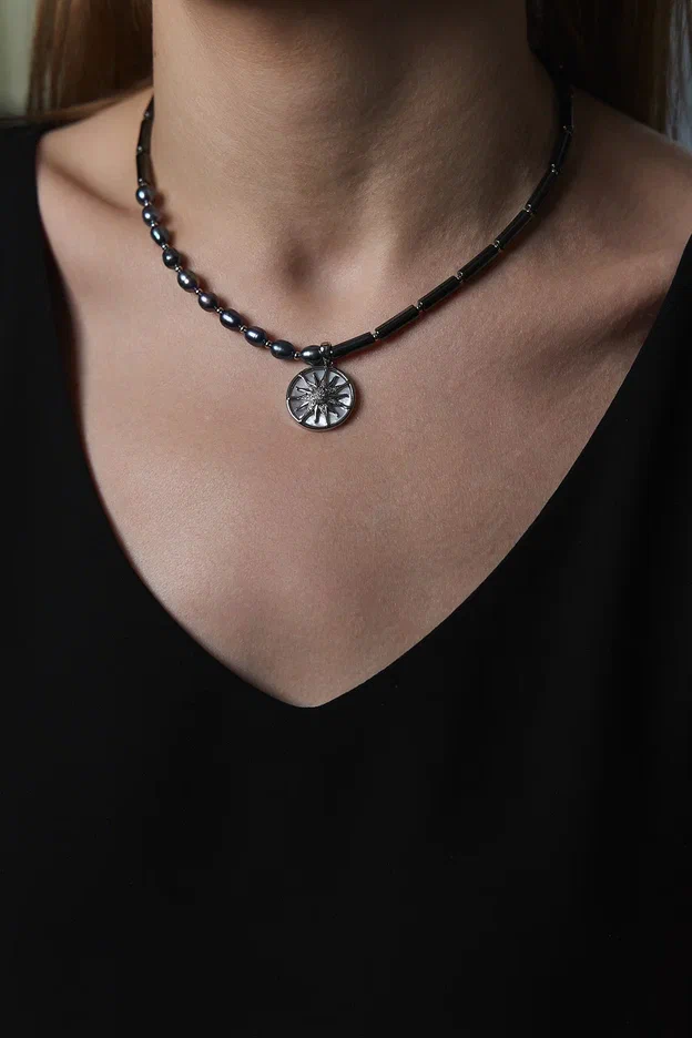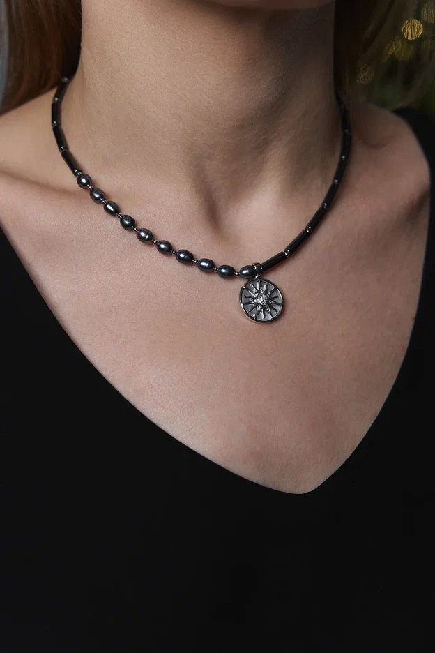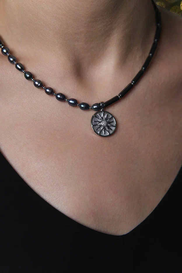Колье из гематита и "бензинового" жемчуга с кулоном из перламутра и цирконов с солнцем, серебро
