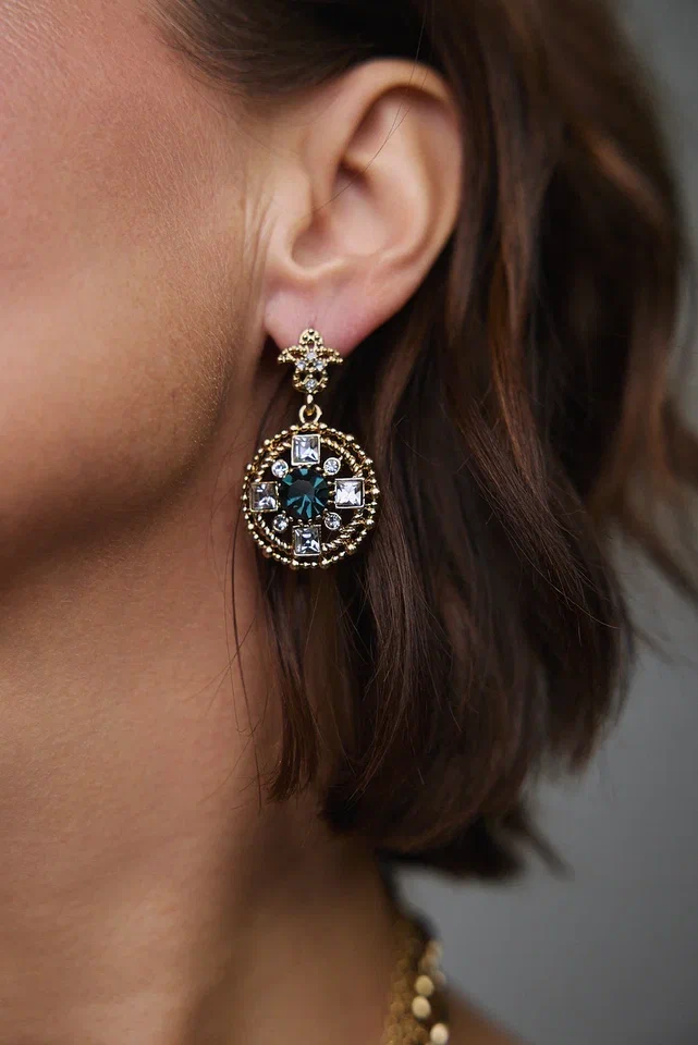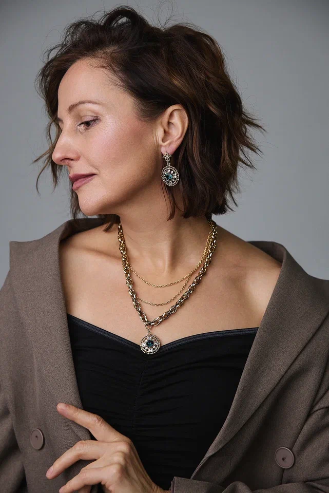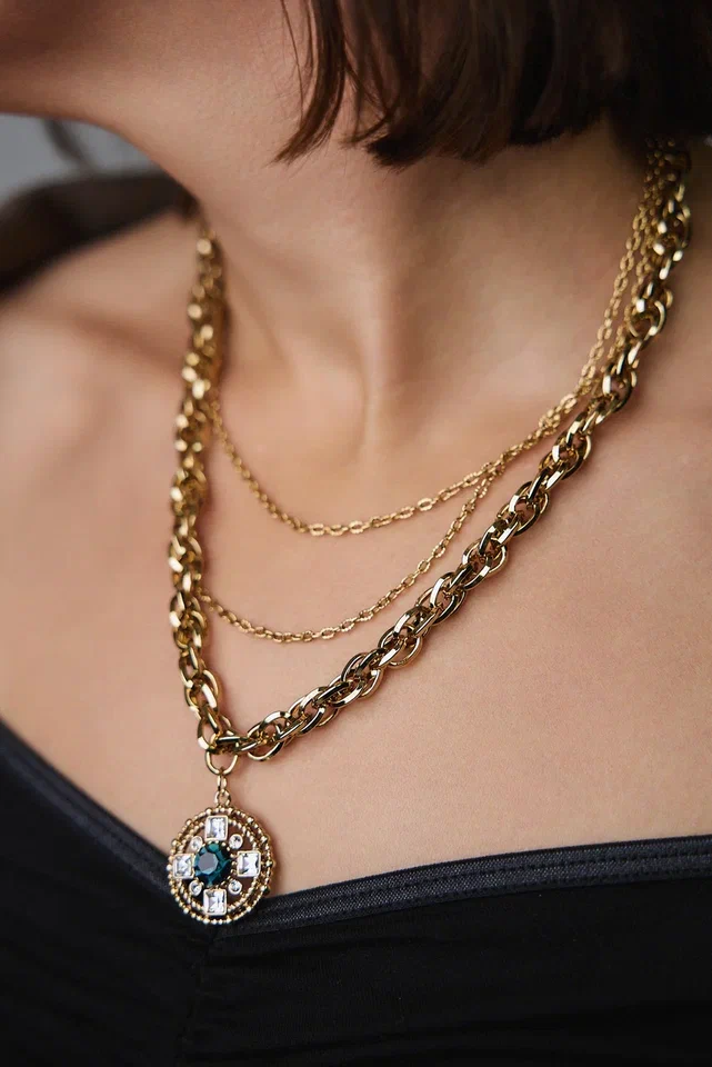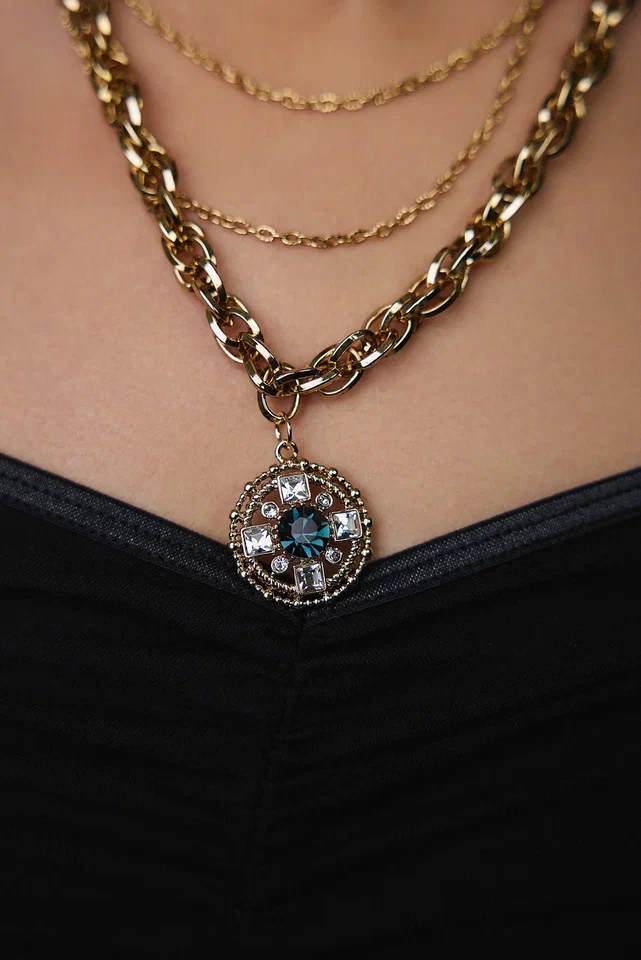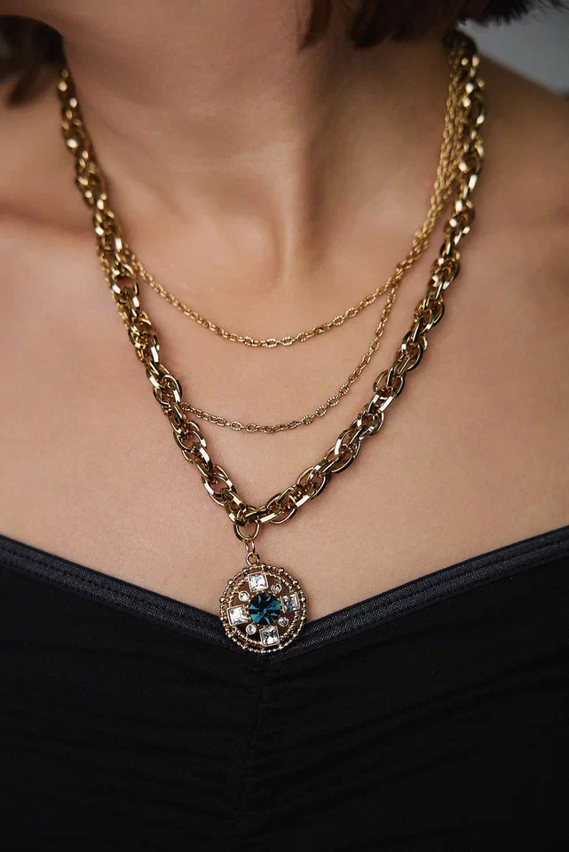 Колье из витой и тонких цепочек с круглым кулоном с синими и светлыми кристаллами
