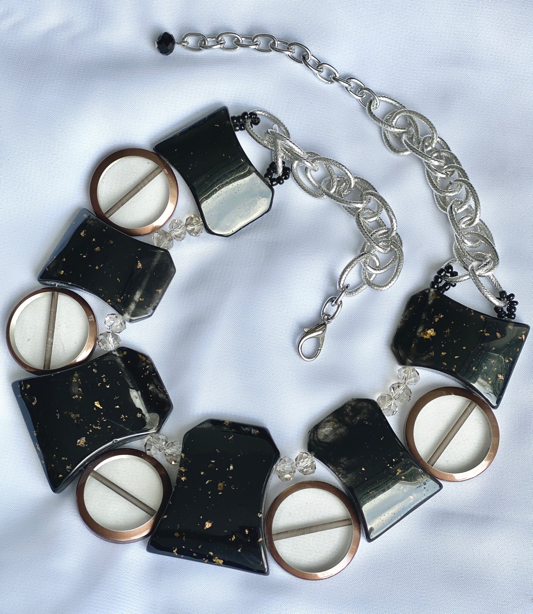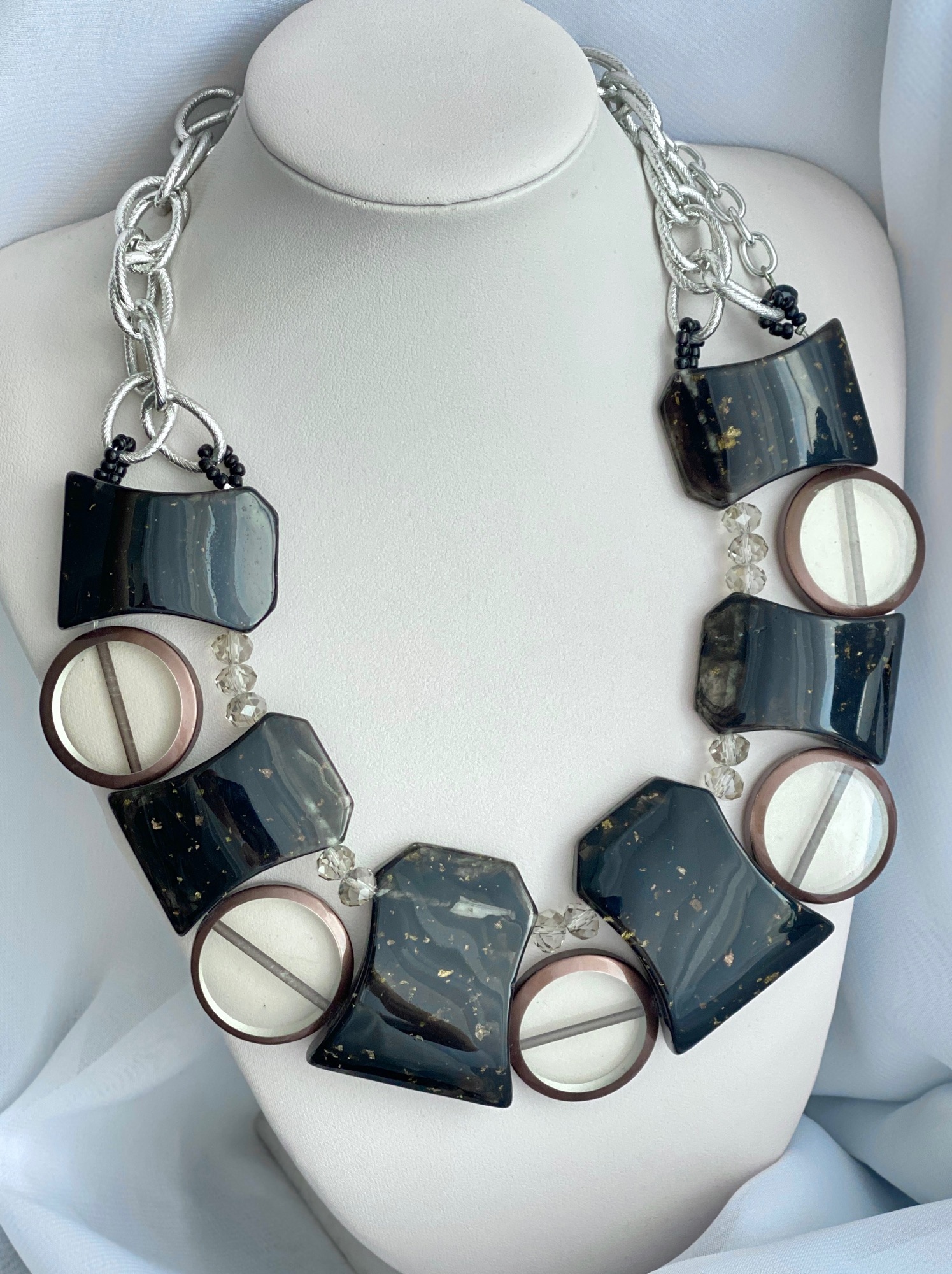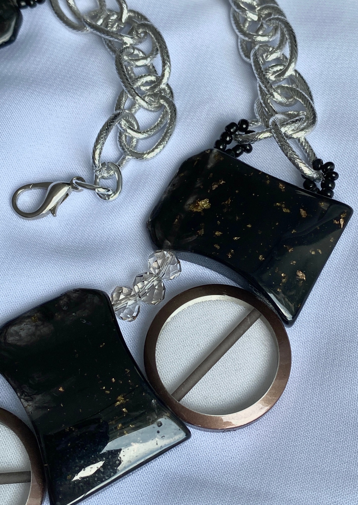 Колье плоское с пластиком и ювелирным стеклом. Оттенок серебро.