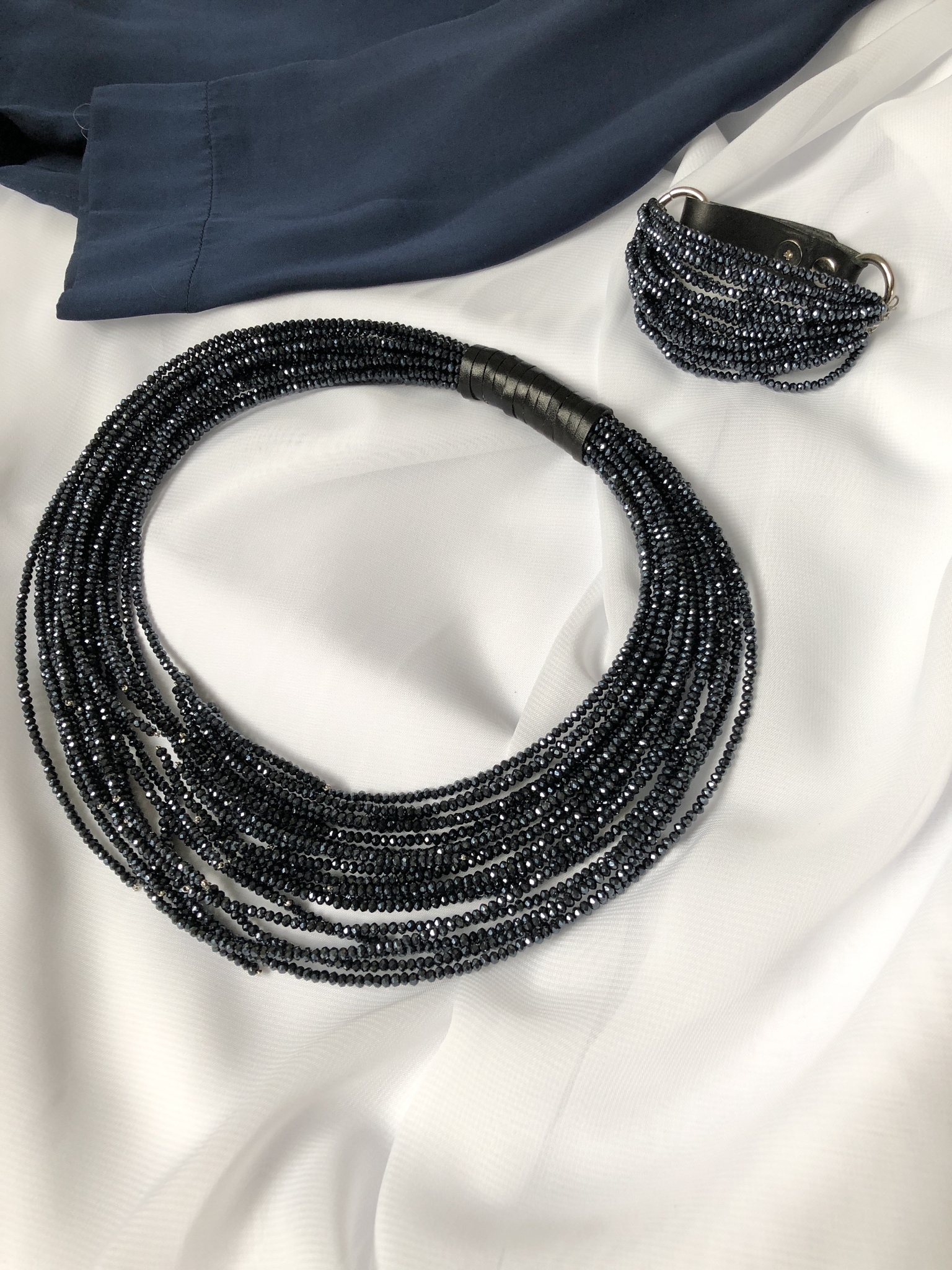 Колье "лапы", венецианское стекло бисерной огранки, оттенок чернильный. Натуральная итальянская кожа растительного дубления.