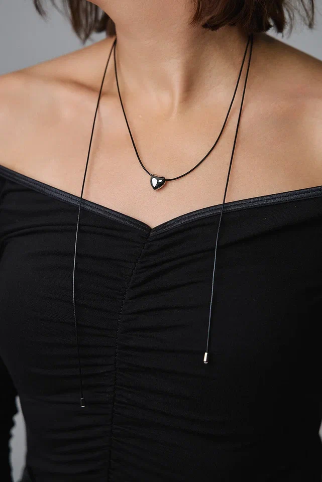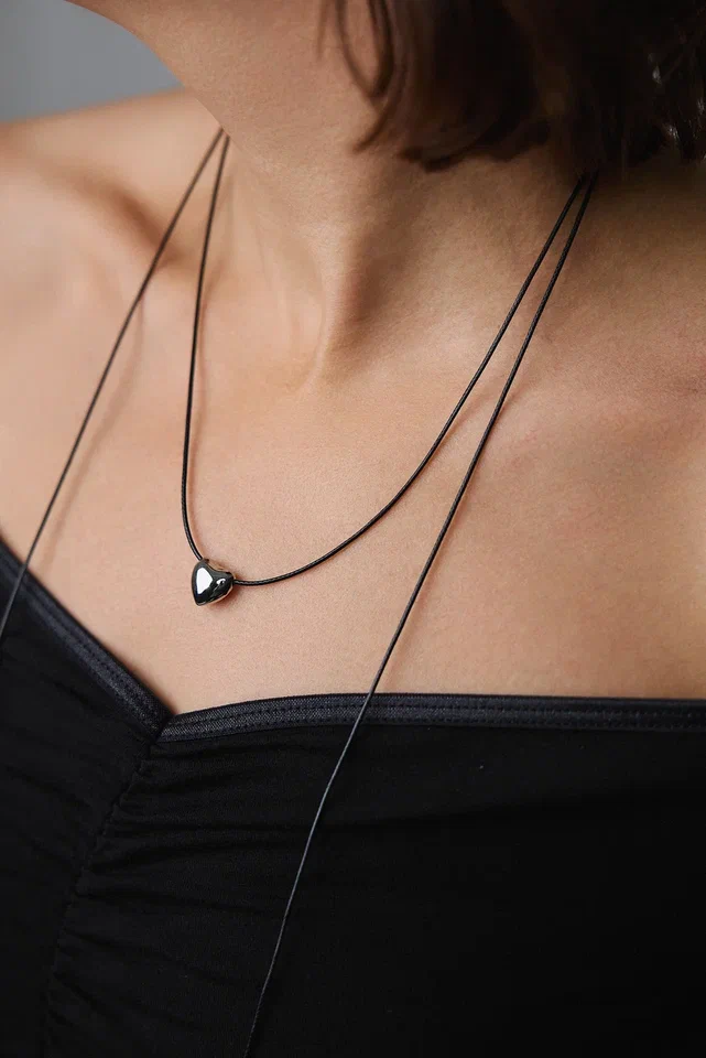 Колье маленькое серебряное сердце на черном текстильном шнурке с бегунком