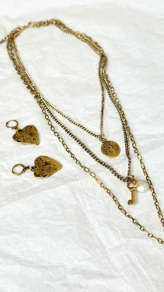Колье трехрядное с подвесами. Длина верхней цепочки с монетой - 46 см; средней с жемчужиной и ключом - 56 см; нижней с сердцем - 68 см. Регулировка длины с помощью дополнительной цепочки - 5 см. Оттенок золото.