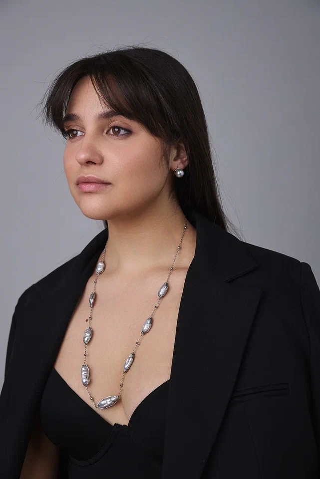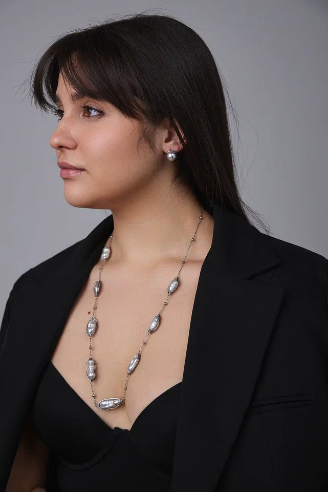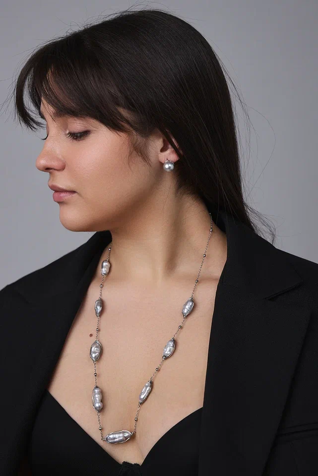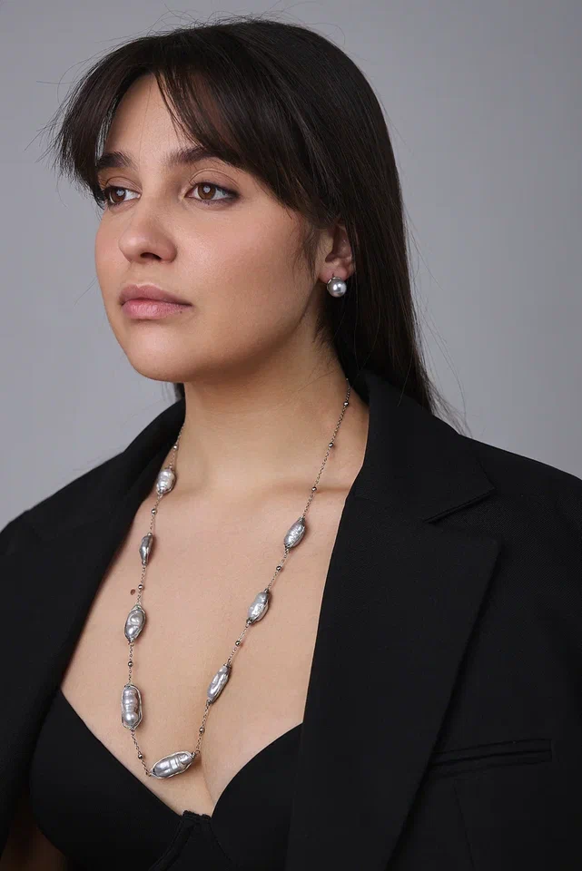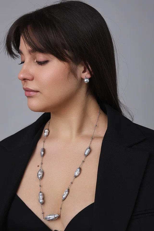 Светло-серые барочные жемчужины, обладающие неповторимой красотой природных оттенков, изящно располагаются на серебряной нити, создавая нежное сияние.