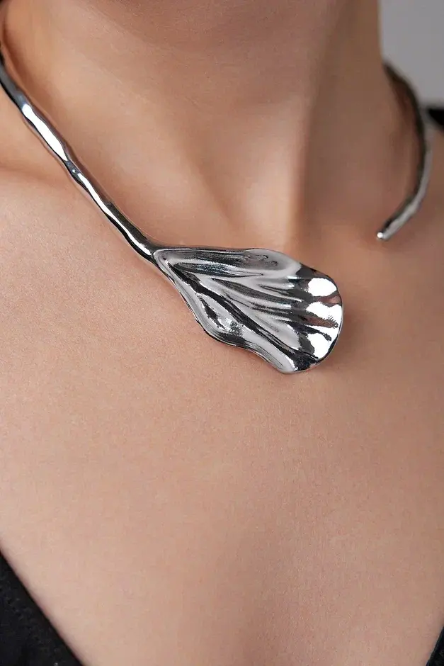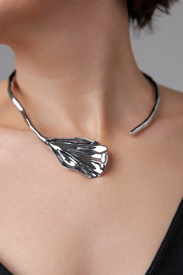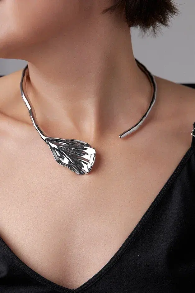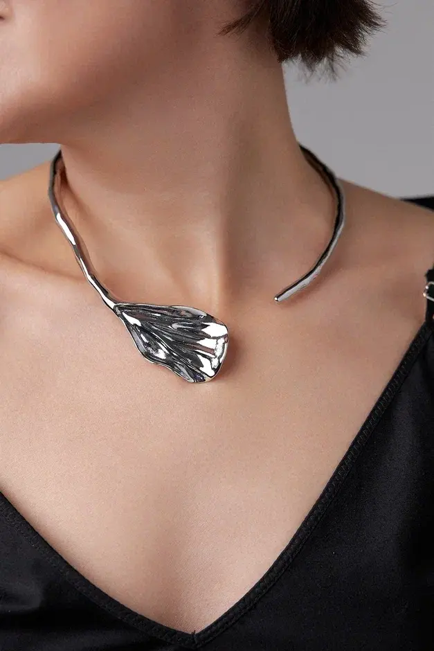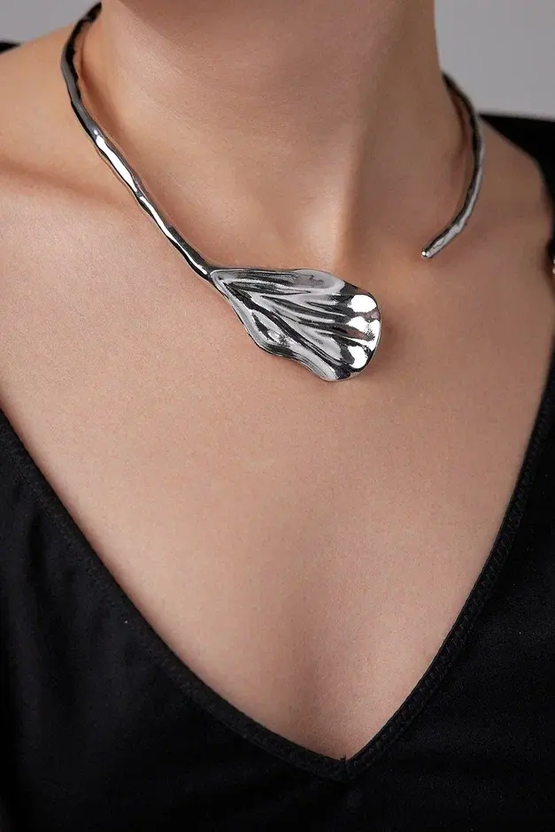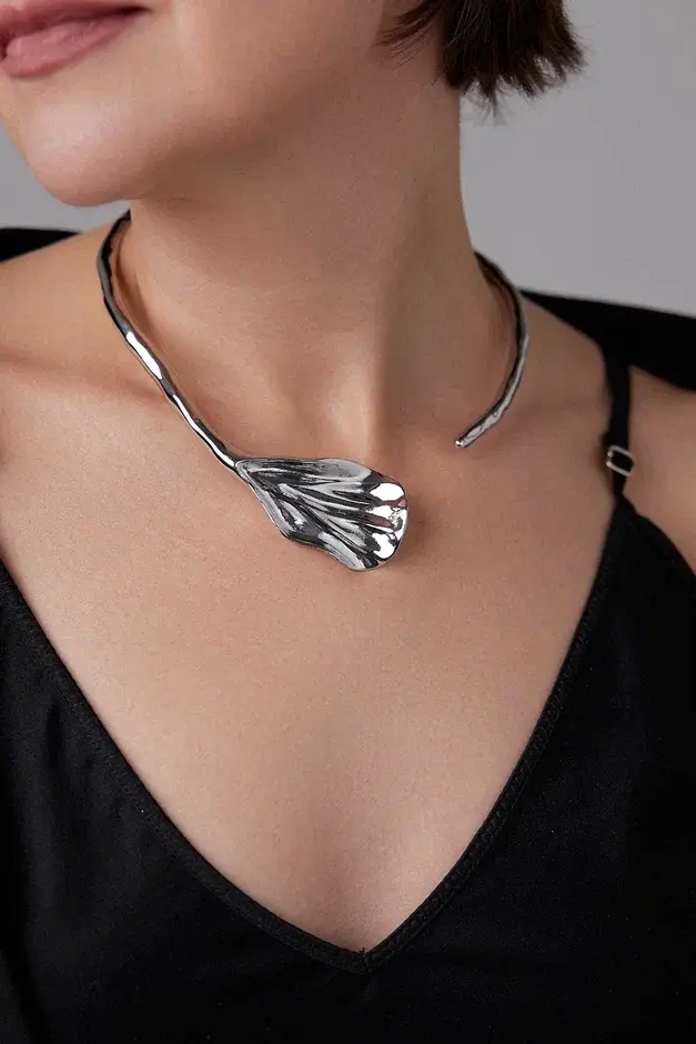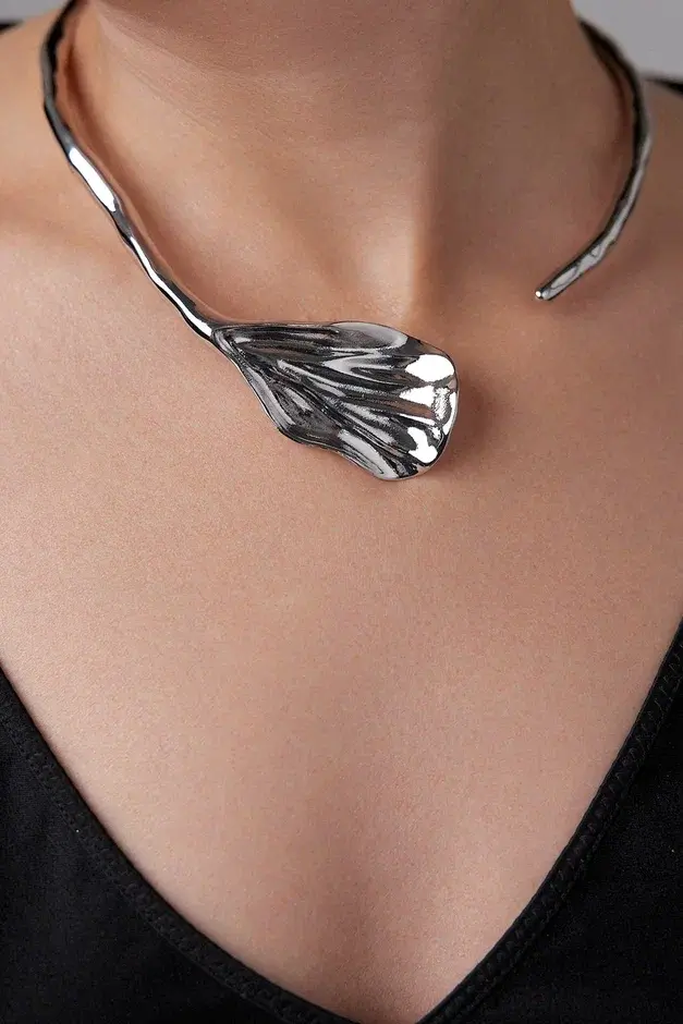 Колье-обруч Flora Belissima ассиметричный плоский лепесток, оттенок серебро