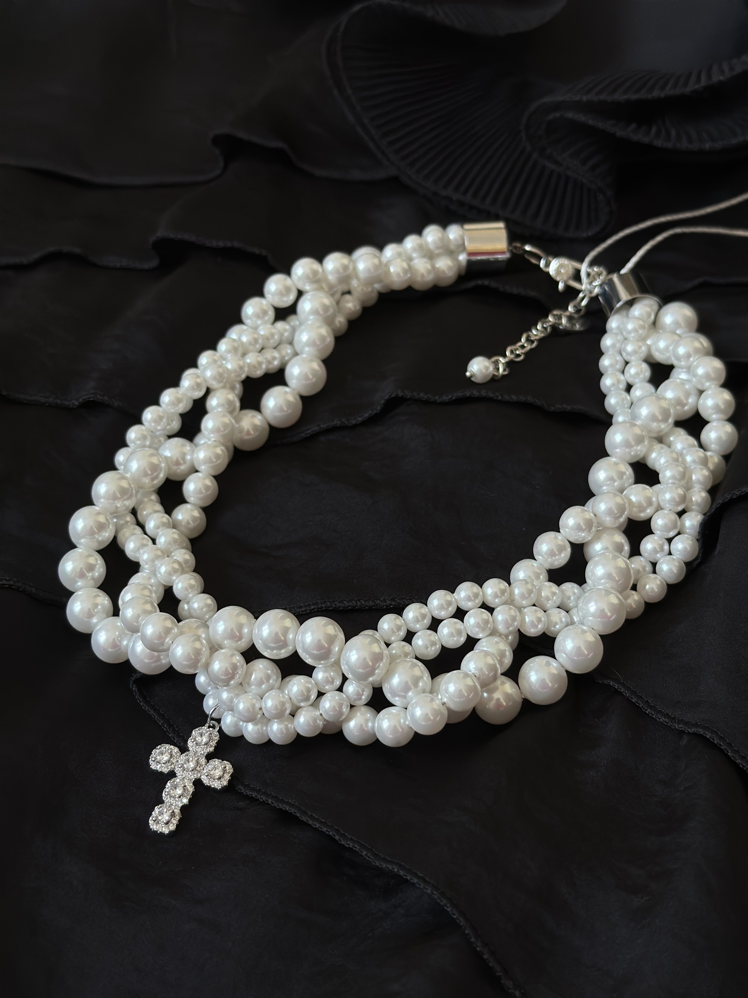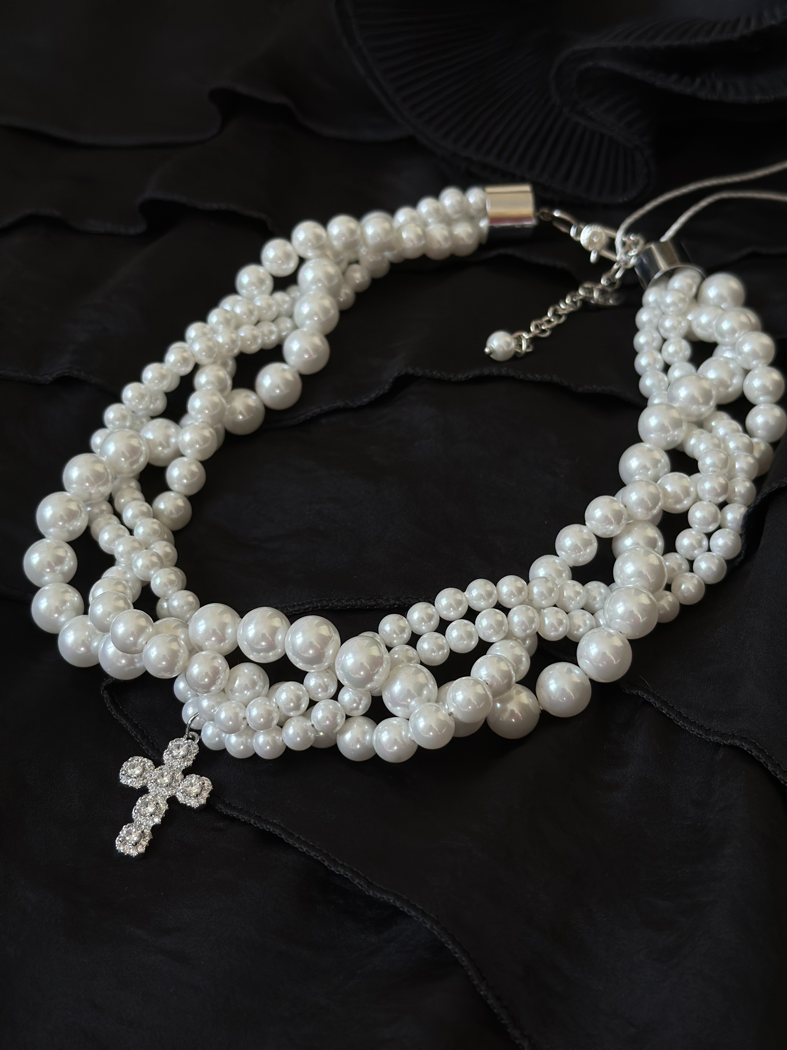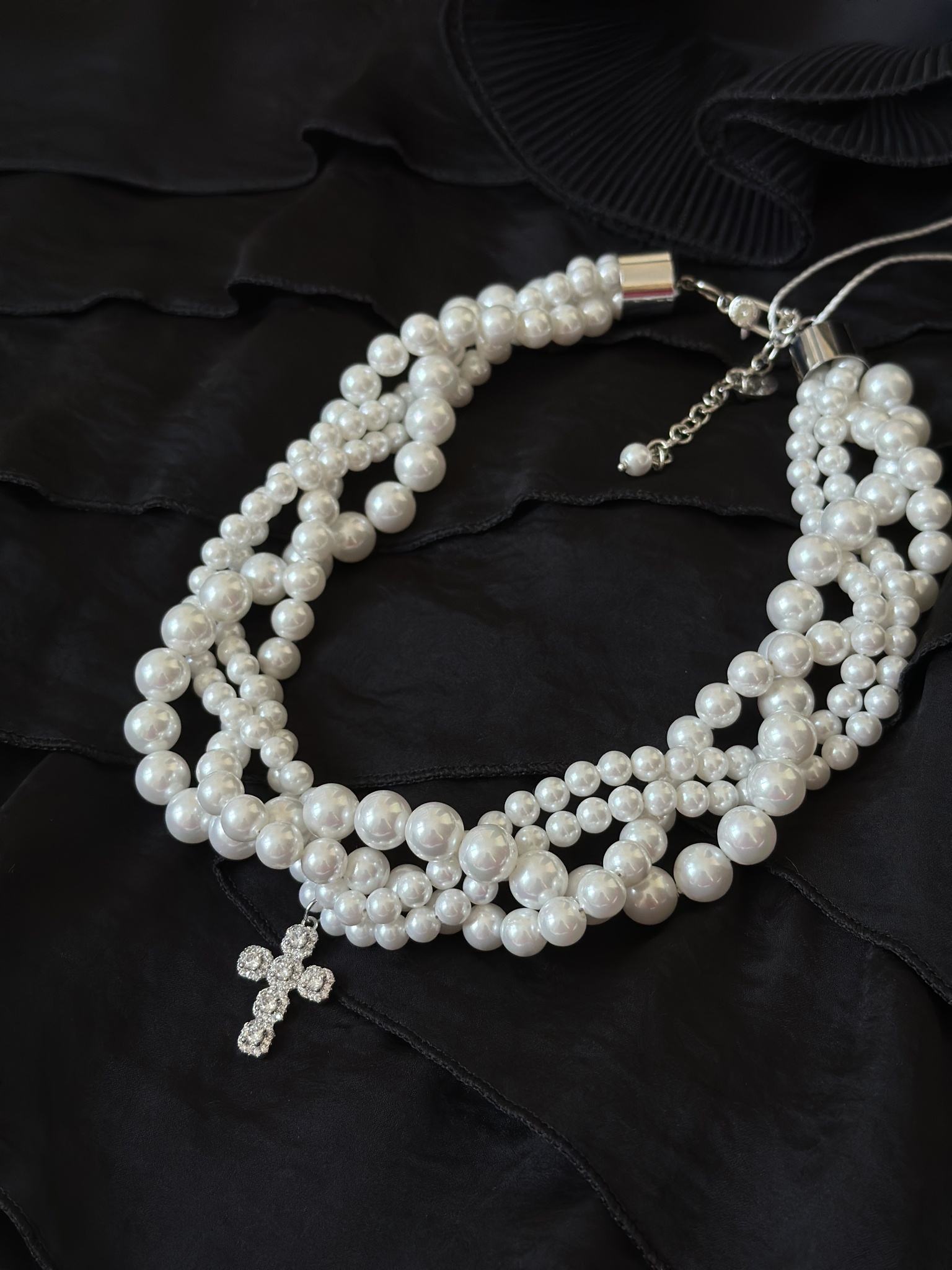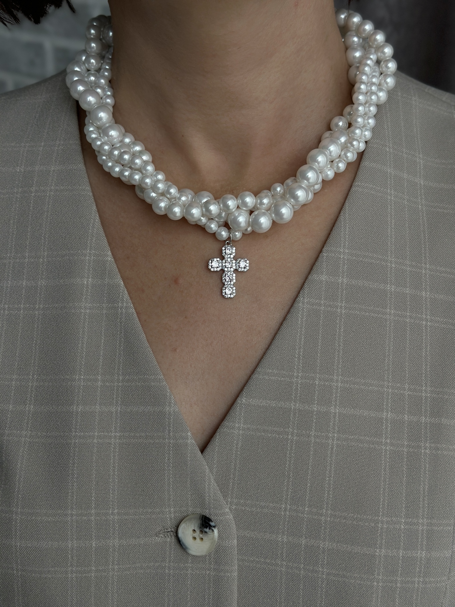 Элегантное колье "ОДРИ" с переплетенными нитями жемчуга и декоративным крестом из цирконов в серебряной ювелирной закрепке. Длина линии регулируется от 40 до 48 см, а размер креста составляет 2,5 х 1,5 см. Уникальный аксессуар для стильных и уверенных в себе женщин!