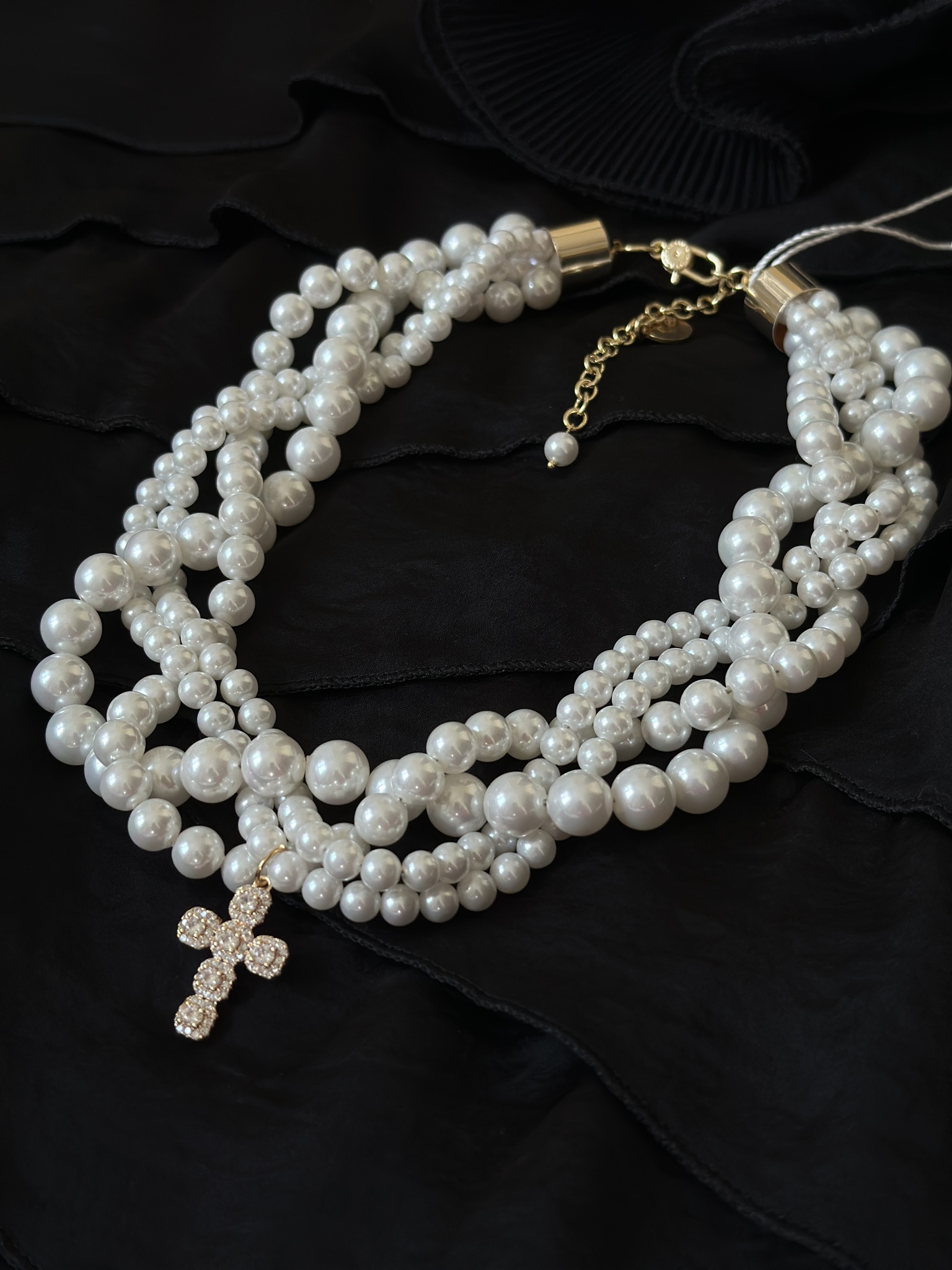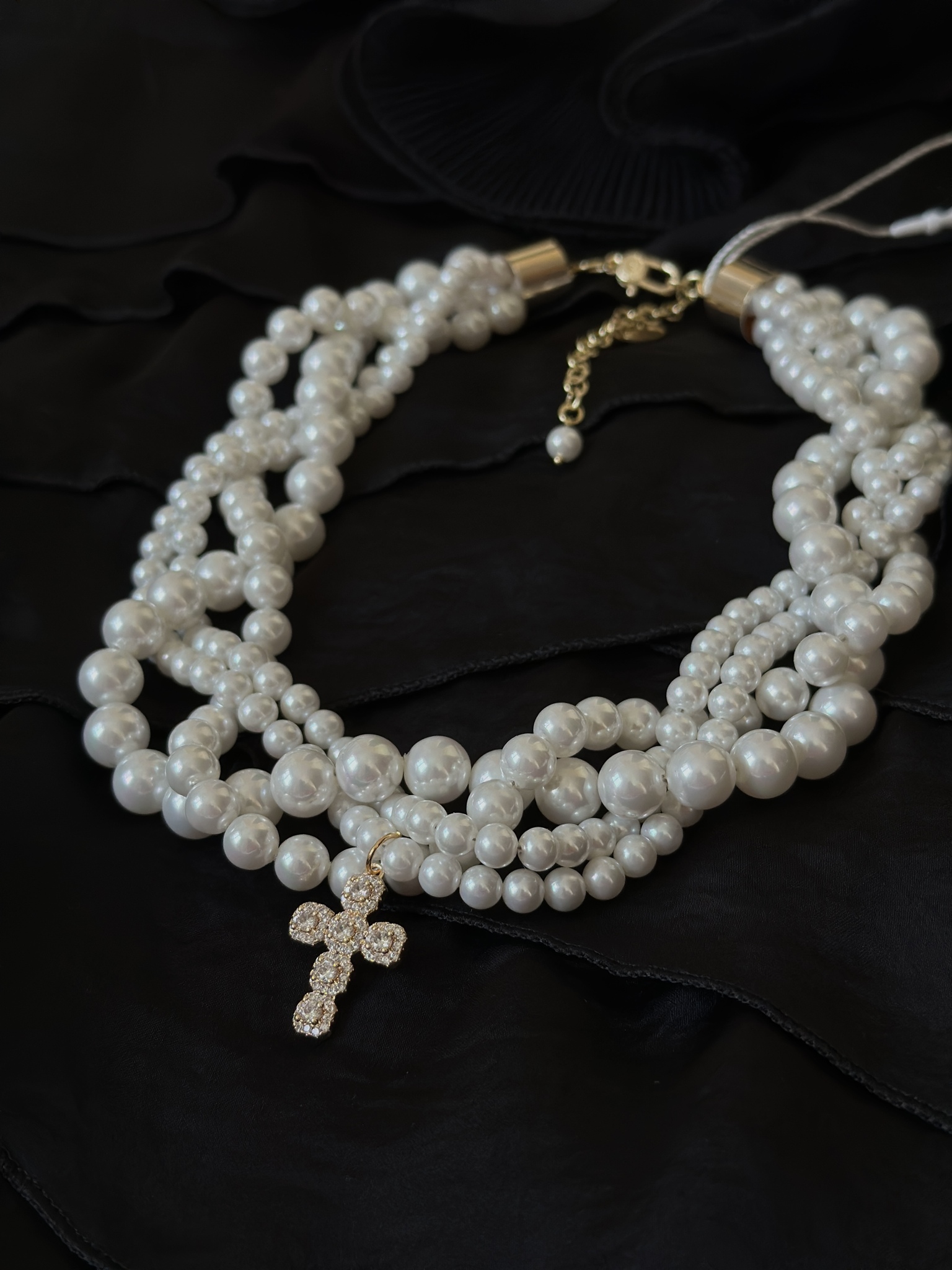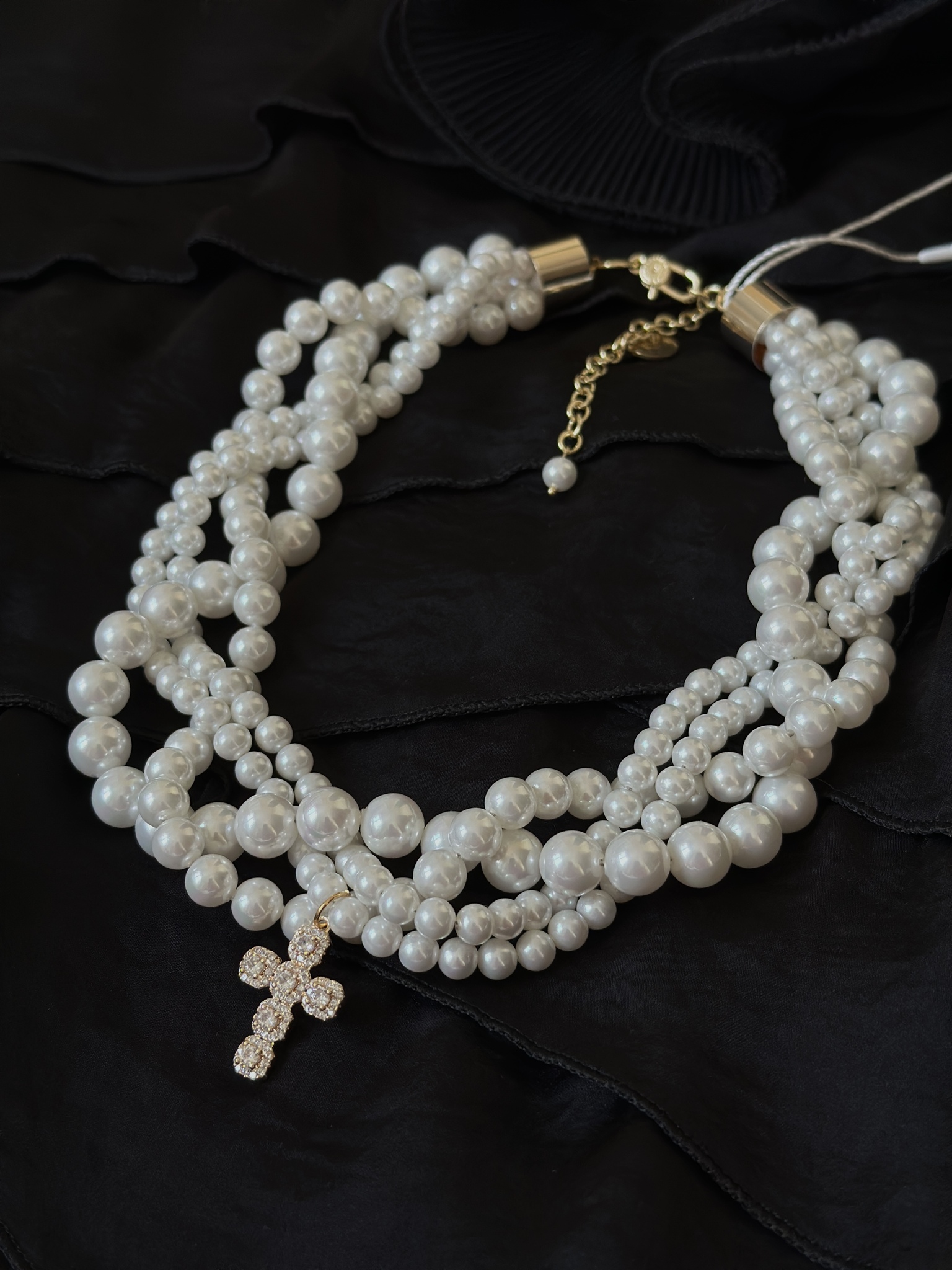Элегантное колье "ОДРИ" с переплетенными нитями жемчуга и декоративным крестом из цирконов в золотой ювелирной закрепке. Длина линии регулируется от 40 до 48 см, а размер креста составляет 2,5 х 1,5 см. Уникальный аксессуар для стильных и уверенных в себе женщин!